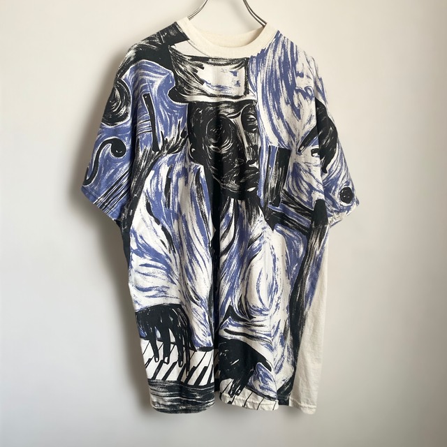 サイズ/XL相当 身幅59cm(脇下から10cm下の位置) 着丈71.5cm 裄丈46cm(襟中心から袖まで) 状態/多少の着用感はありますが、目立つ汚れやダメージのないgood condition 素材/コットン100 仕様/袖裾ダブルステッチ 1990年代頃〜のスペイン製「ANA JUAN」アートデザインオールオーバープリントtシャツになります。 ドルマンスリーブのゆったりとしたボディに、スペインのアーティスト「アナフアン」の作品がオーバープリントされた、モードでオシャレな一着。 ピアノを弾いたジャズマン?が描かれているのだと思いますが、彼女の作品らしいどこかゴシックで重厚感のある雰囲気が素晴らしいです。 普段デザイナーズをよく着られる方にもおすすめいたします。 非常に珍しい一着ですので、ピンときた方は是非いかがでしょうか?