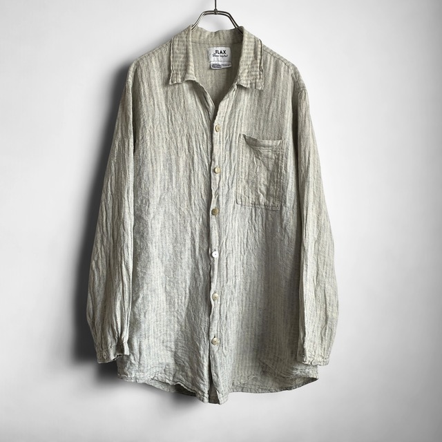 サイズ/SですがXL相当 肩幅52cm 身幅61cm 袖丈60cm 着丈84cm 状態/多少の着用感、トップボタンが欠損しておりますが、目立つ汚れやダメージのないgood condition 〜1990年代頃の「フラックス」オープンカラーシャツになります。 古着好きには昔からかなり評価されている、リトアニアリネンを使用したデザイナーズブランドの一着。 くすんだミントグリーン〜ベージュ系の絶妙な色目に、風合いの素晴らしい織ストライプ、イギリスワークのチェンジボタンのようなデザインの雰囲気の良いベークライトボタン、ゆったりとしたシルエットが大変に素晴らしいです。 メンズ物は結構珍しいので、お探しだった方は是非いかがでしょうか?