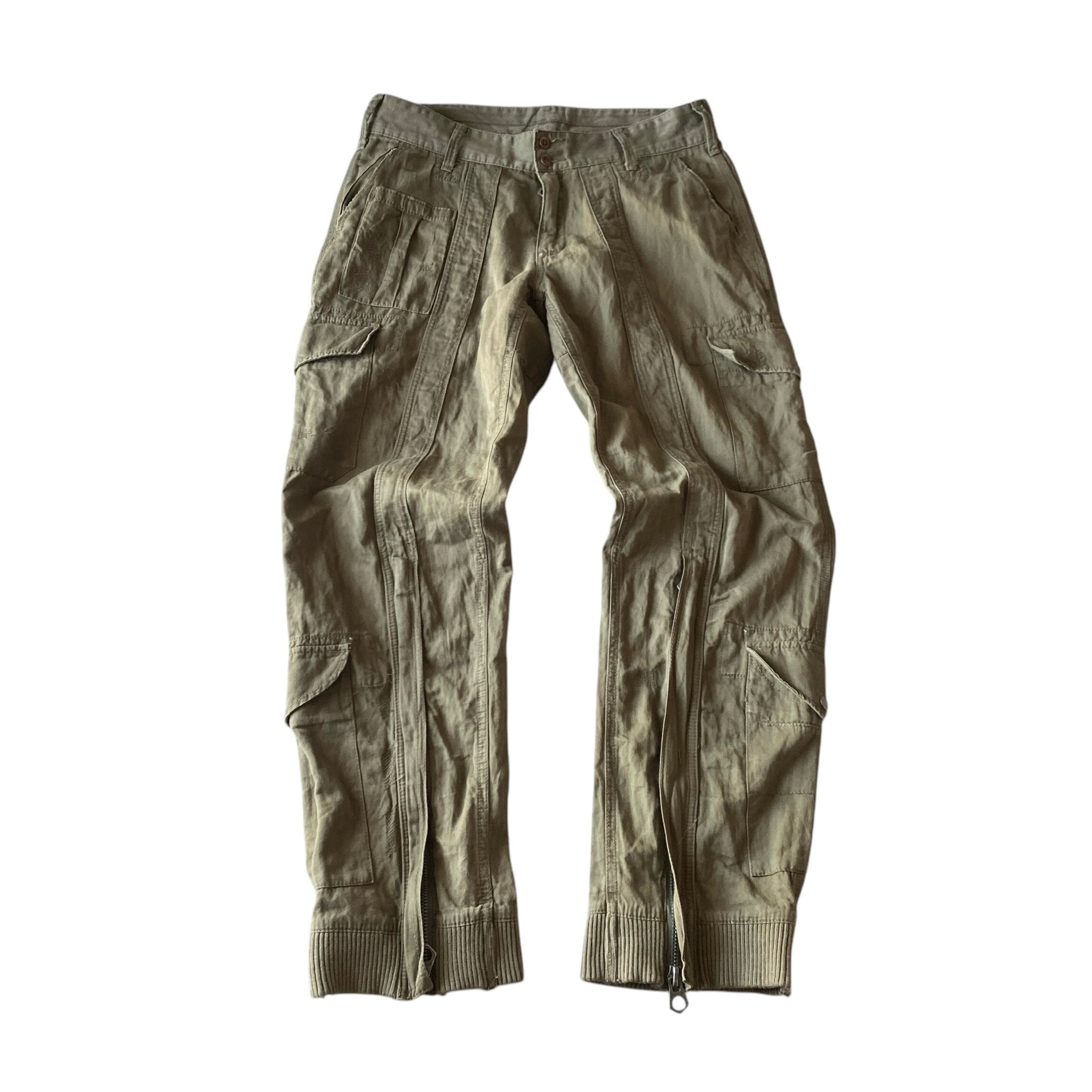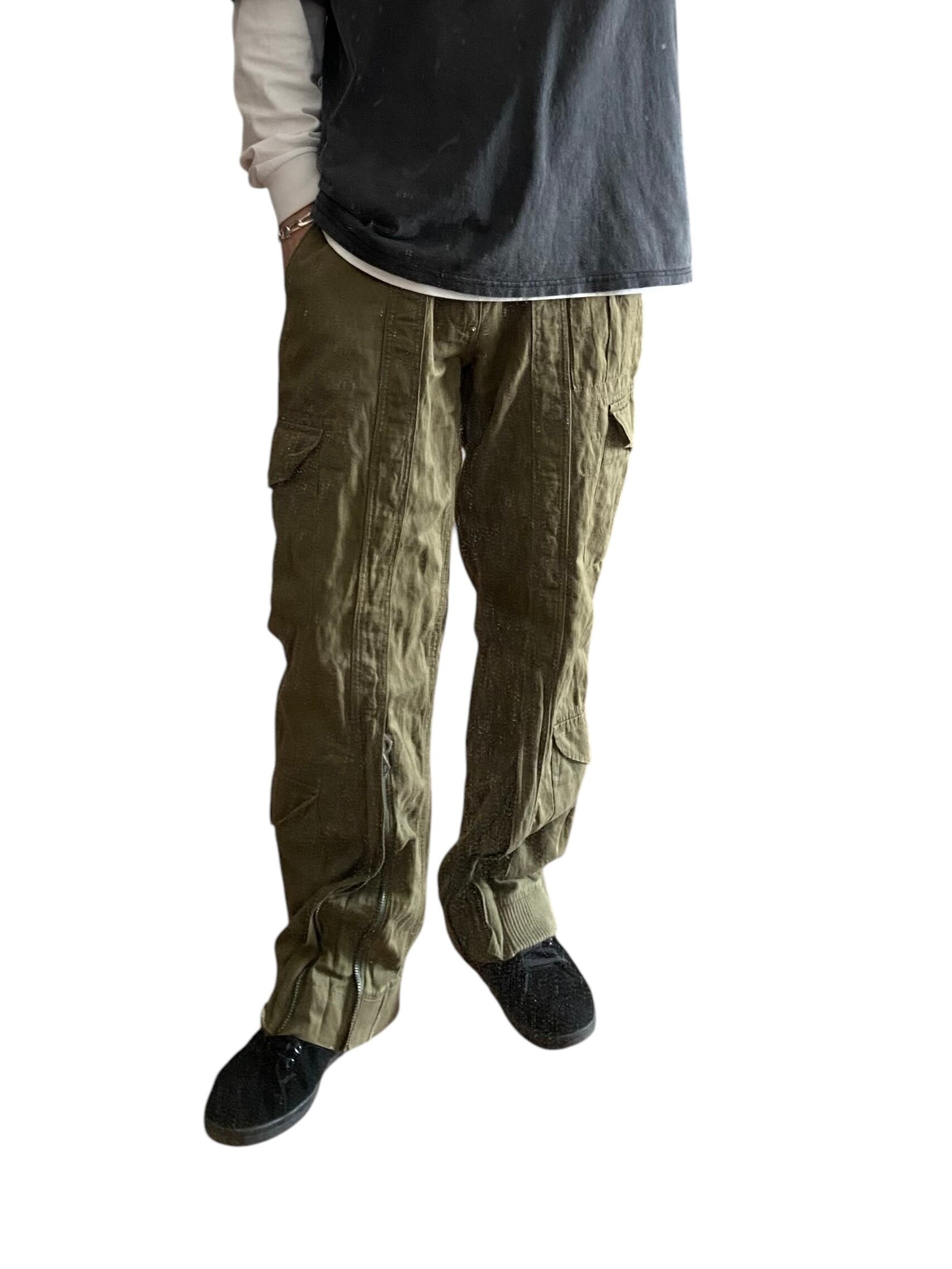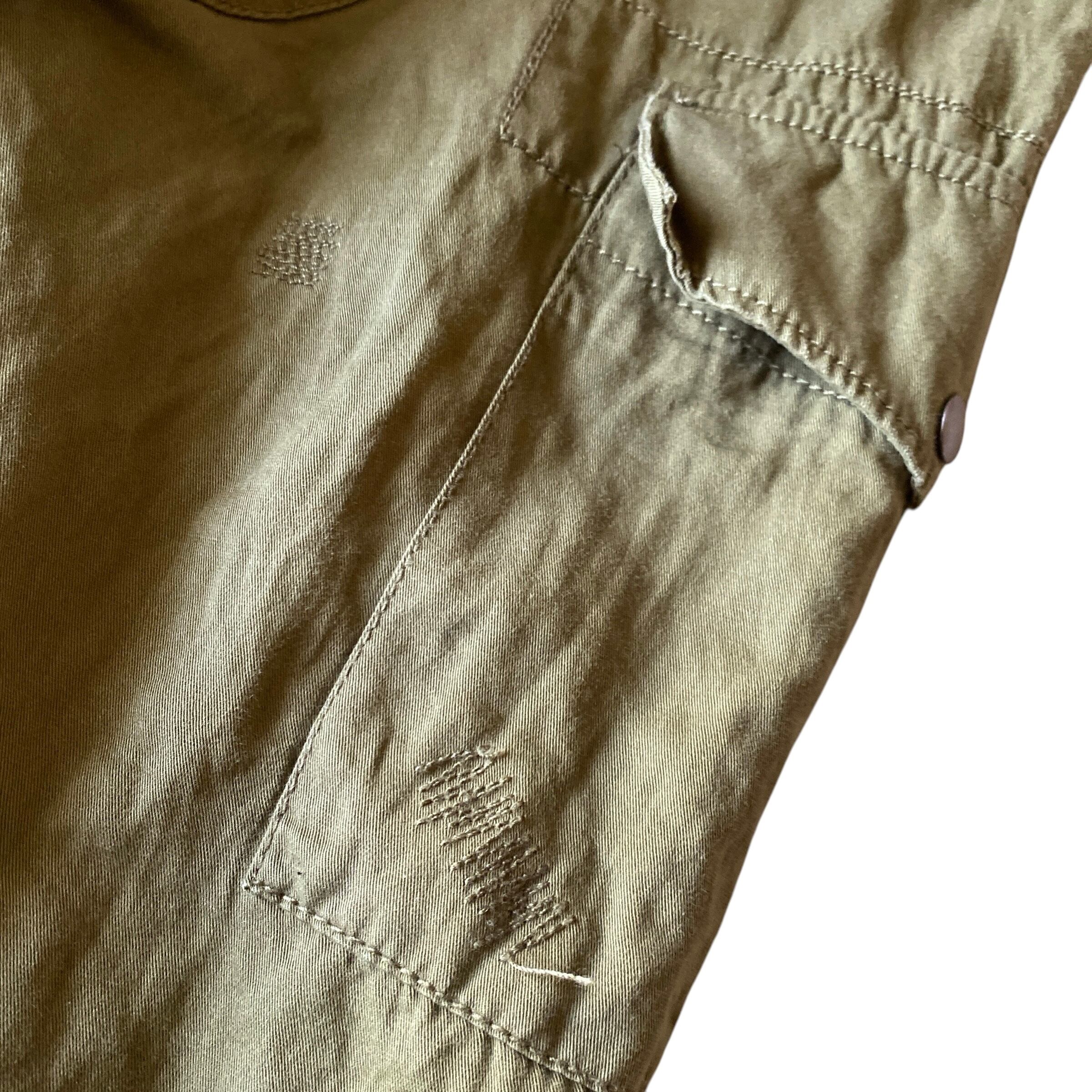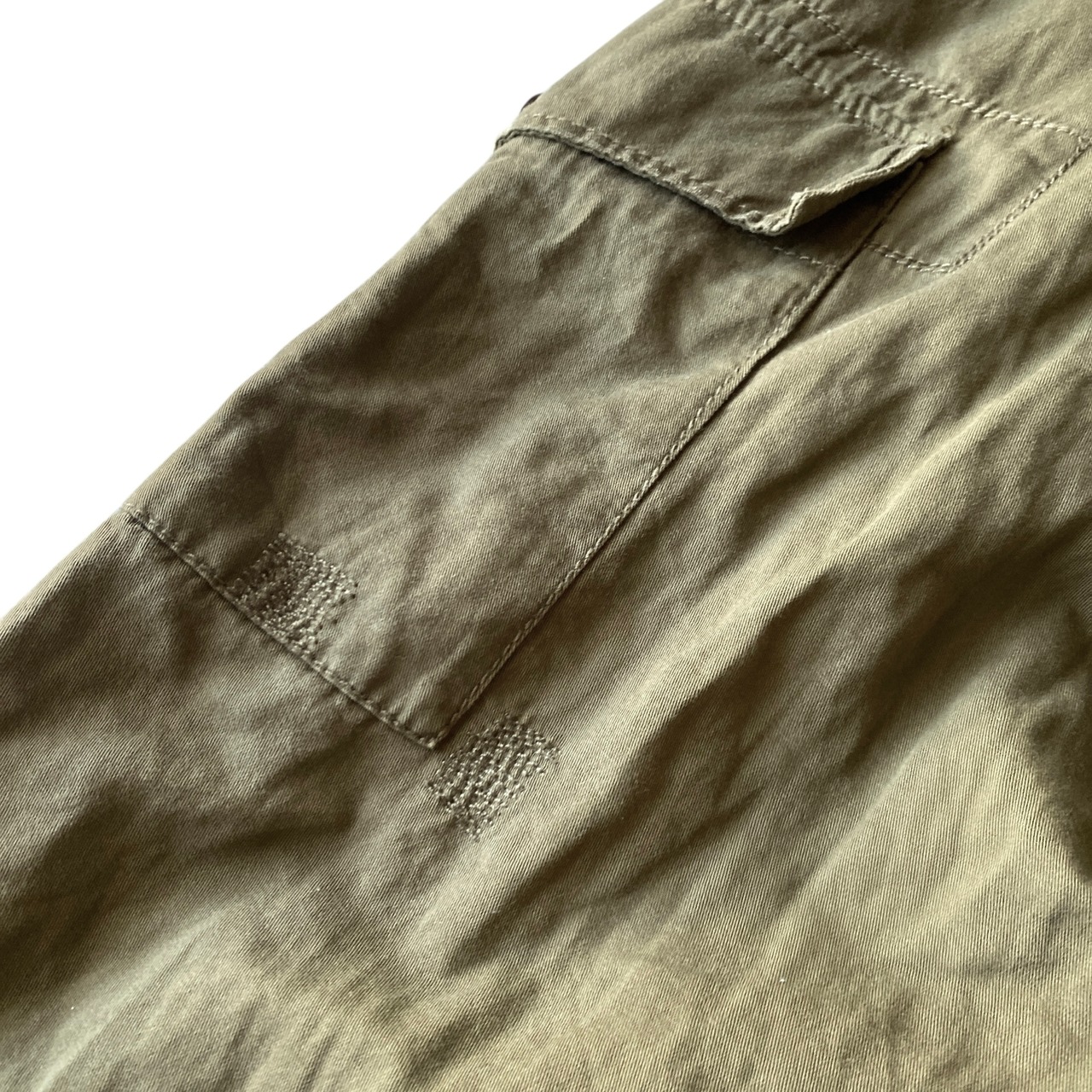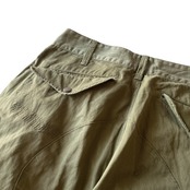 メタル混のコットン生地、ヴィンテージモチーフのデカアルミジッパー、多数のリペアデザイン、やりすぎ9ポケット、おそらくフランス軍のM-47から引用されたであろう2トップボタンにヘリンボーン生地の切り替え(まさかのウエスト部分のみ)など、こだわりというこだわりが随所に感じられます。