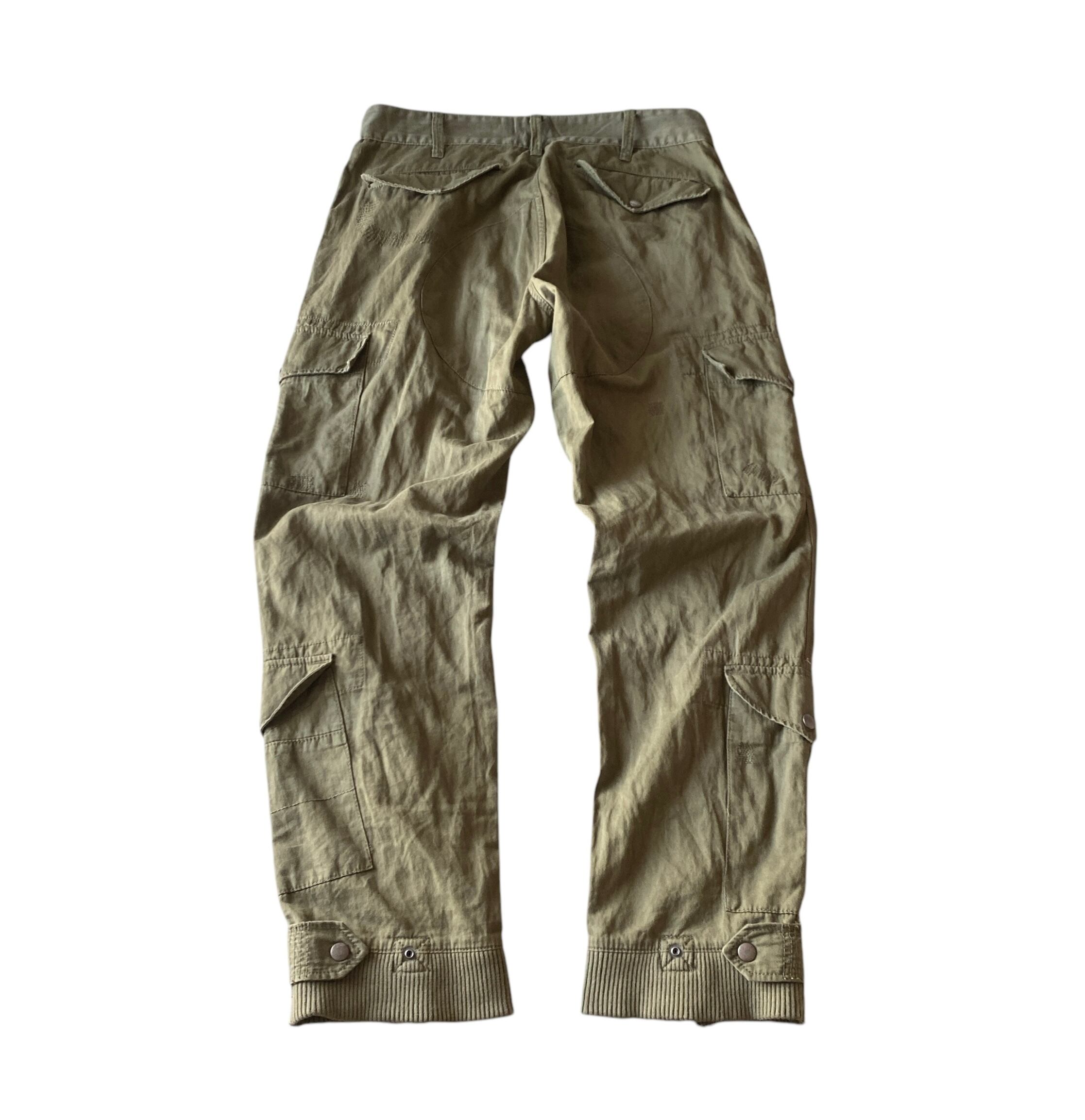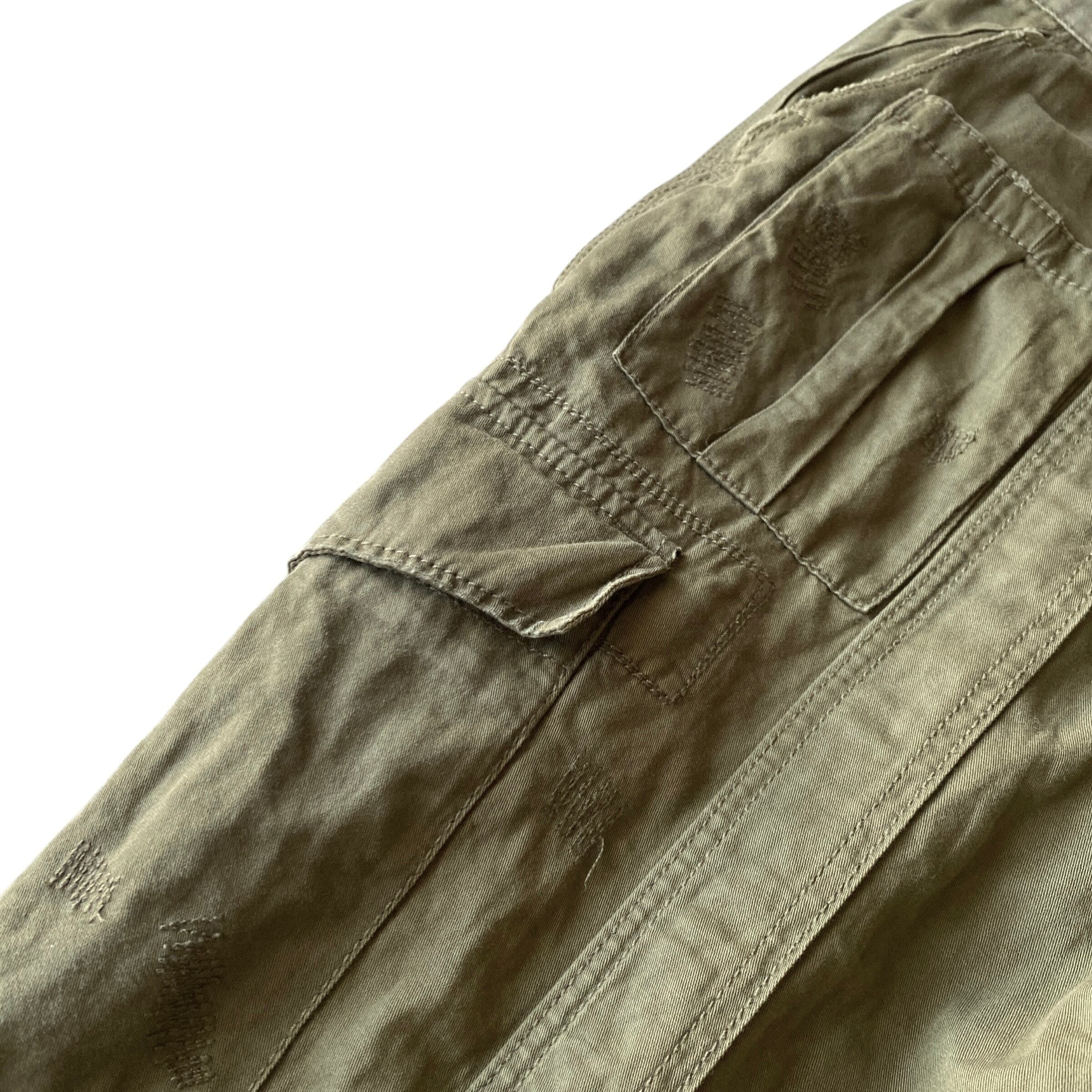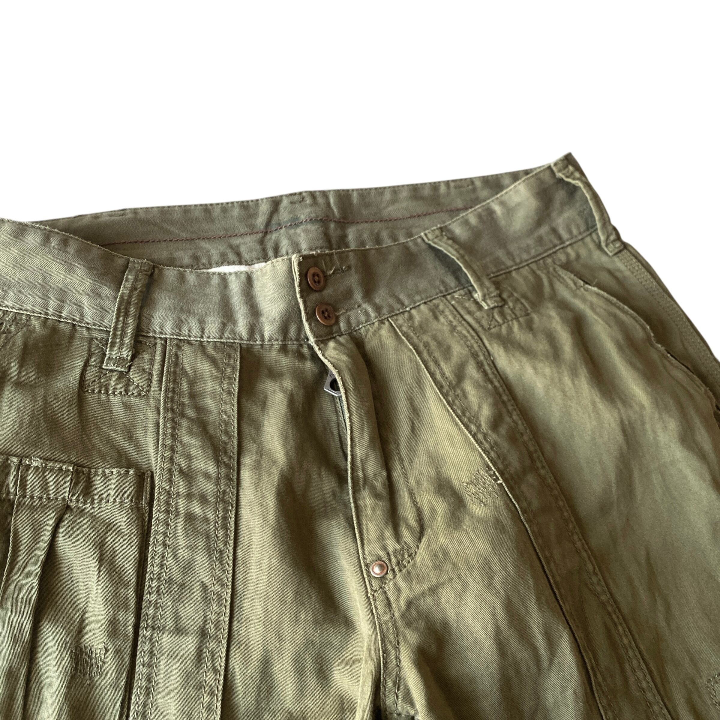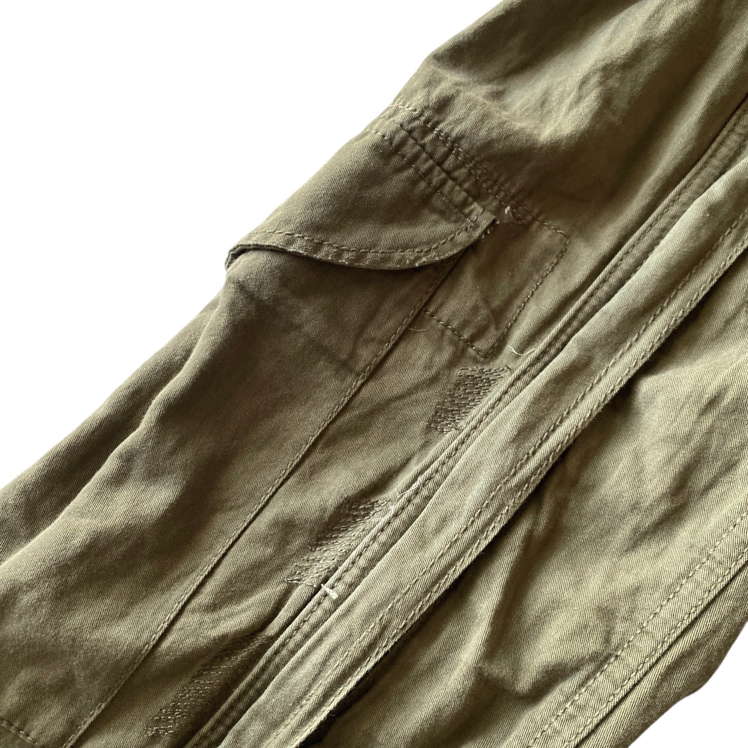 メタル混のコットン生地、ヴィンテージモチーフのデカアルミジッパー、多数のリペアデザイン、やりすぎ9ポケット、おそらくフランス軍のM-47から引用されたであろう2トップボタンにヘリンボーン生地の切り替え(まさかのウエスト部分のみ)など、こだわりというこだわりが随所に感じられます。