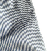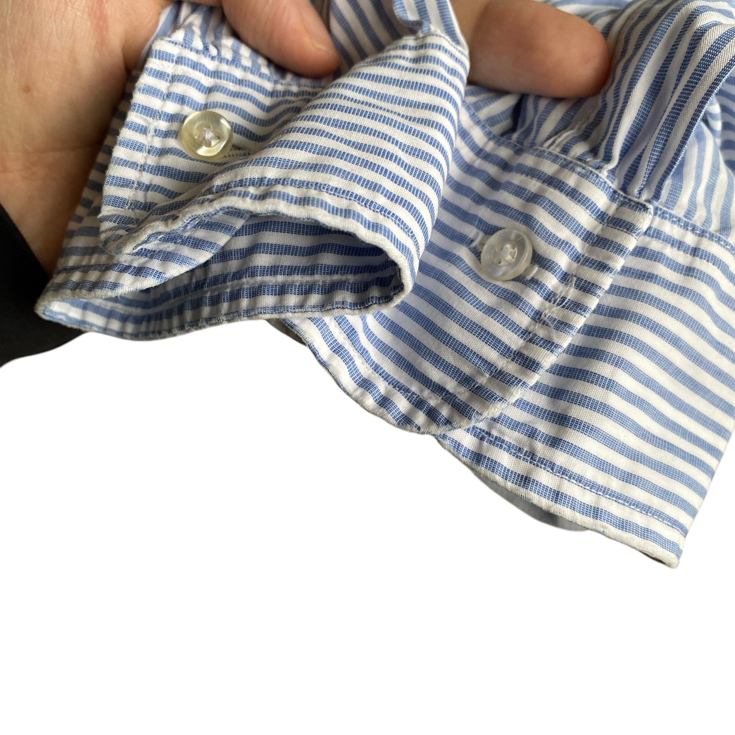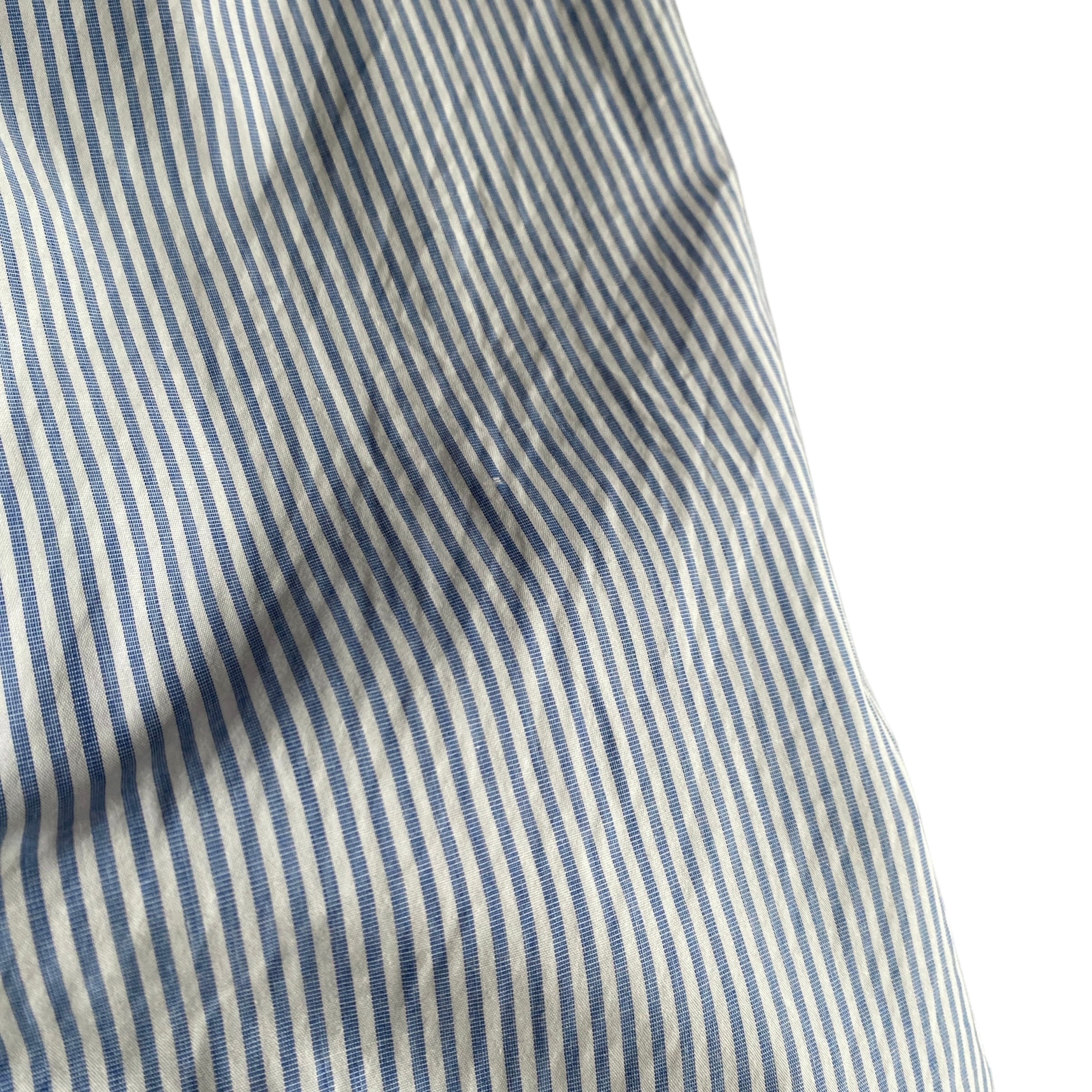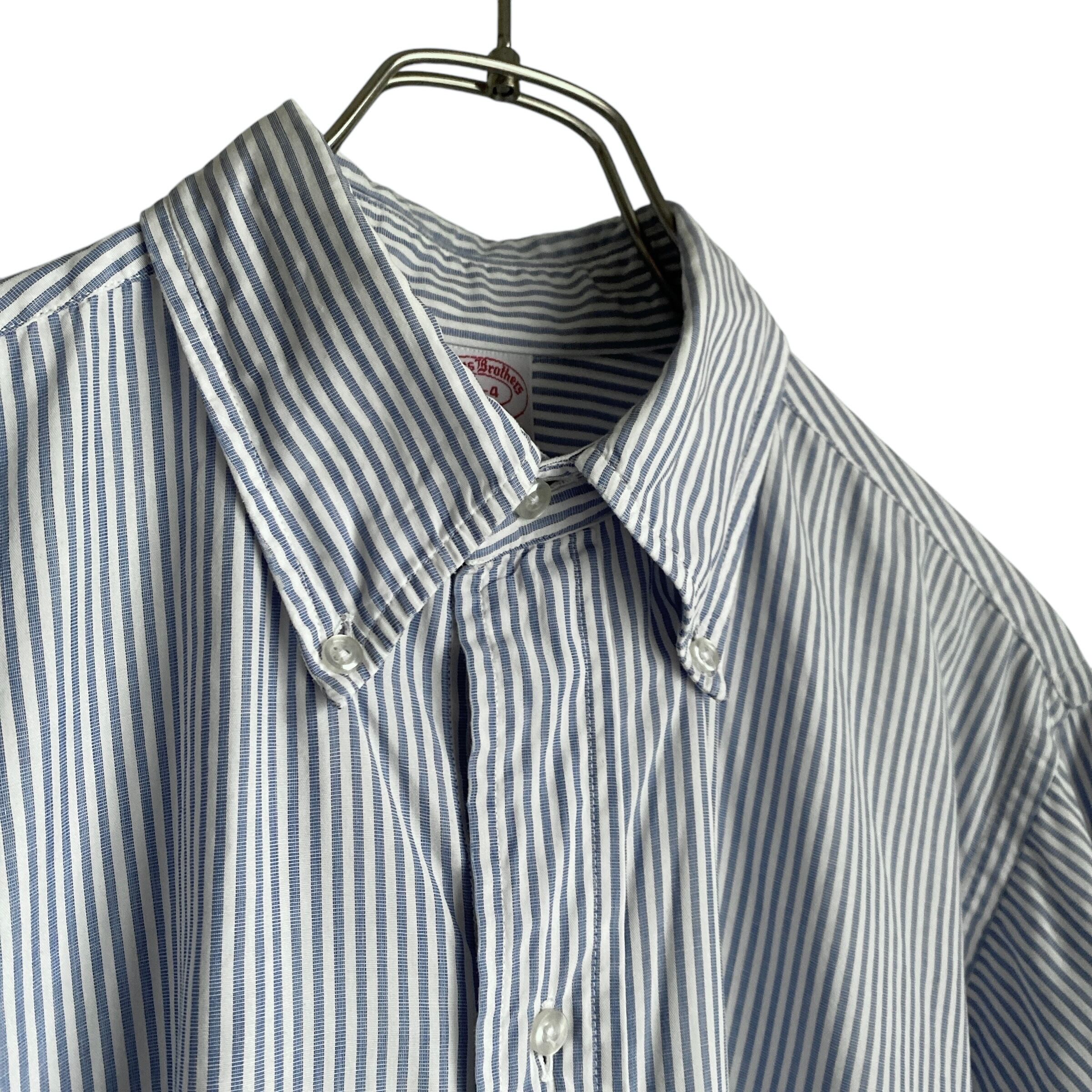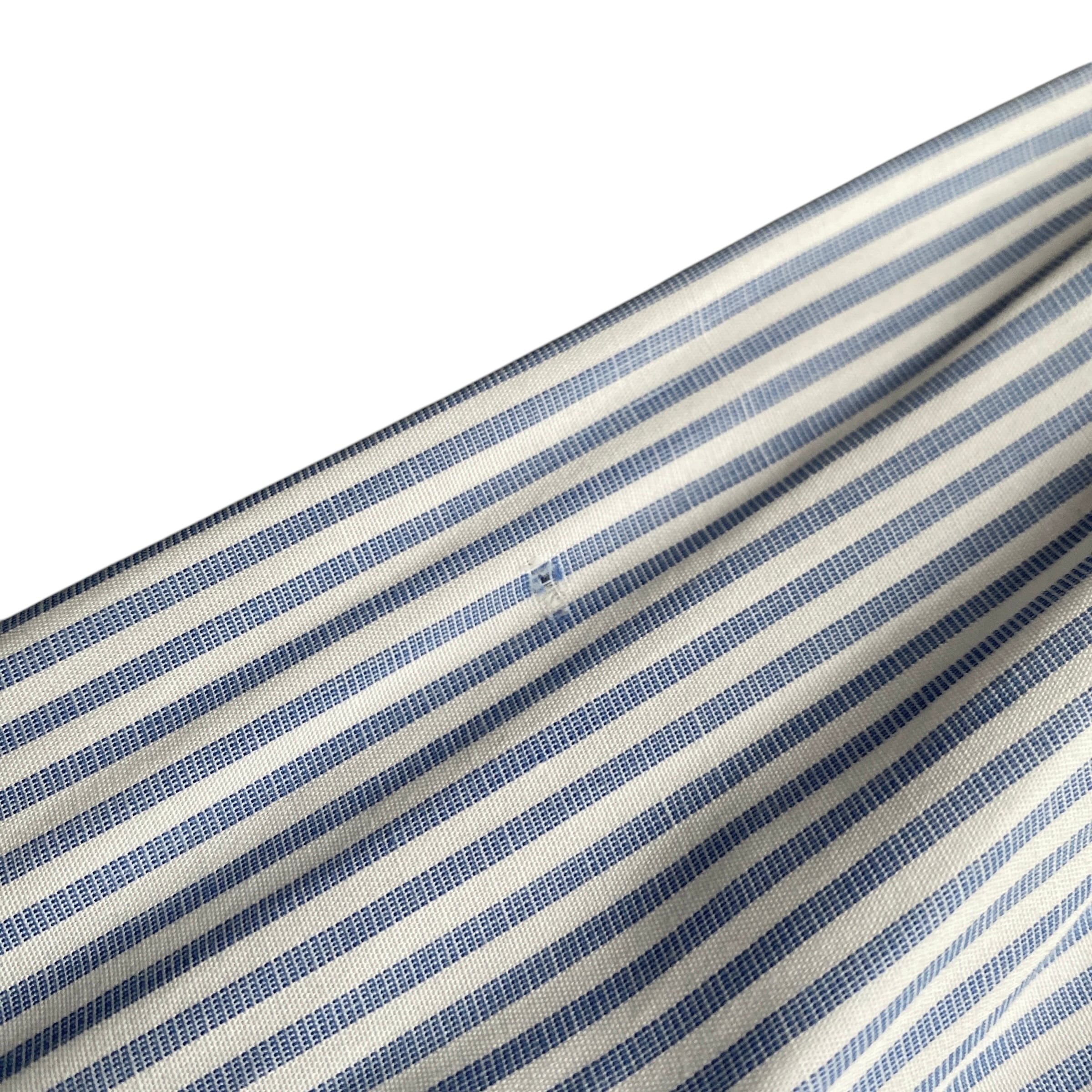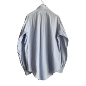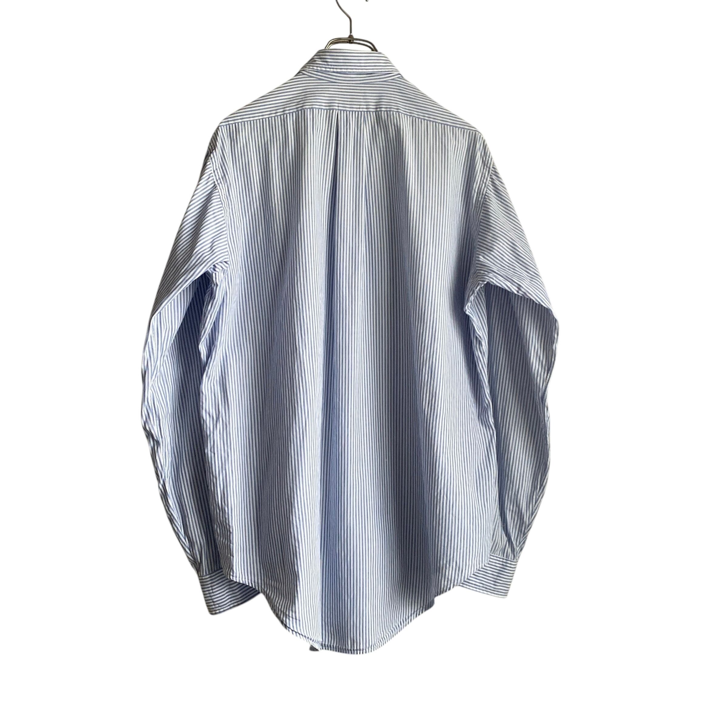 コットン100の上質なピンオックスフォード生地に、暗めのサックスブルーとホワイトの美しいストライプパターン、この年代特有の襟型、深めにラウンドカットされたシルエットが非常に格好良い一着。