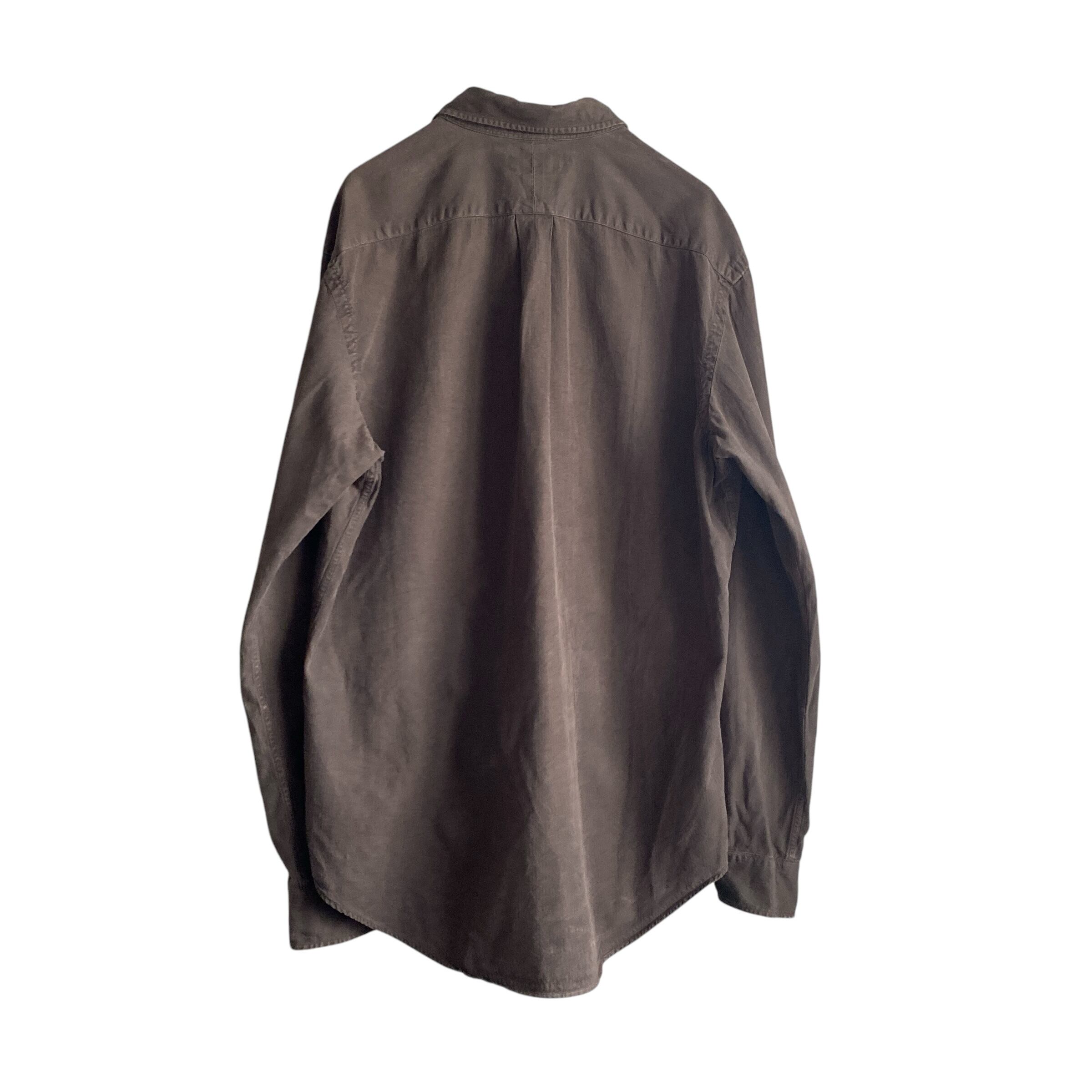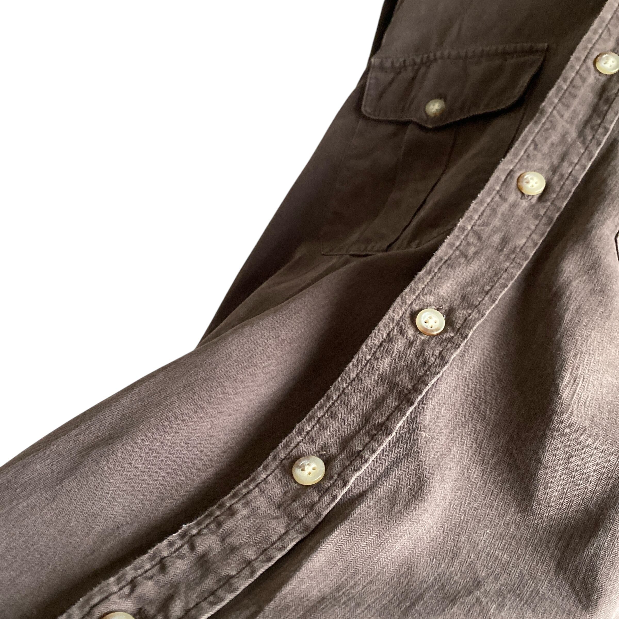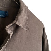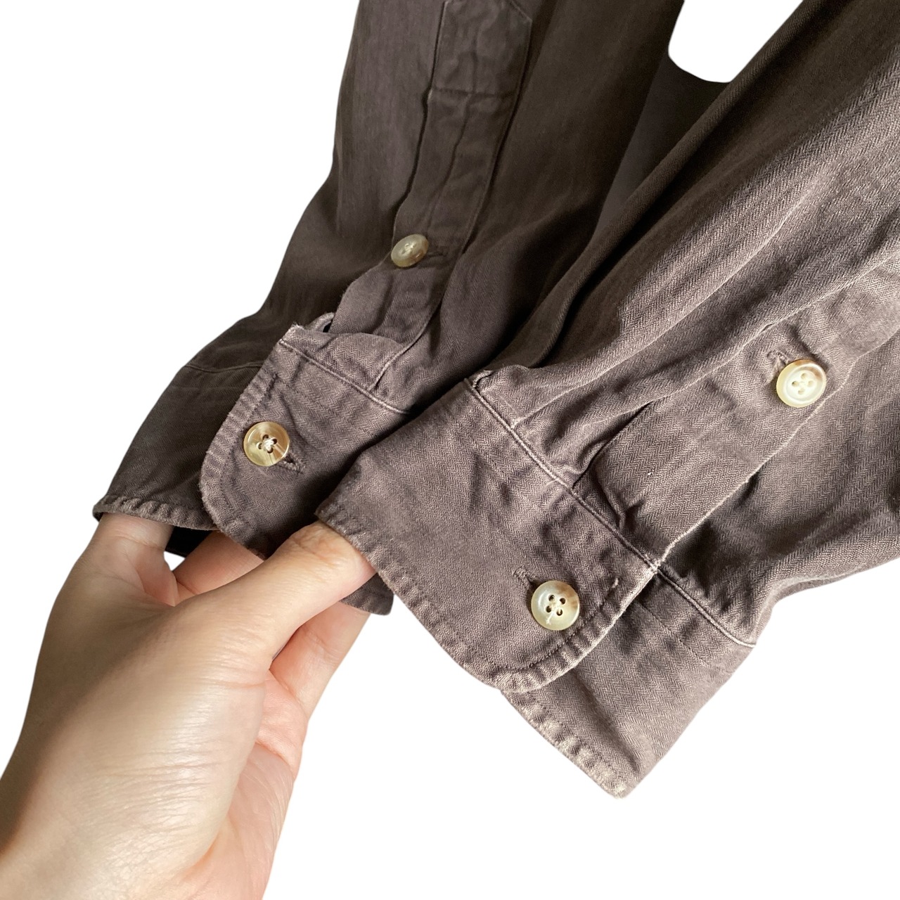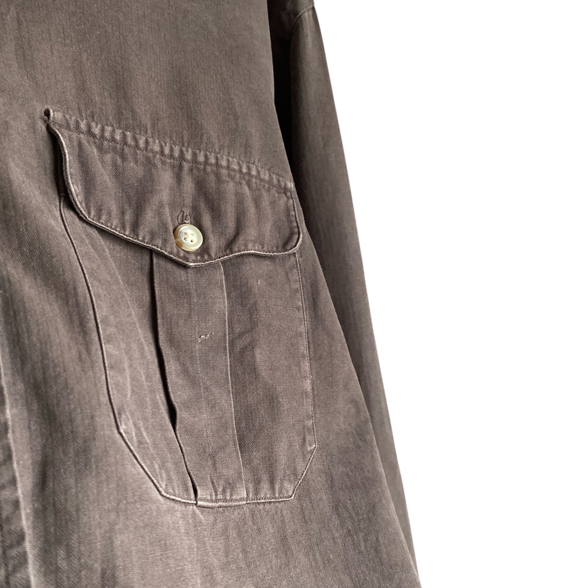 非常に風合いの良いシルクコットンのヘリンボーン生地に、スモーキーな後染めブラウンカラー、程よくルーズなシルエットが大変素晴らしい一着。