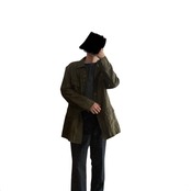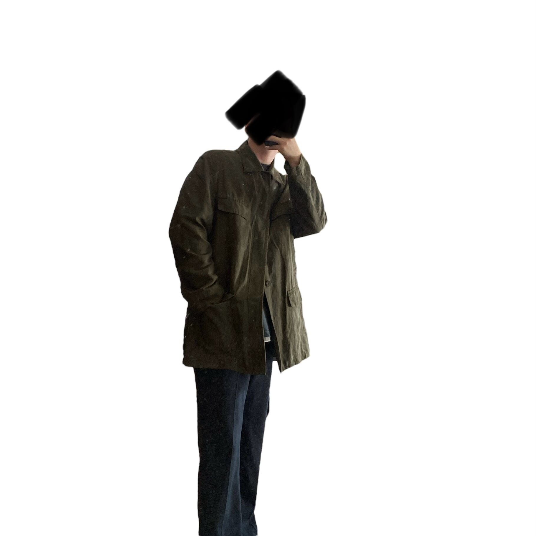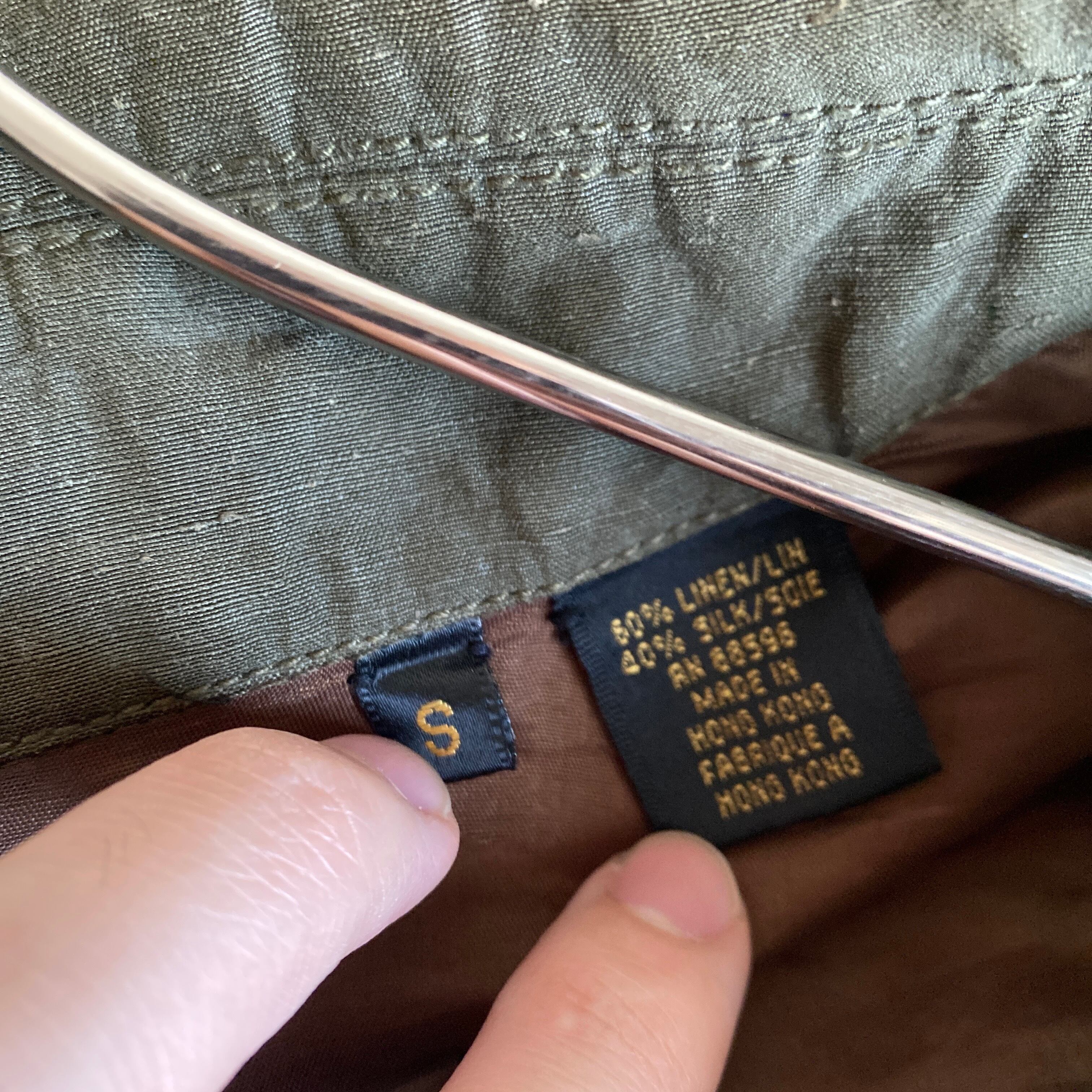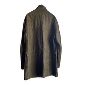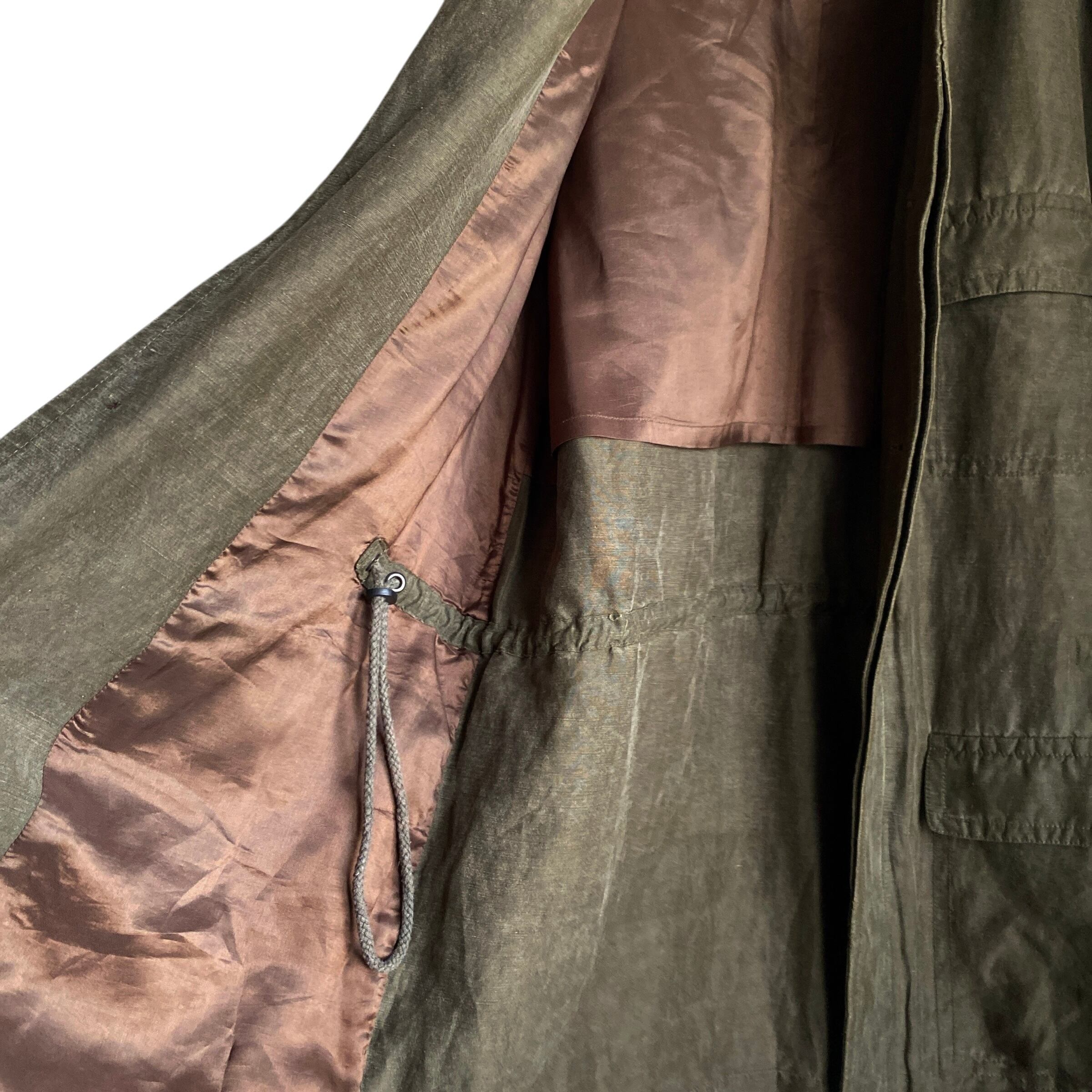 シルクリネン特有の鈍い光沢感にプルッとした生地のドレープ感、後染めダークオリーブの渋いカラーリングが素晴らしい一着。