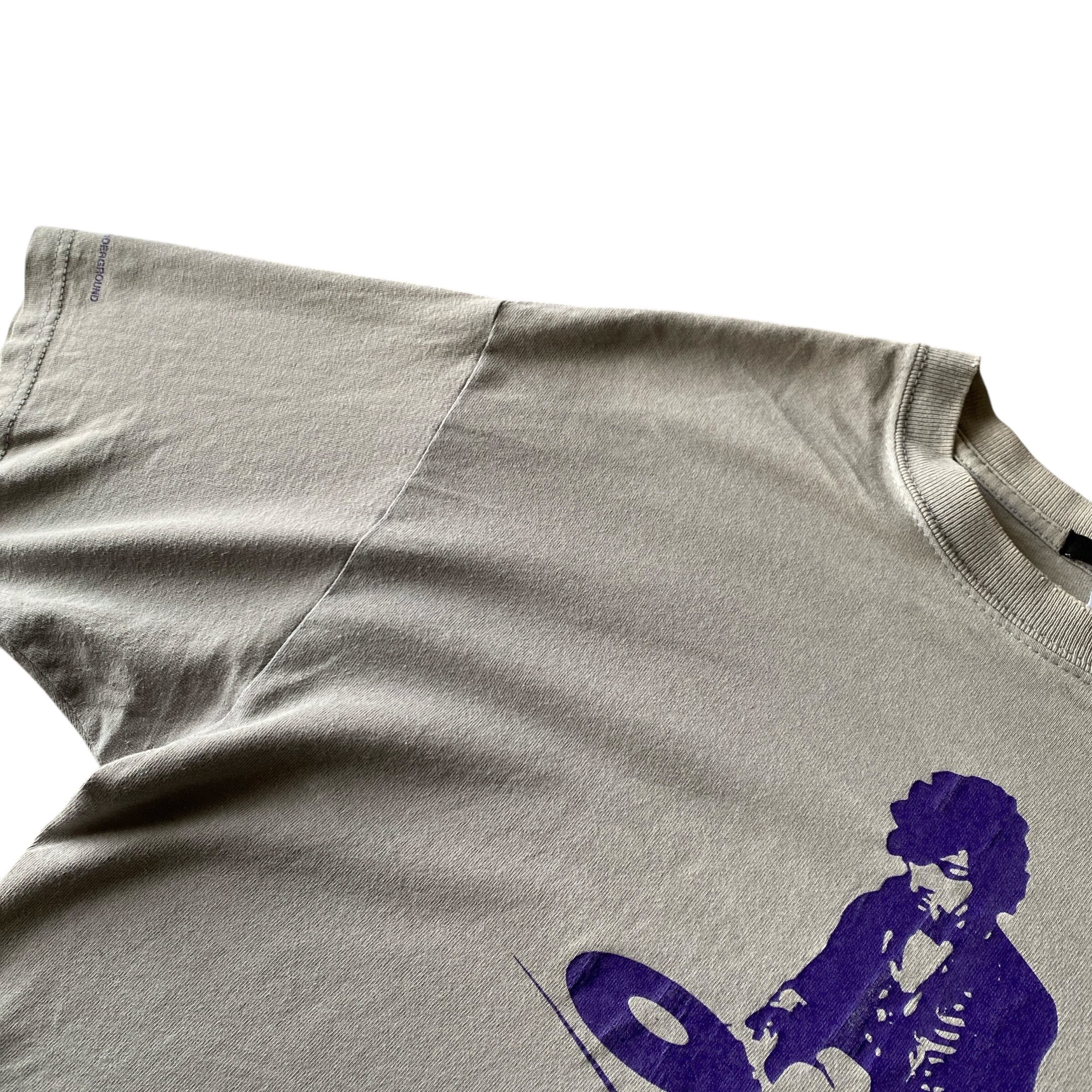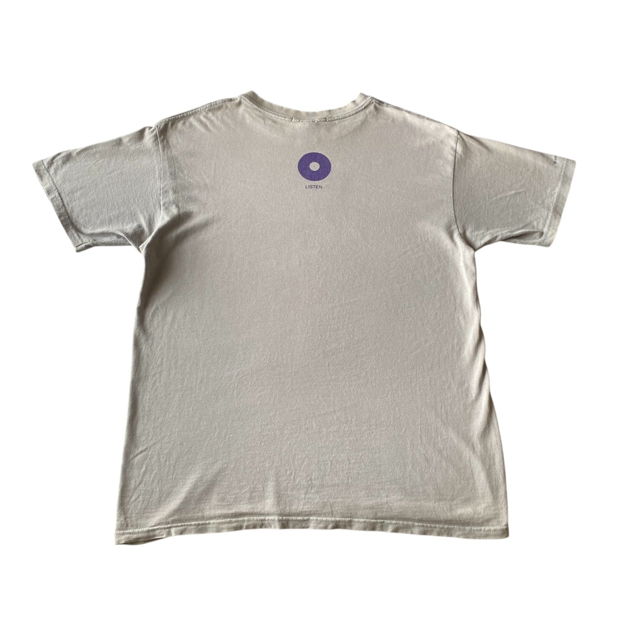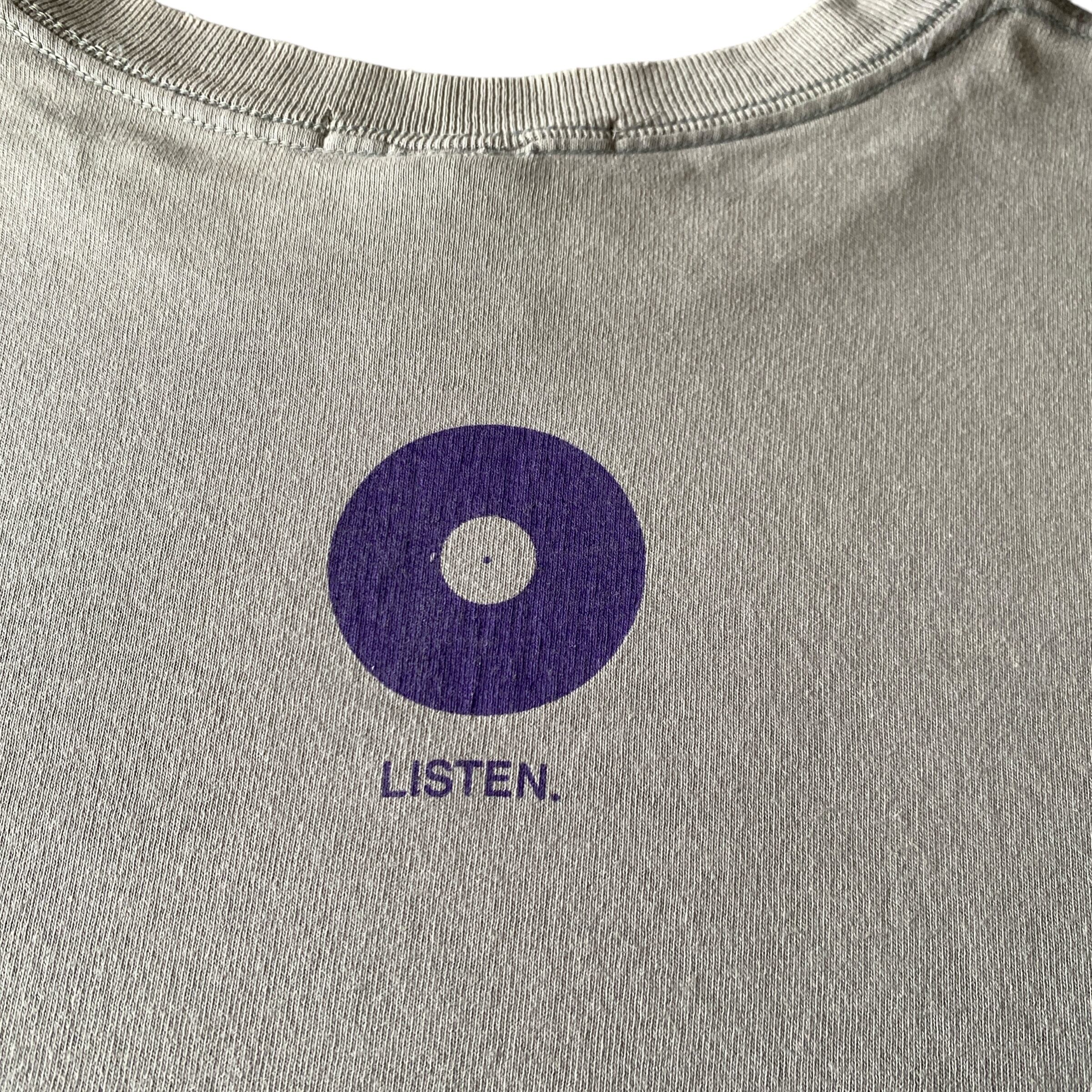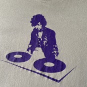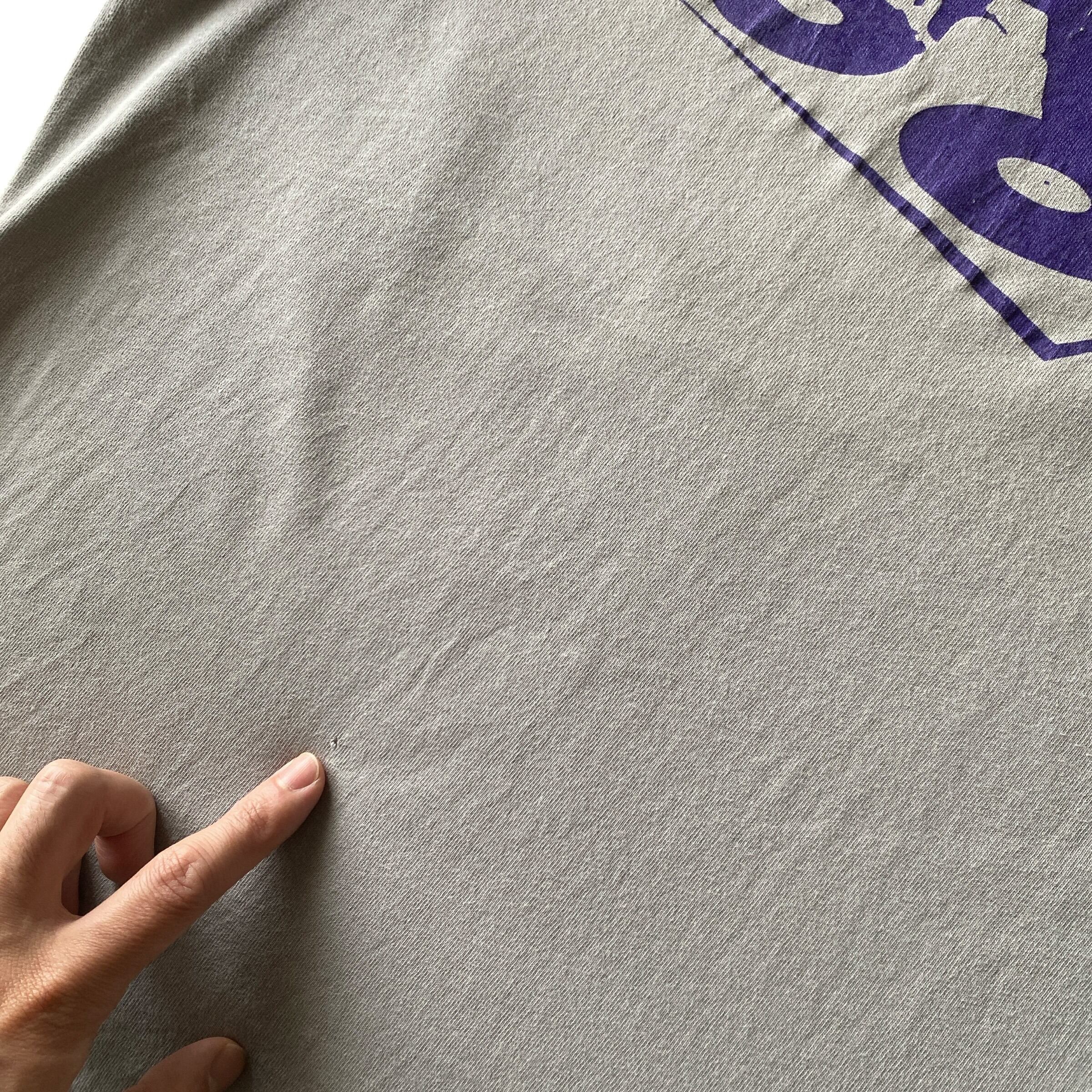 フェードしたグレーベージュ系のボディに、パープルのプリントが非常に格好良い一着。
