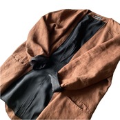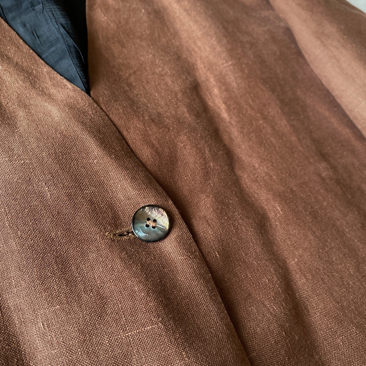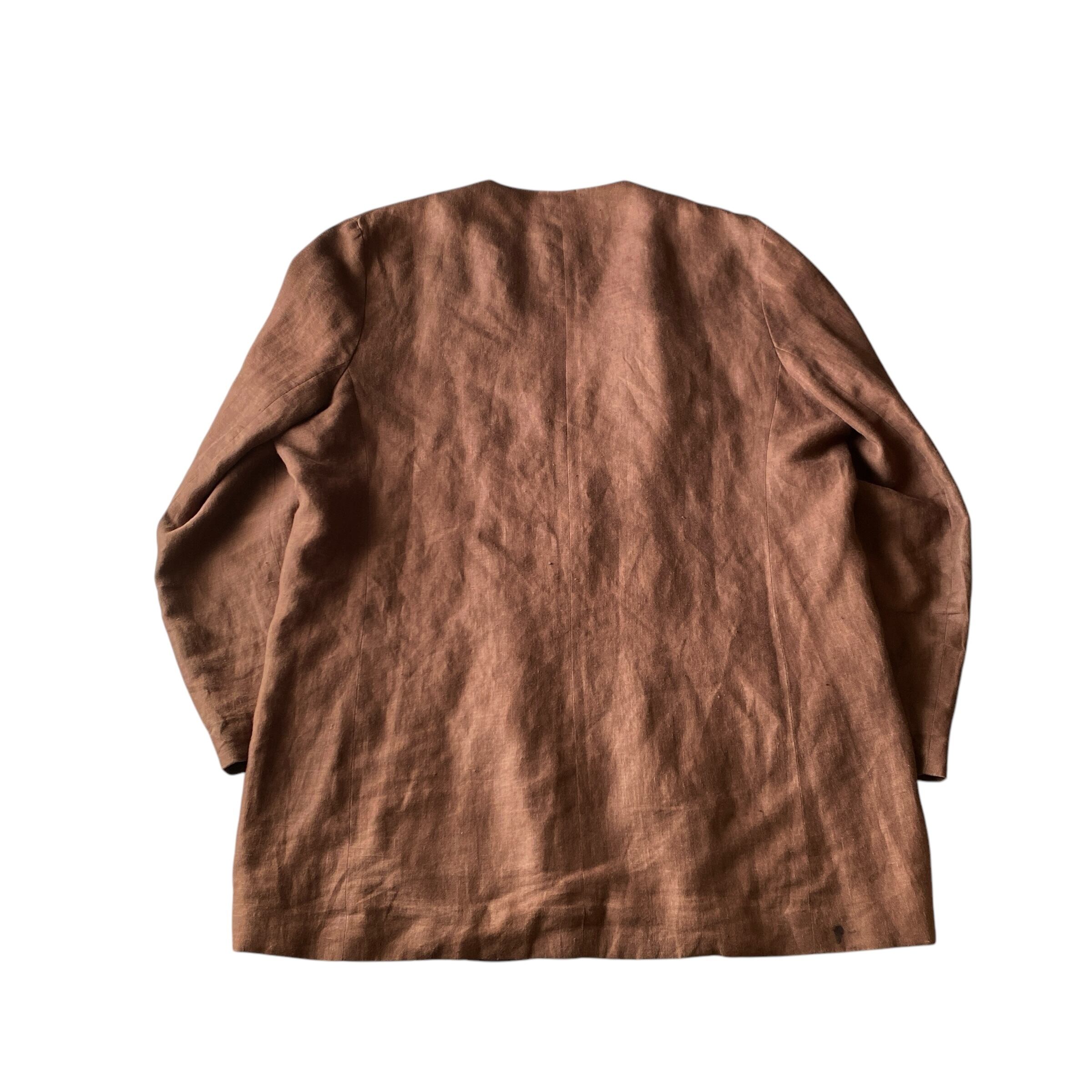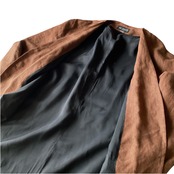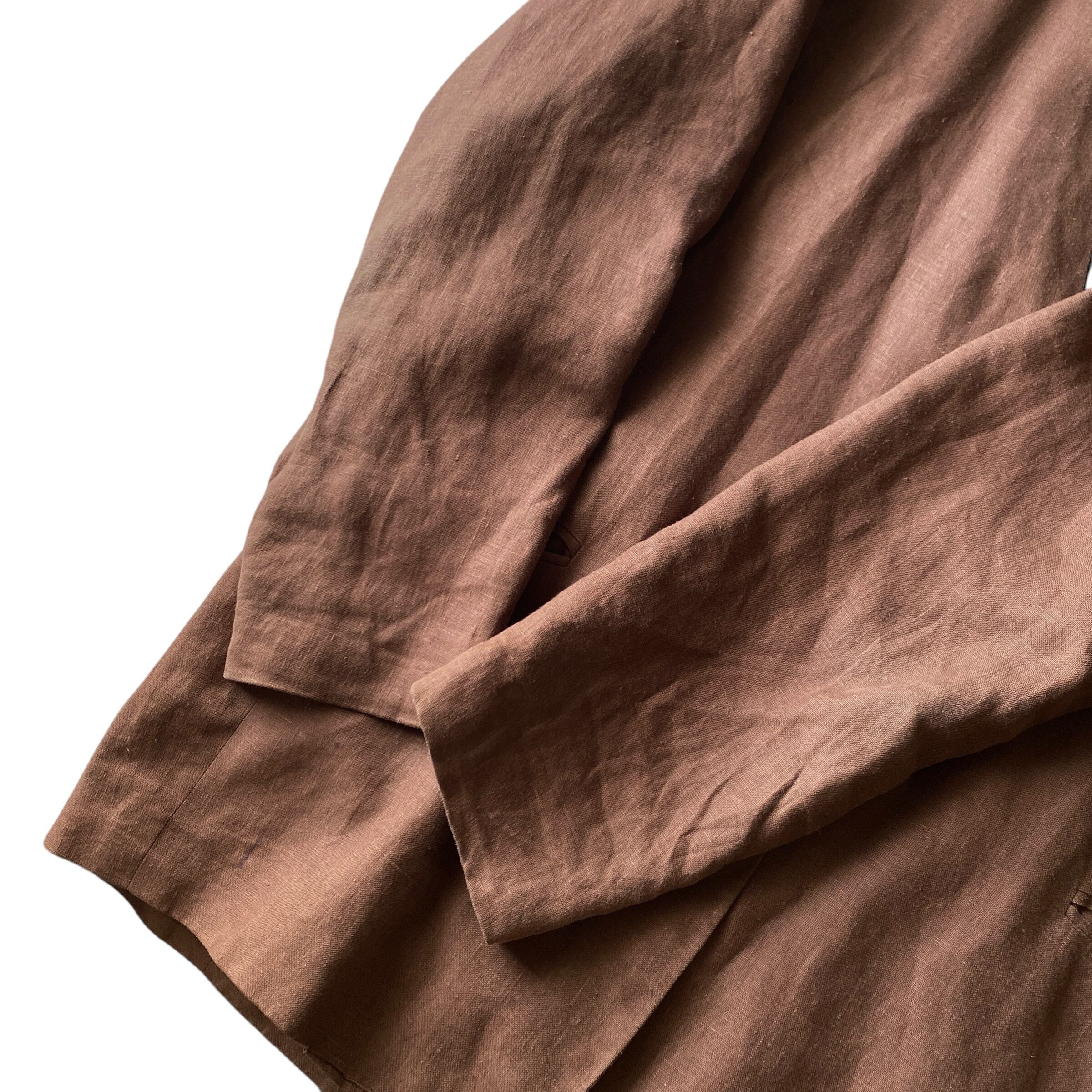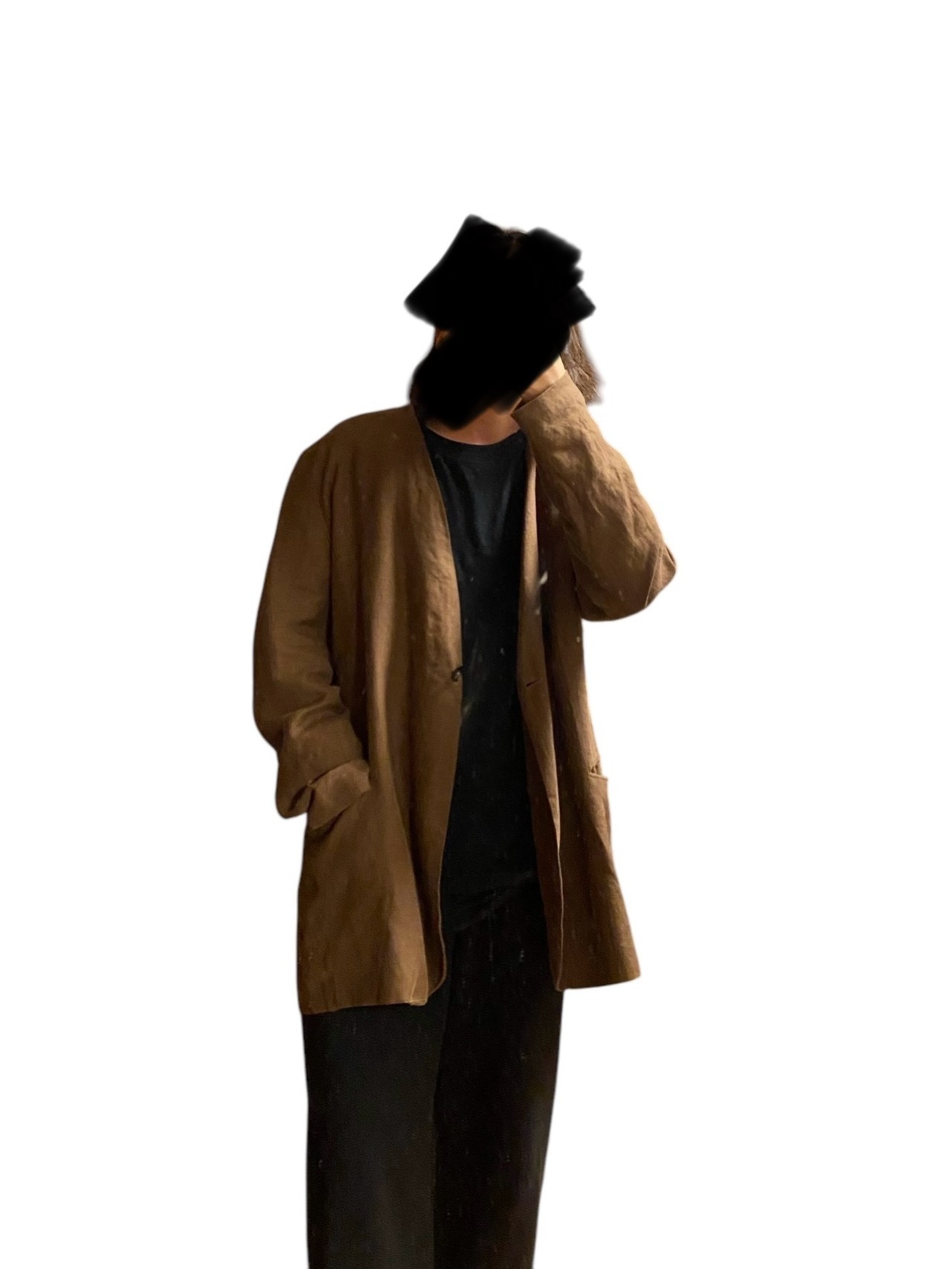 肉厚でプルンとしたドレープ感のある上質なヘビーリネン素材に、ストンと落ちるオーバーサイズで丈長めのシルエット、ノーカラーでミニマルなデザイン、くすんだブラウンカラーが非常に格好良い一着。