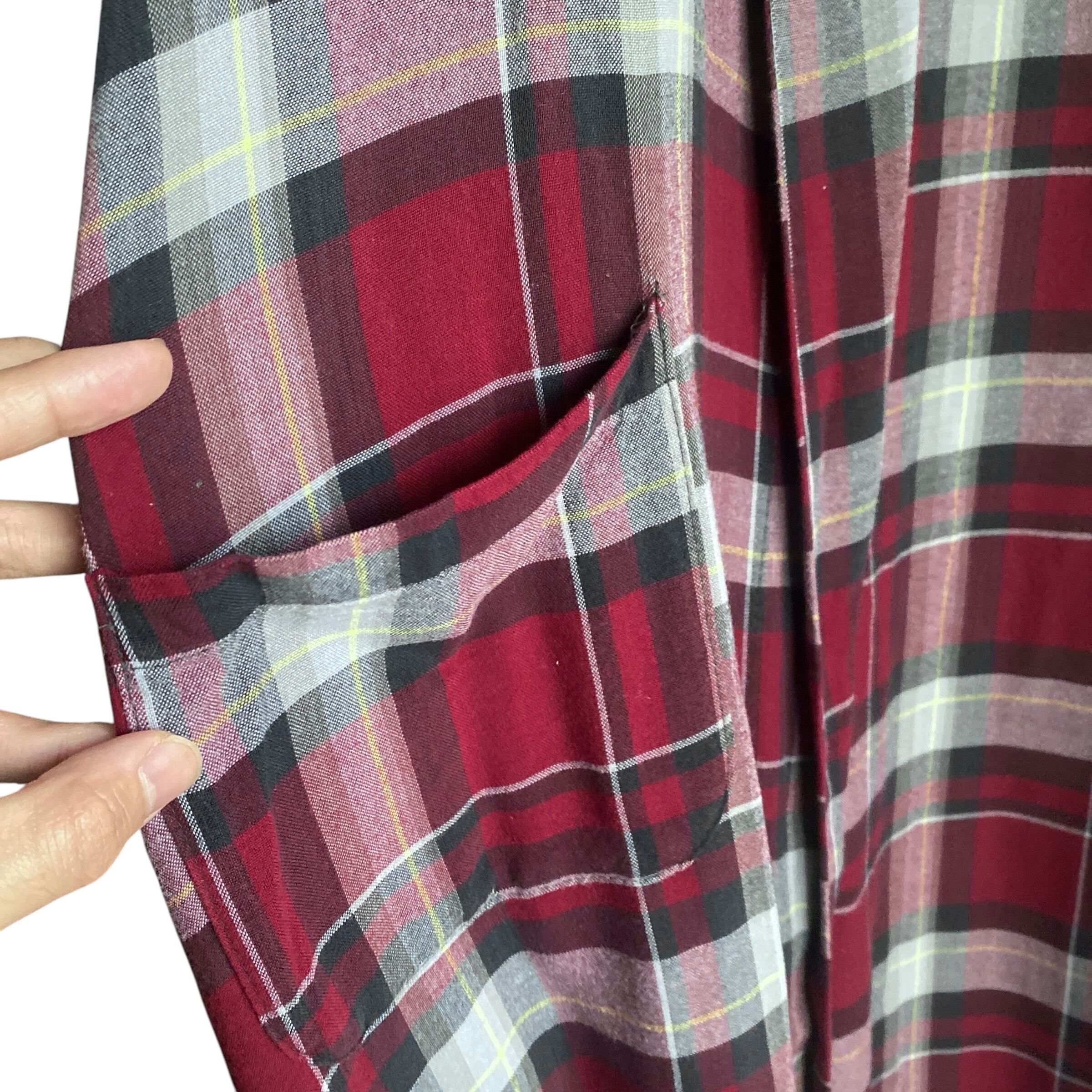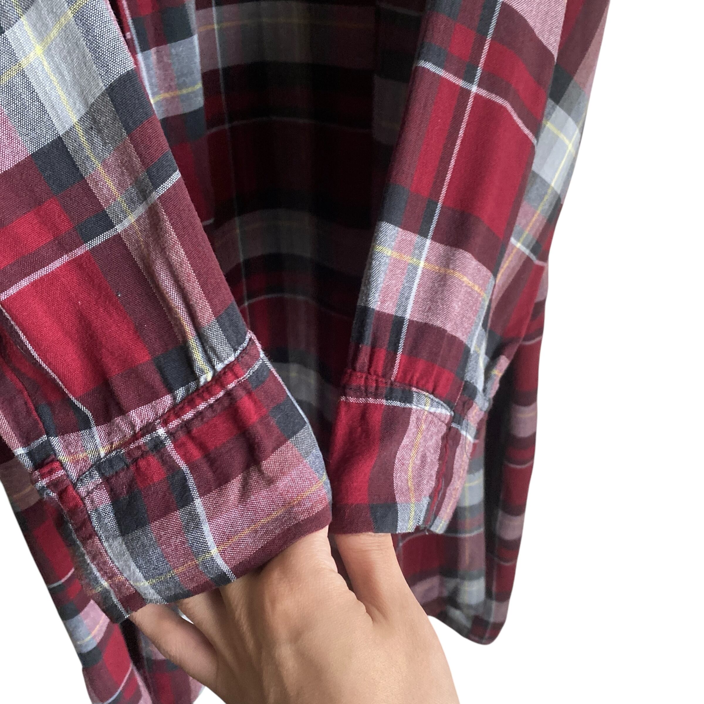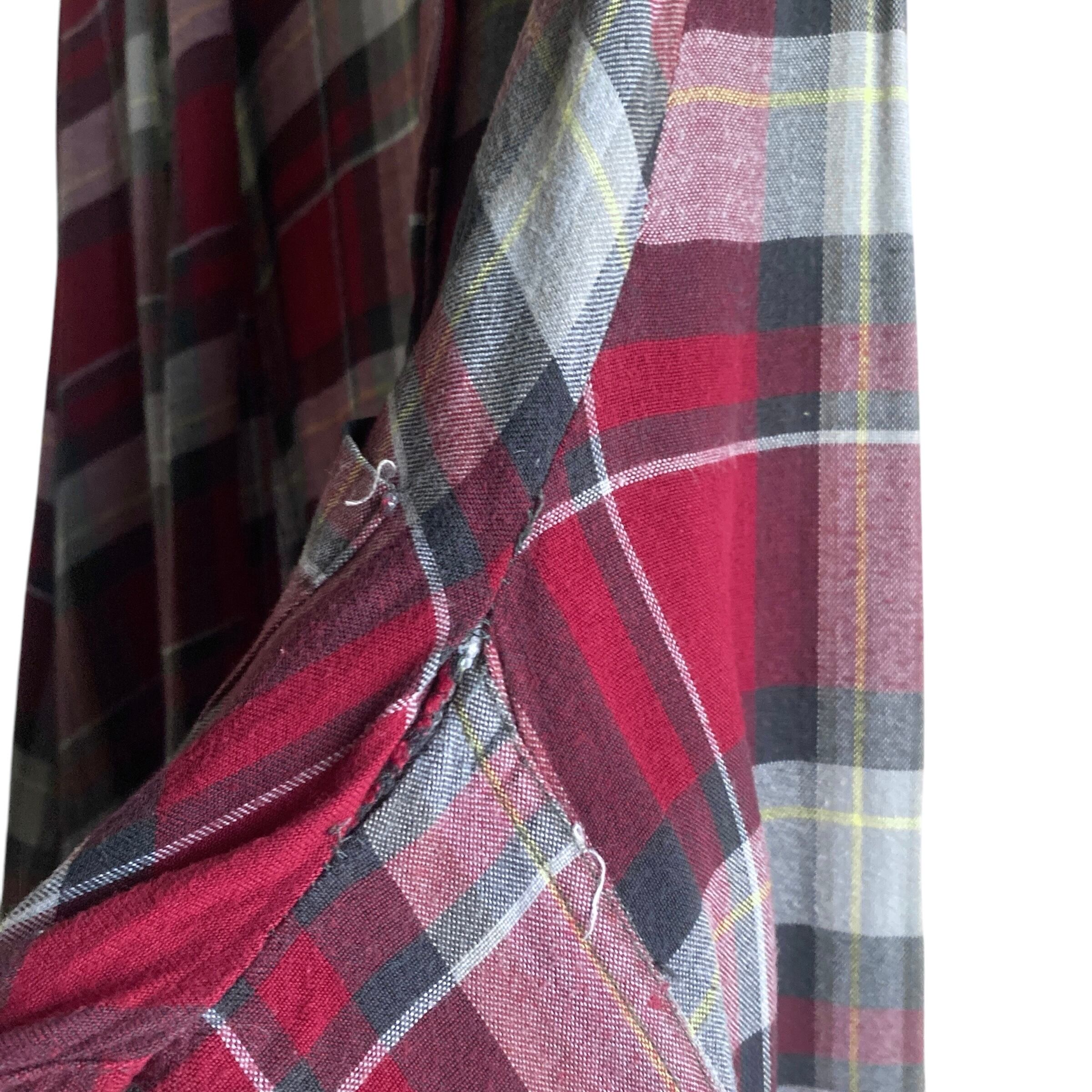 肉厚で落ち感のあるレーヨン生地に、やや暗めでくすみ感のあるレッドをベースにした配色、動くたびにドレープを感じることのできるゆったりとしたシルエットが非常に格好良い一着。