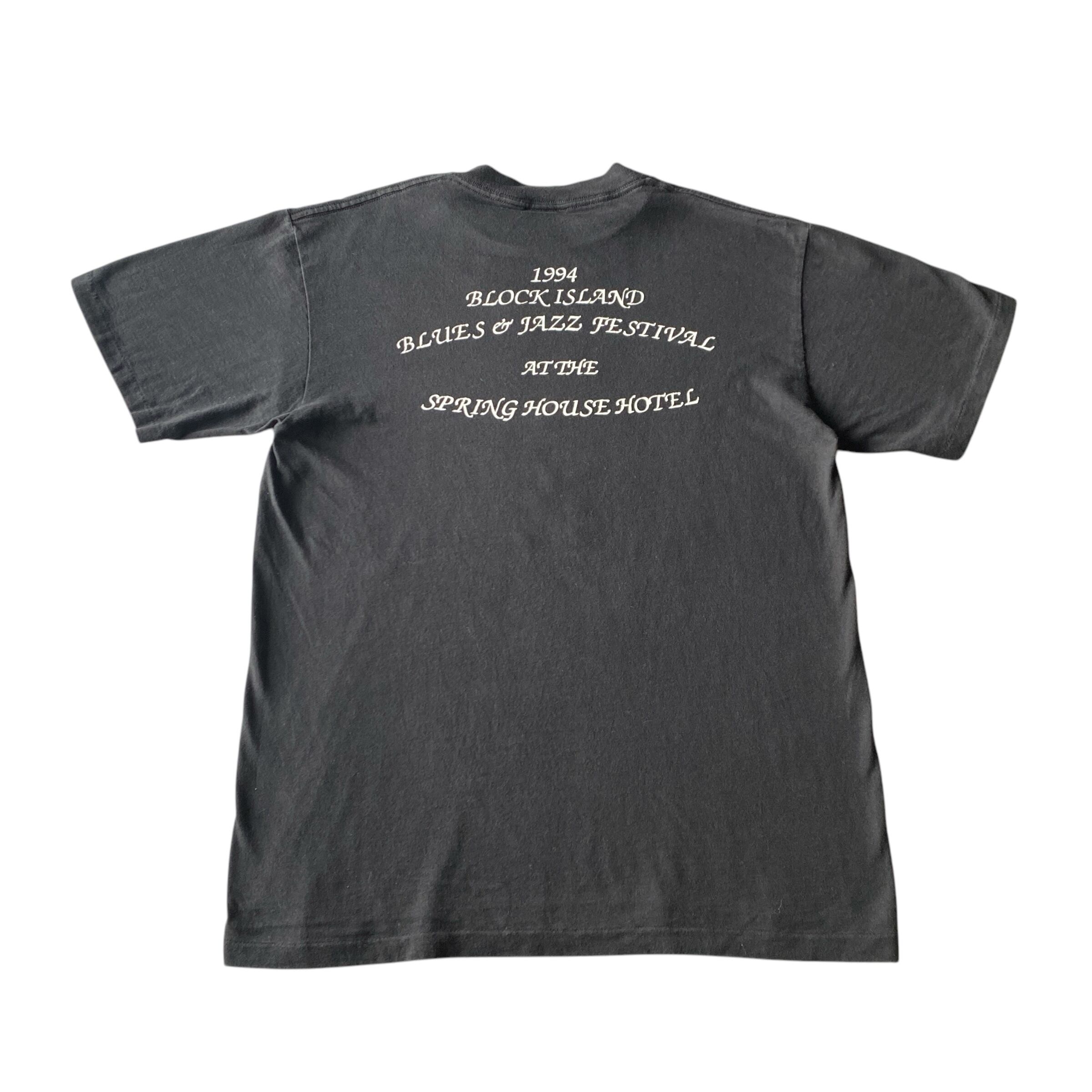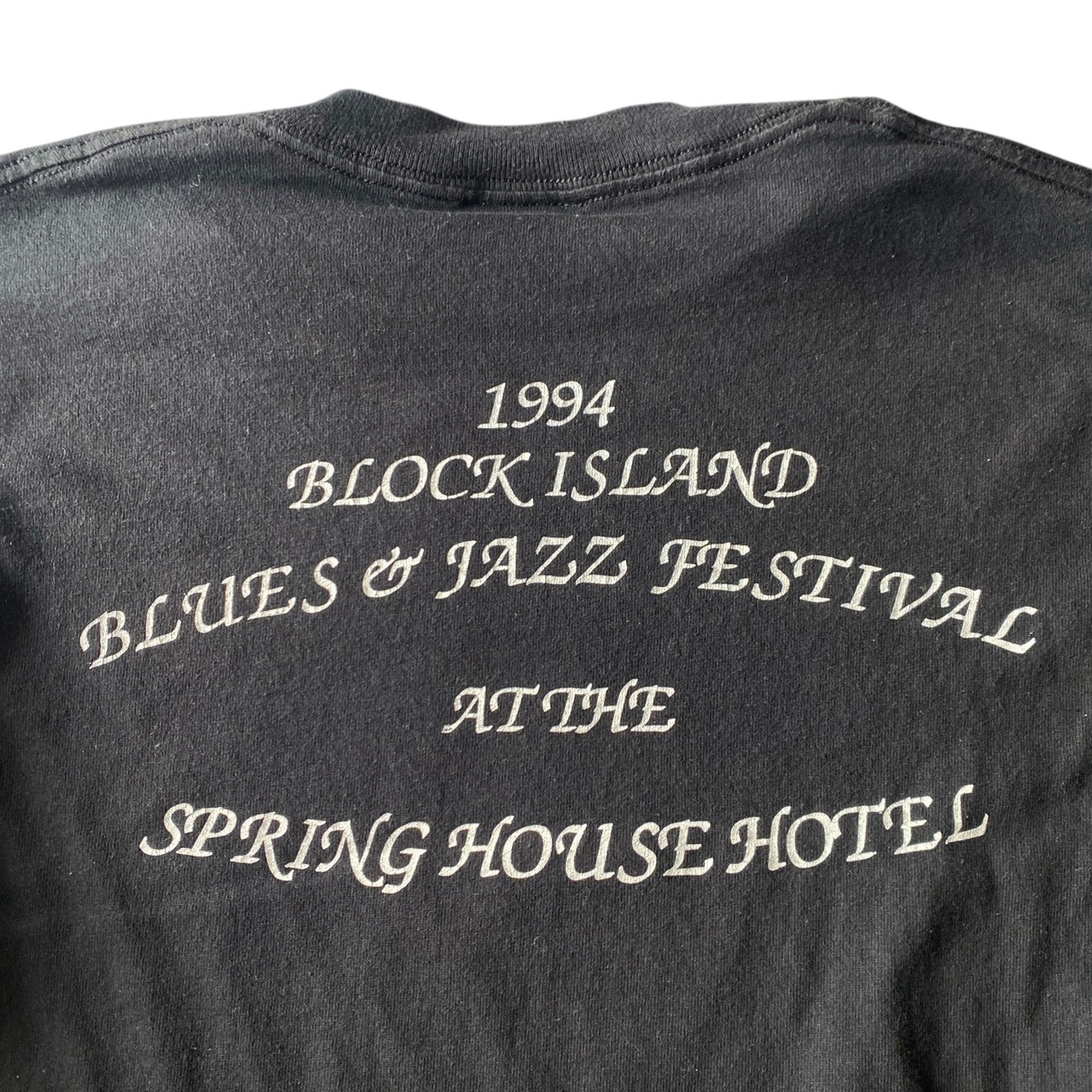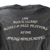 調べても詳細が出てきませんでしたが、1994年にブロック島という場所で開催された、100.3チャンネルのCOOL FMラジオ主催「blues&jazz festival」の記念tシャツといったでしょう。