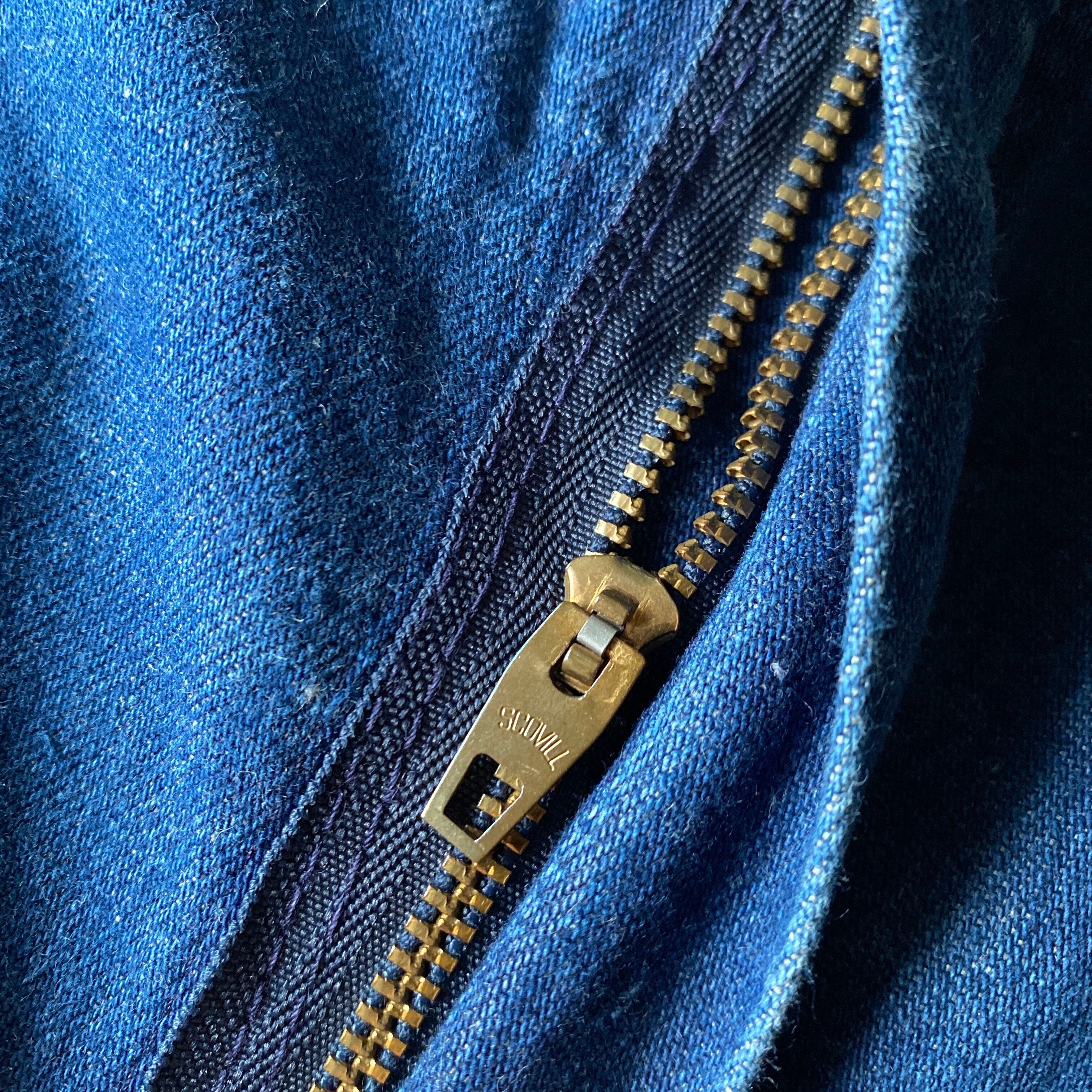 この年代のペインターパンツ特有のややライトオンスなコットンデニムに、膝下丈あたりで(176 70が腰骨辺りで履いた場合)カットオフされたアメリカっぽいスタイルが格好良い一着。