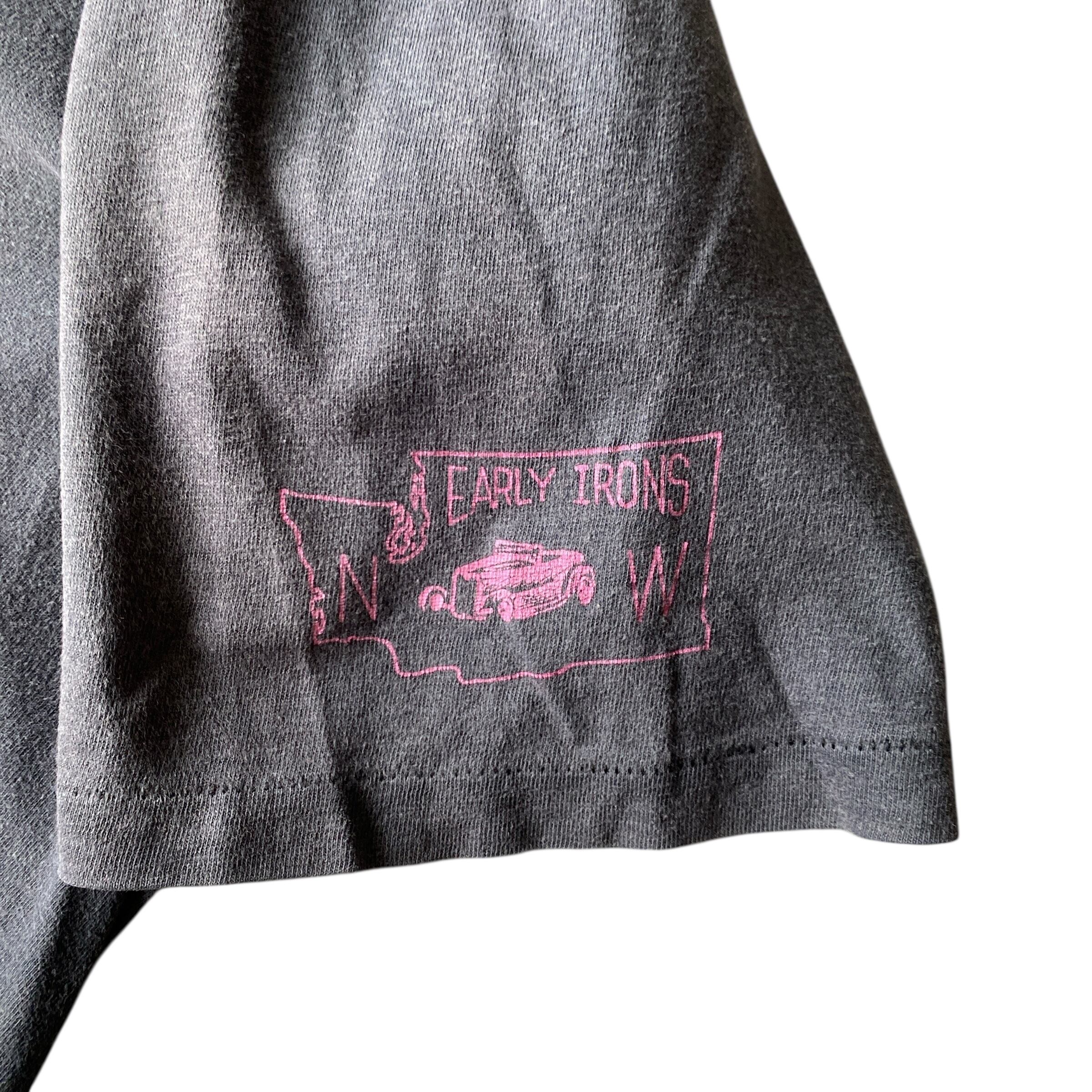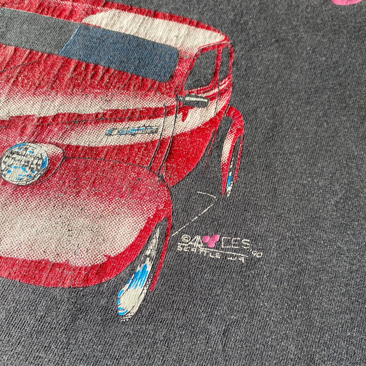 フェードしたブラックボディにヴィンテージカーのプリント、短丈ボックスシルエットが非常に格好良い一着。
