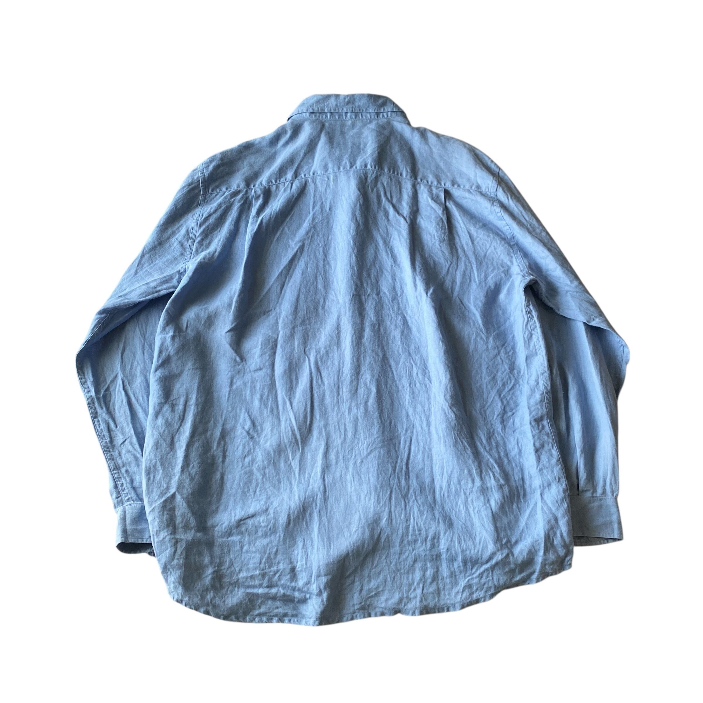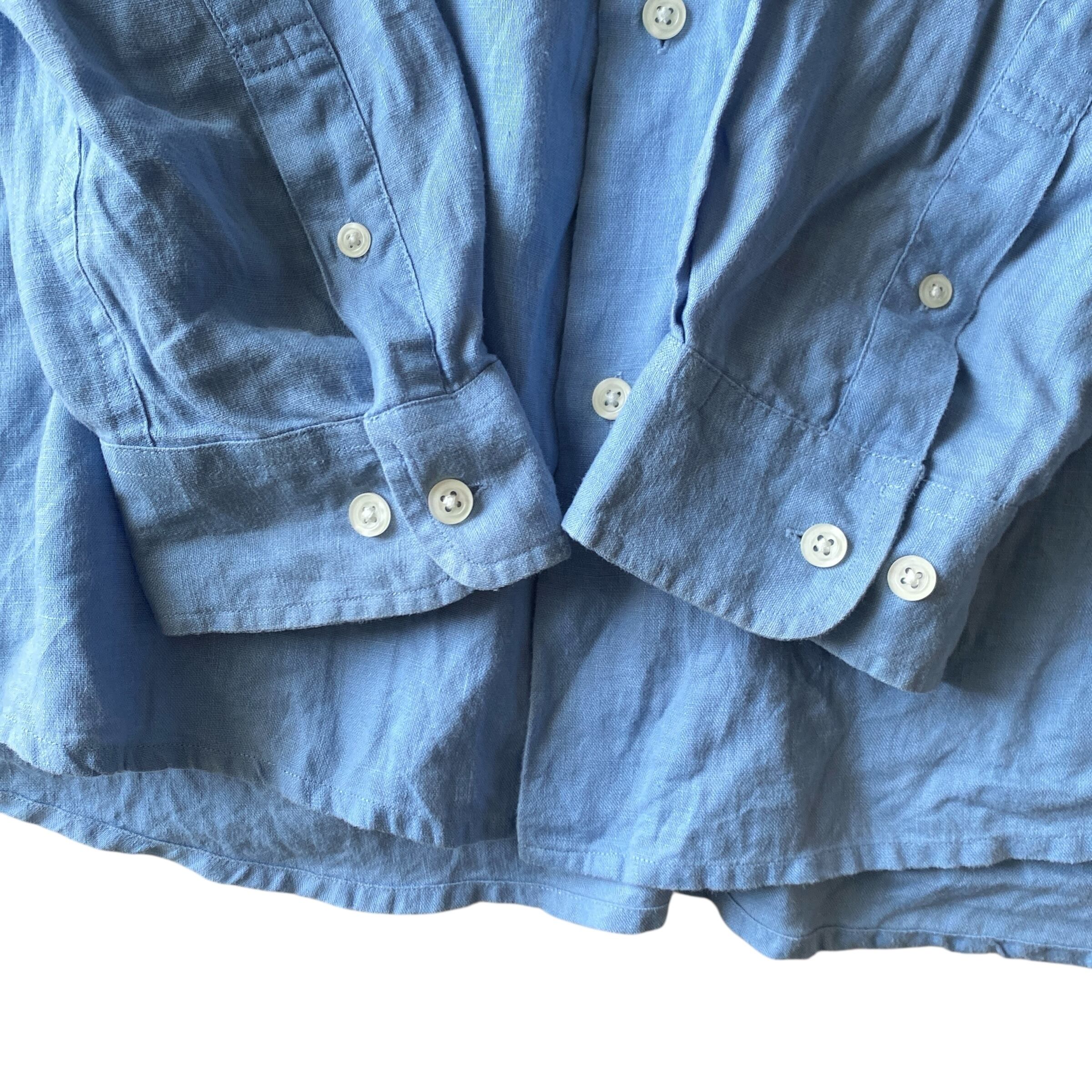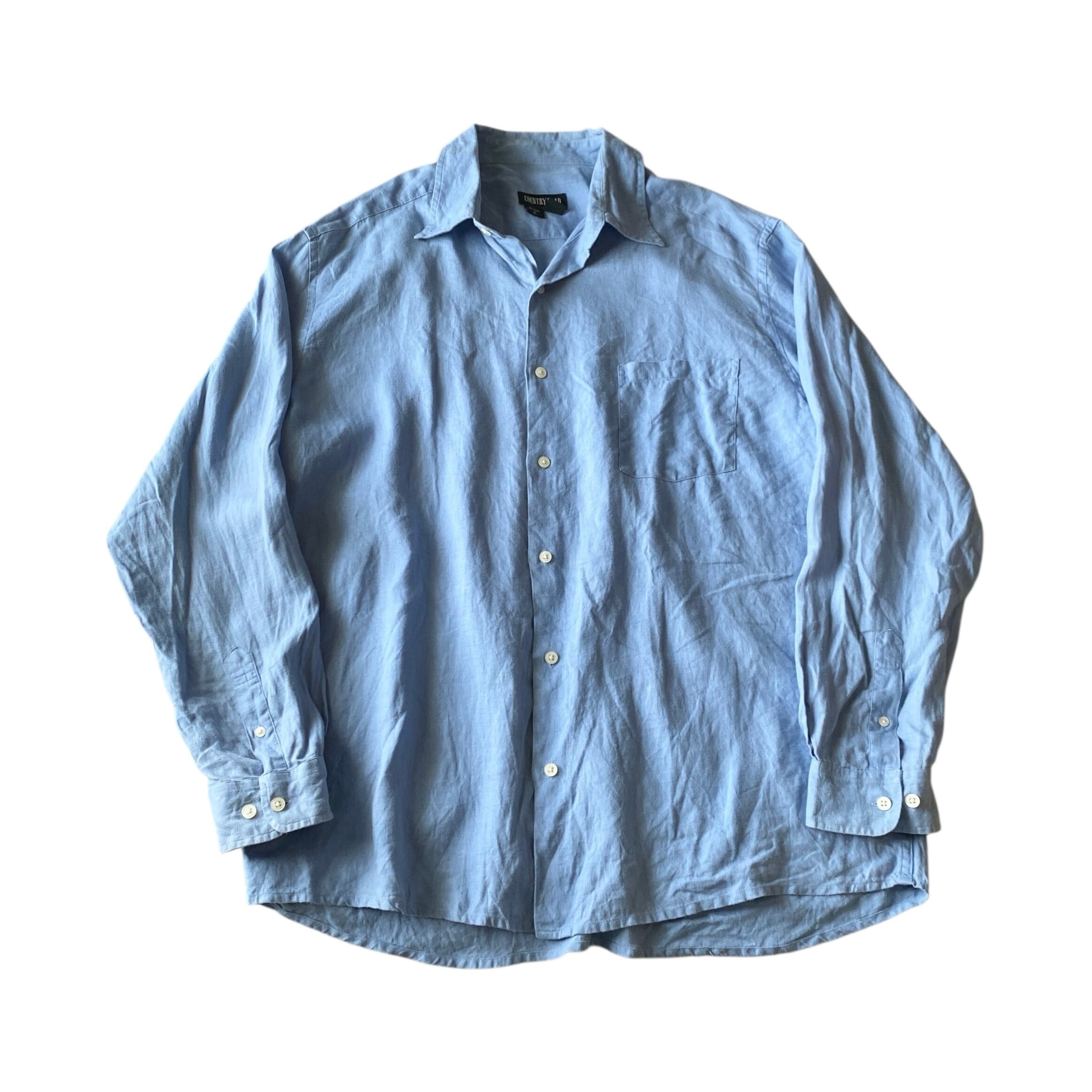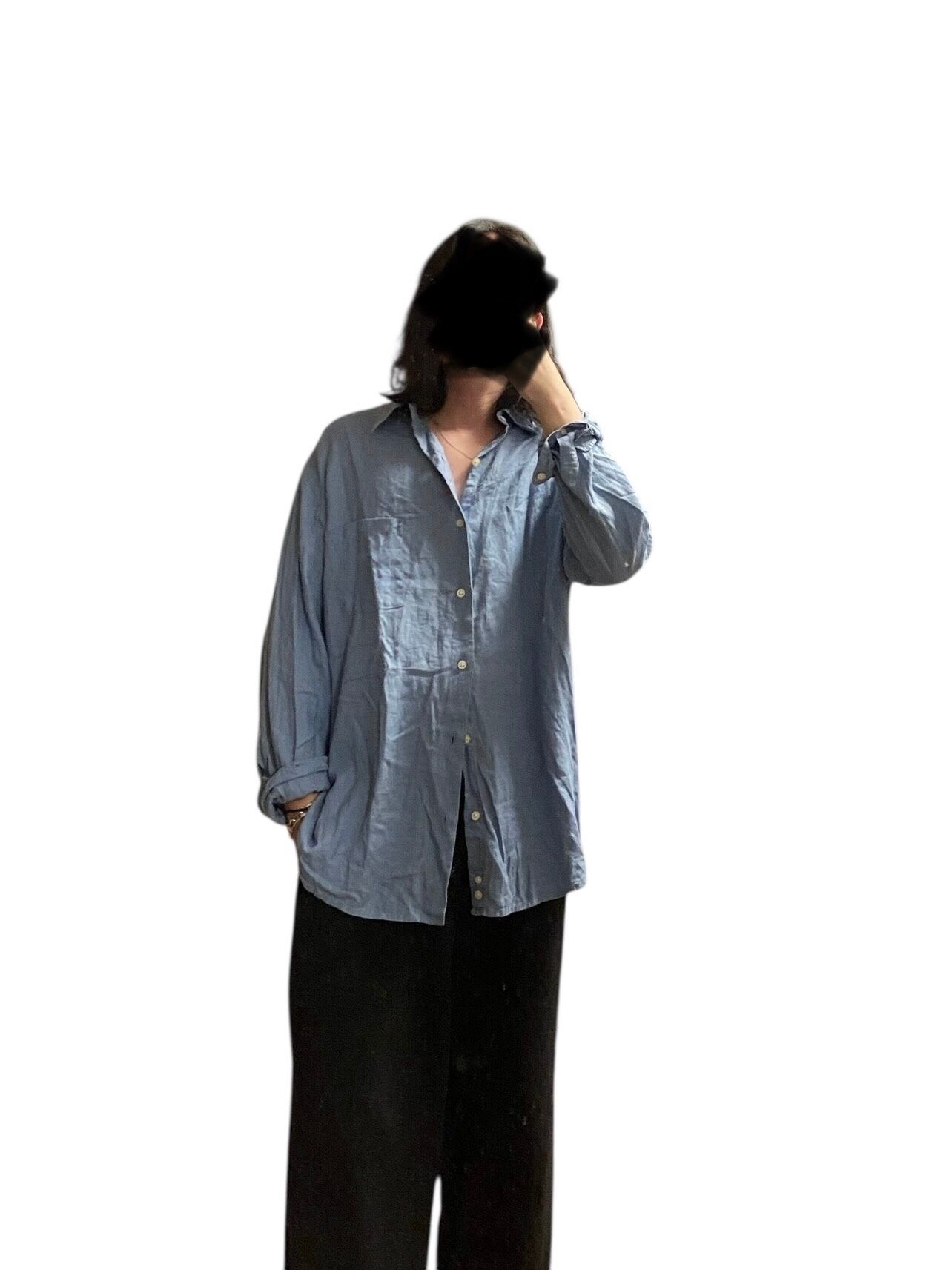 特段書くこともないぐらいベーシックなシャツですが、インポートリネン100%の柔らかい生地の質感、サックスブルーの爽やかな色目、ゆったりとした大きめのシルエットが非常に格好良いです。