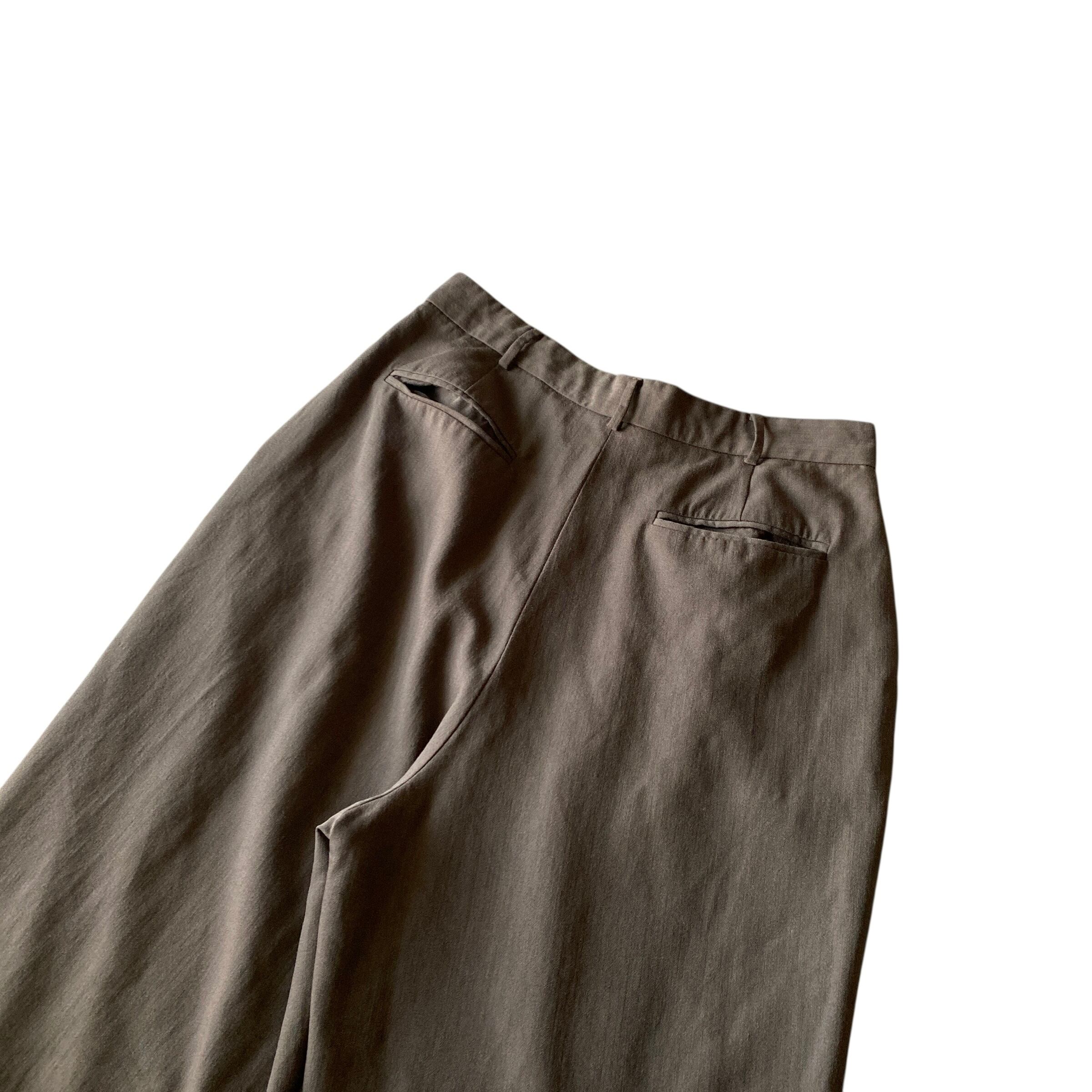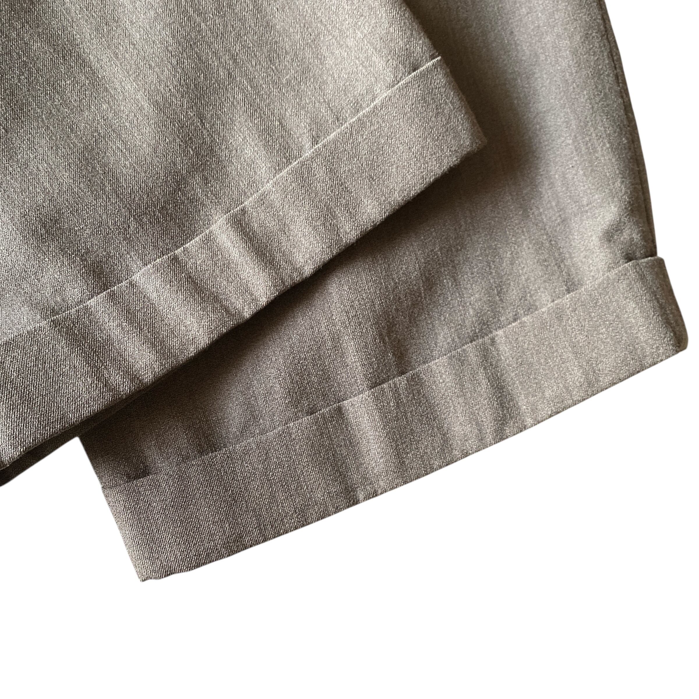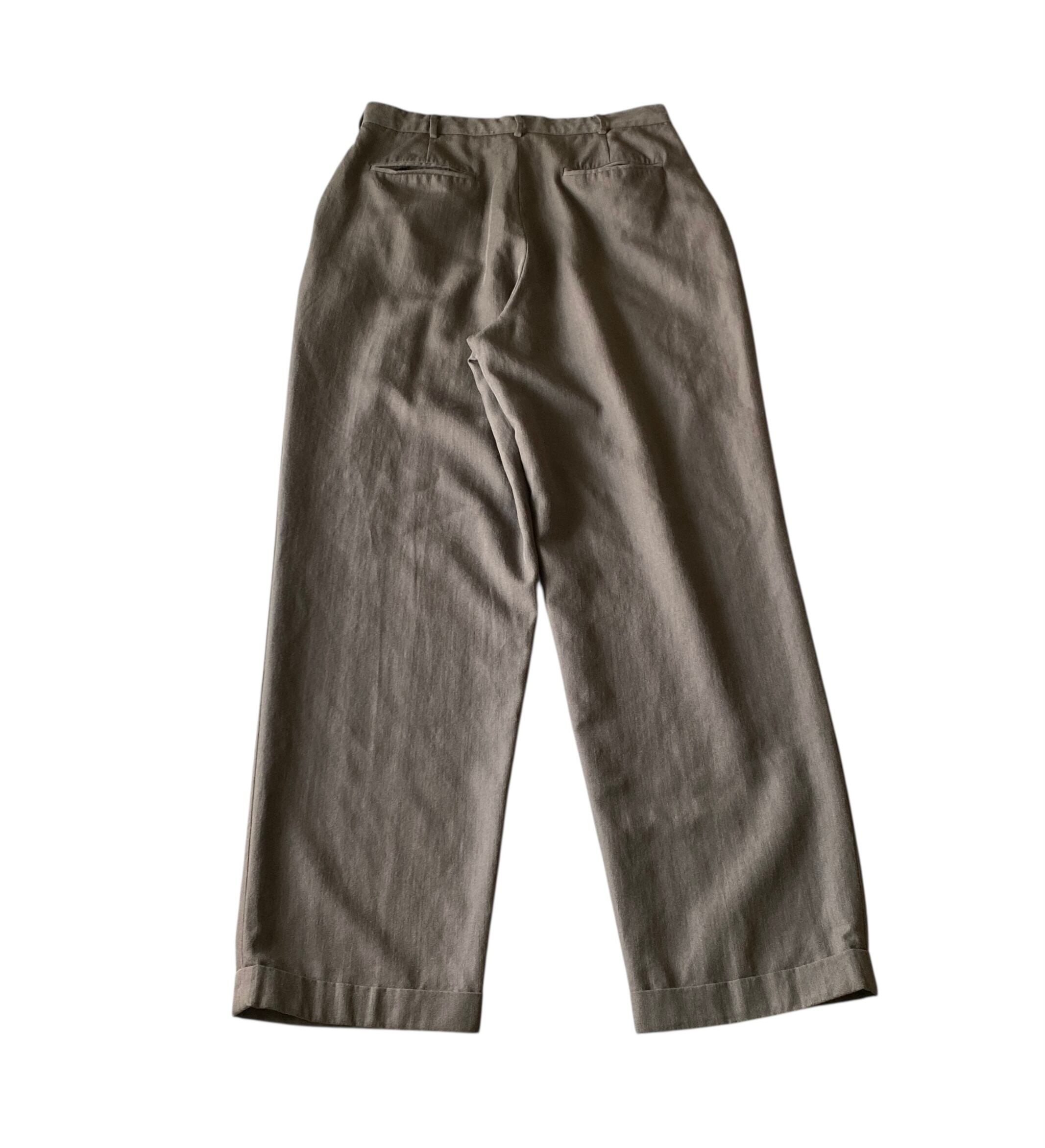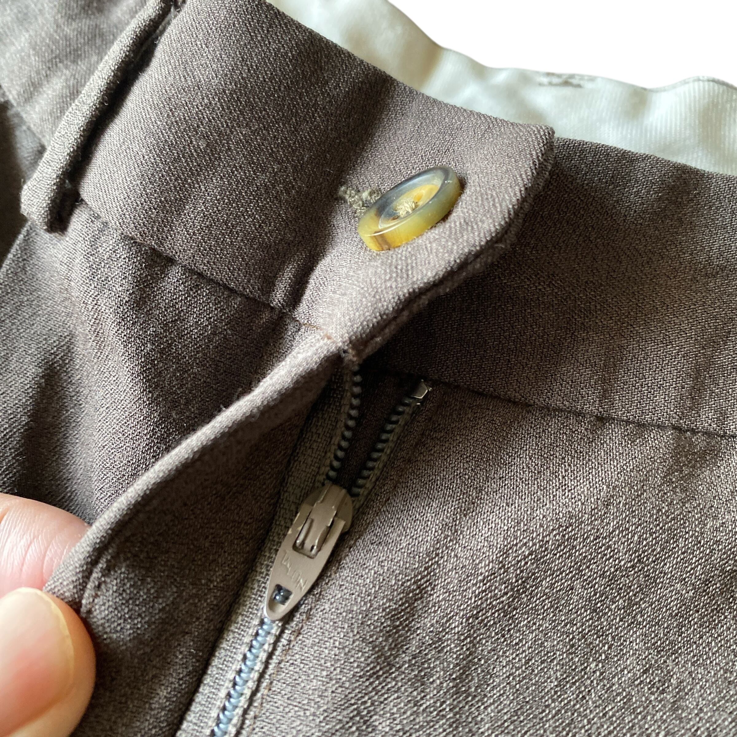 程よく肉厚でとろみのある極上のウールギャバジン生地に、カーキブラウン?系の上品なくすみカラー、股上深めでゆったりとしたクラシックシルエットが非常に格好良い一本。