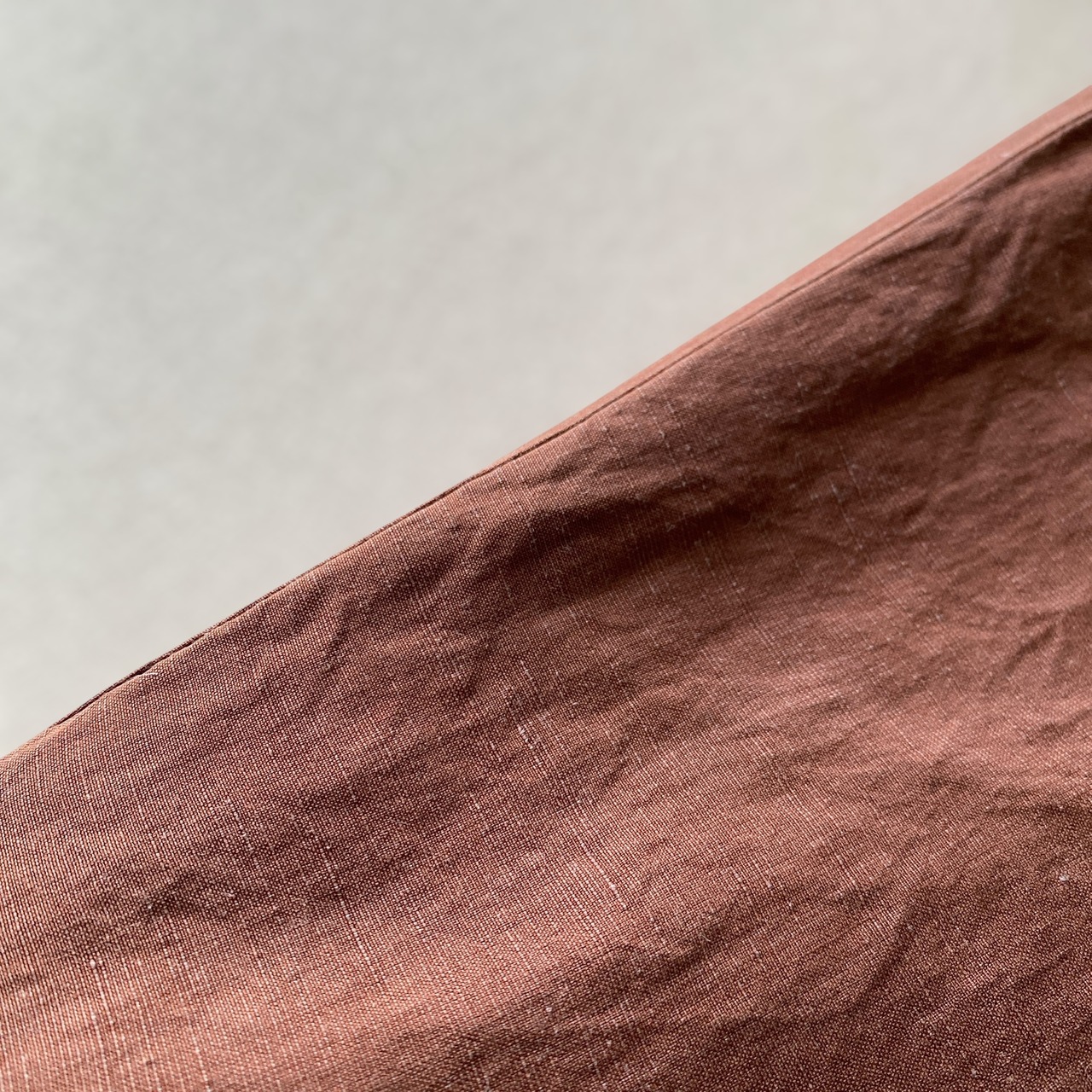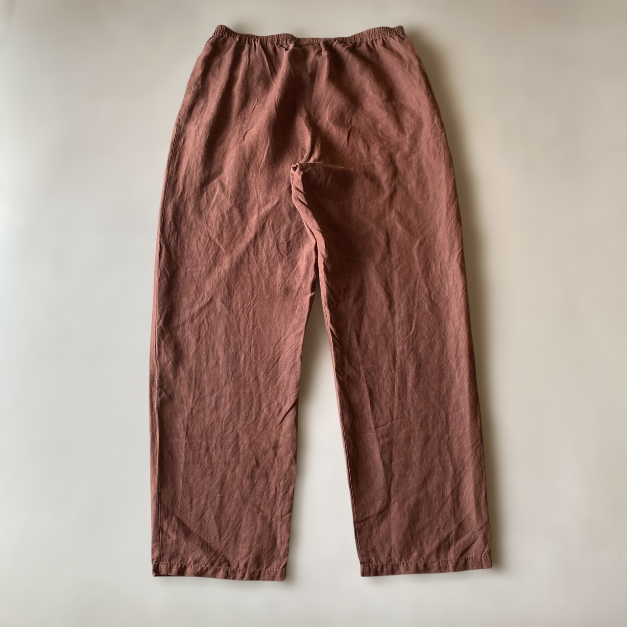 上品なカスリブラウンカラーに、とろみ感のあるシャツ生地のシルクリネン素材、ゆったりとしたシルエットが大変素晴らしい一本。