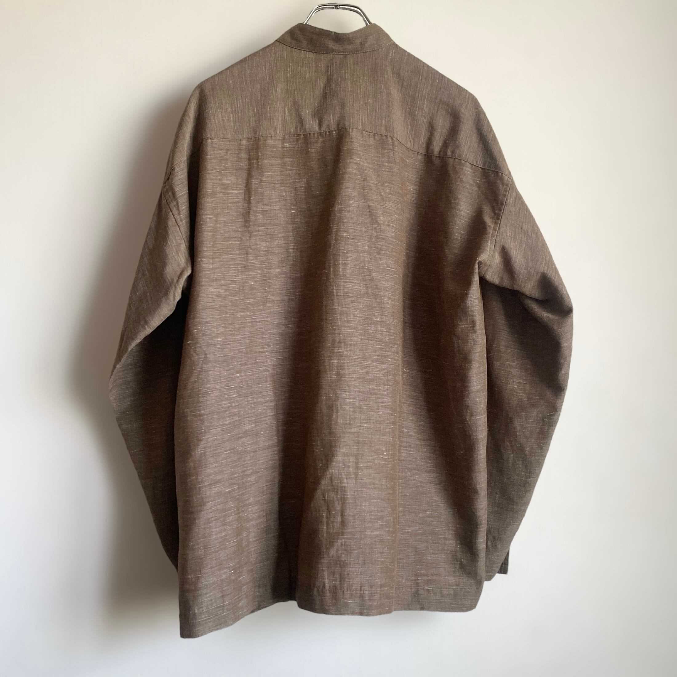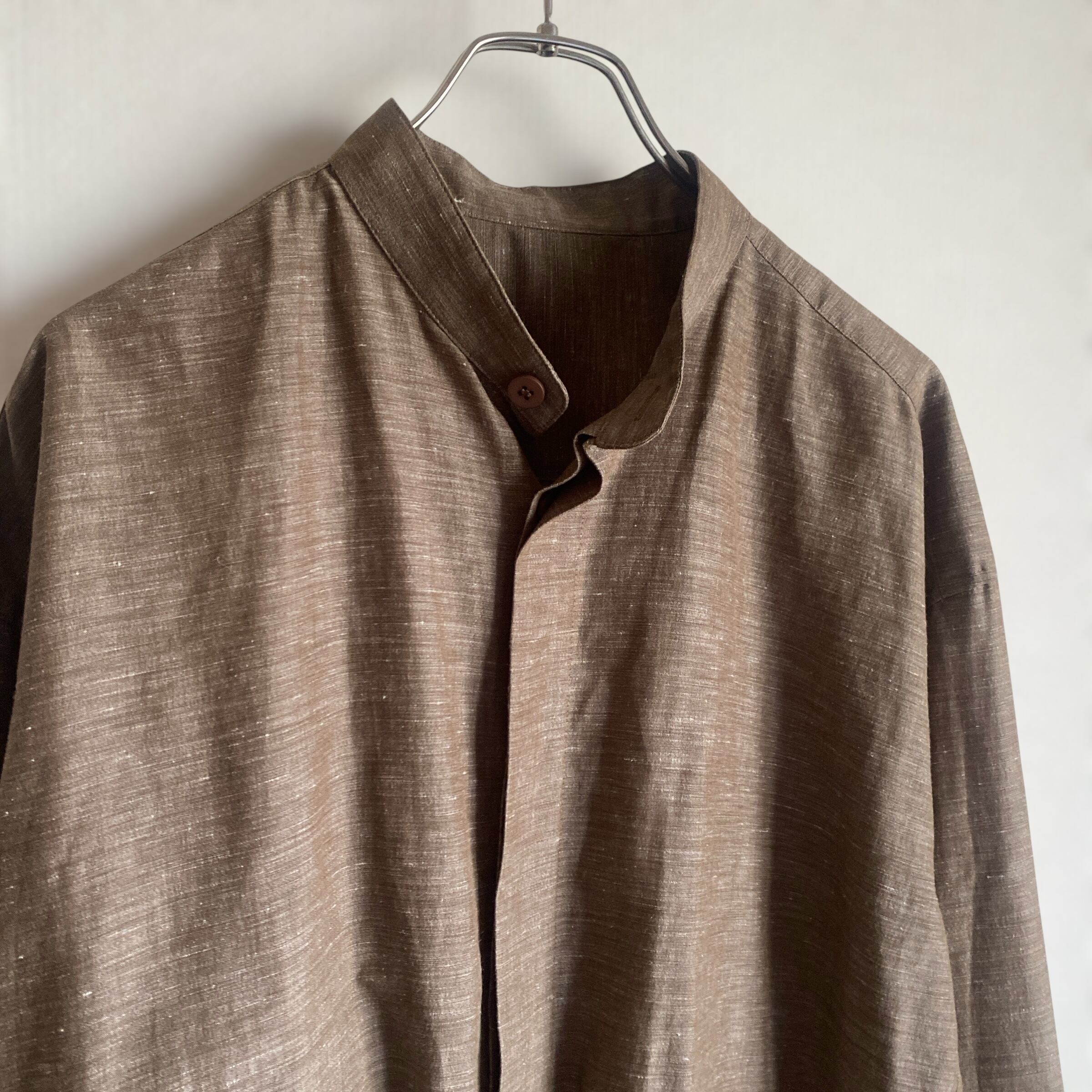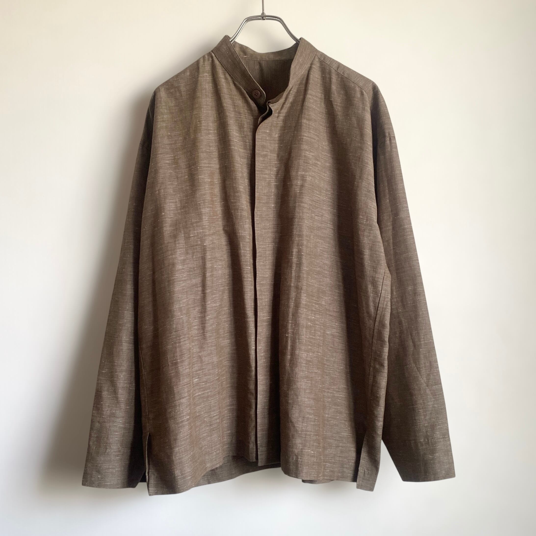 リネン×ポリエステルの程よく肉厚でサラッとした生地に、上品なカスリブラウン系カラー、やや短丈目で、どこか和服を彷彿とさせるような比翼のスタンドカラーが非常に格好良い一着。