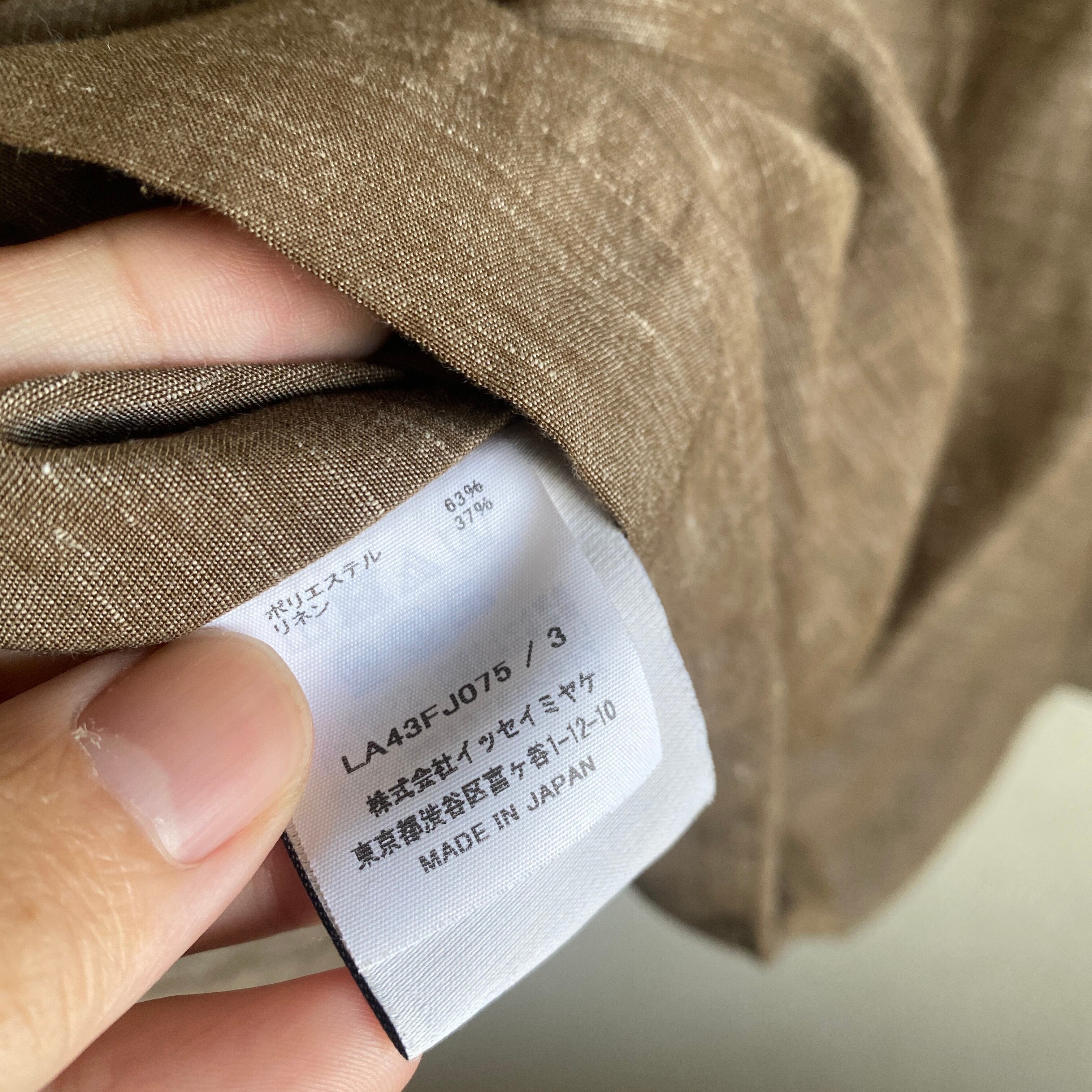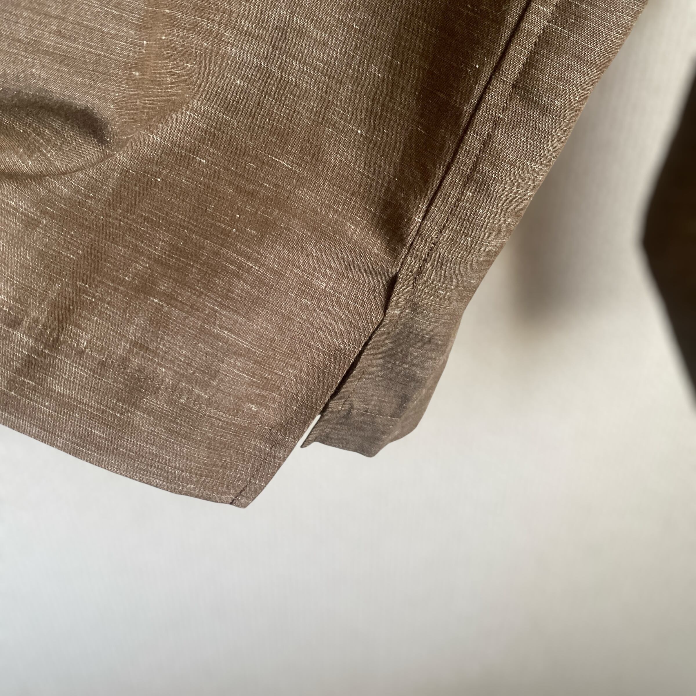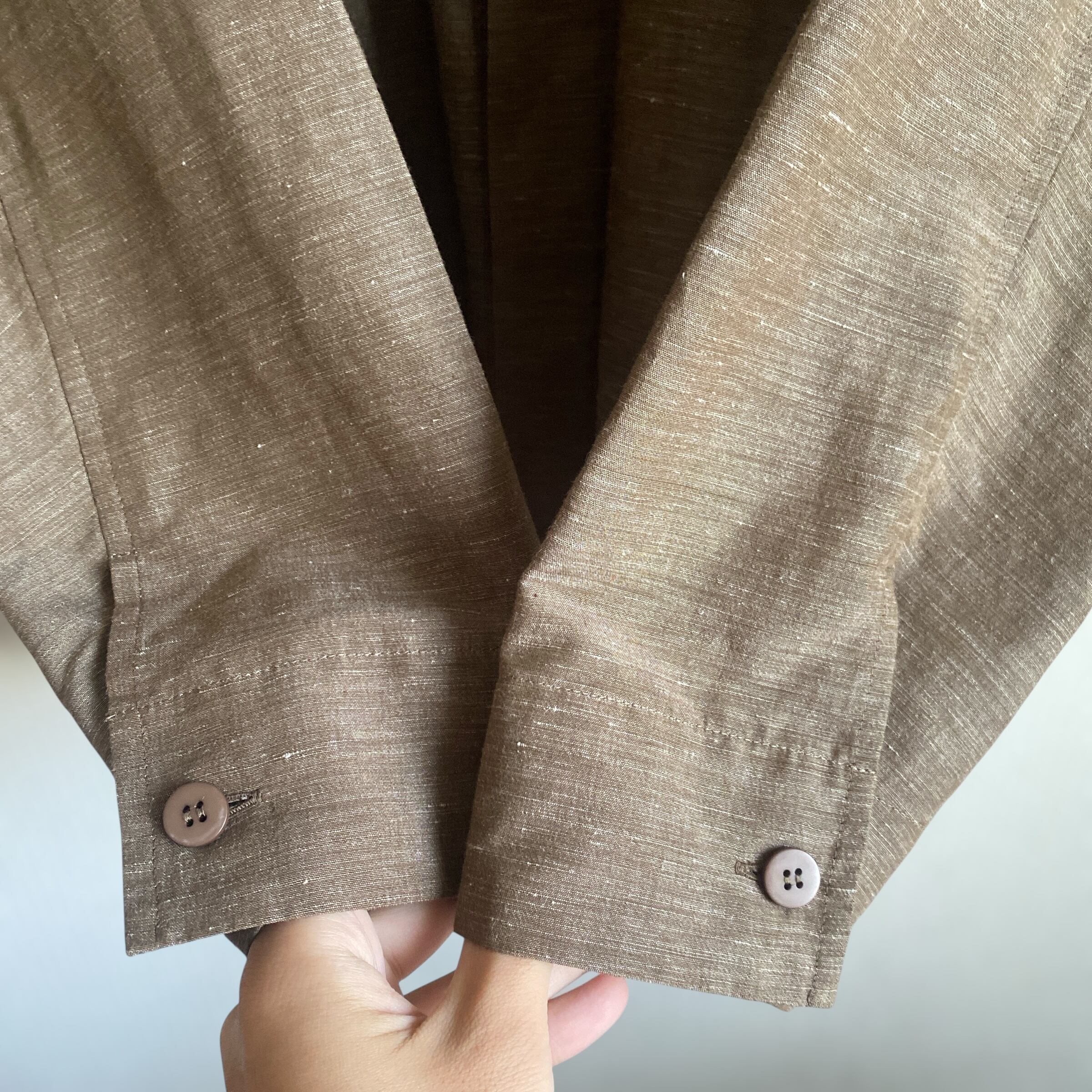 リネン×ポリエステルの程よく肉厚でサラッとした生地に、上品なカスリブラウン系カラー、やや短丈目で、どこか和服を彷彿とさせるような比翼のスタンドカラーが非常に格好良い一着。