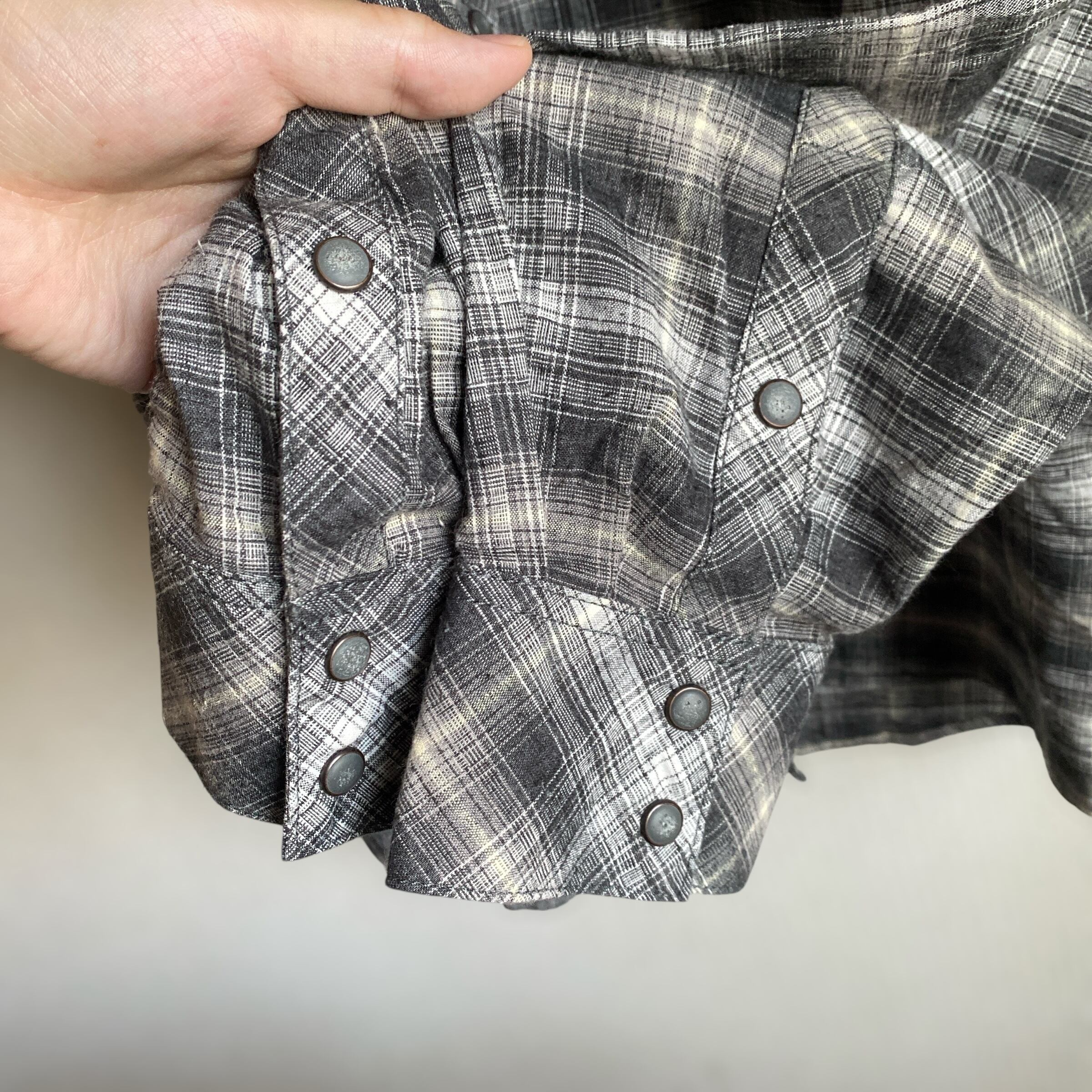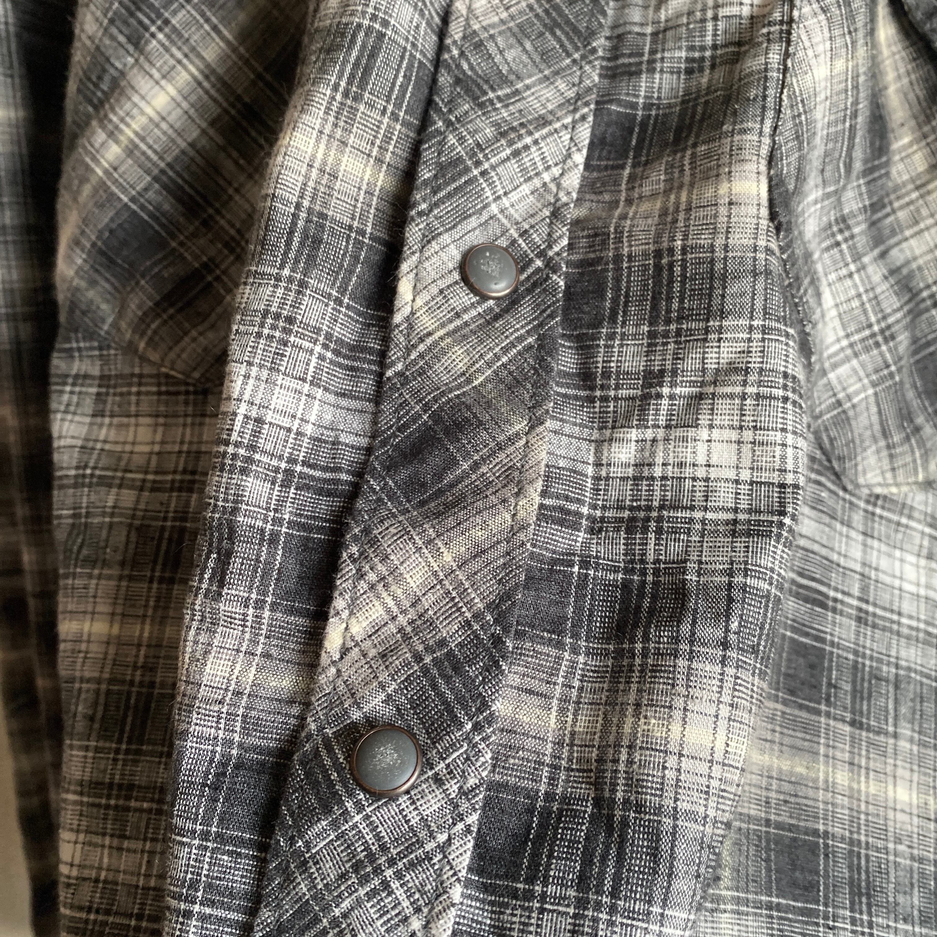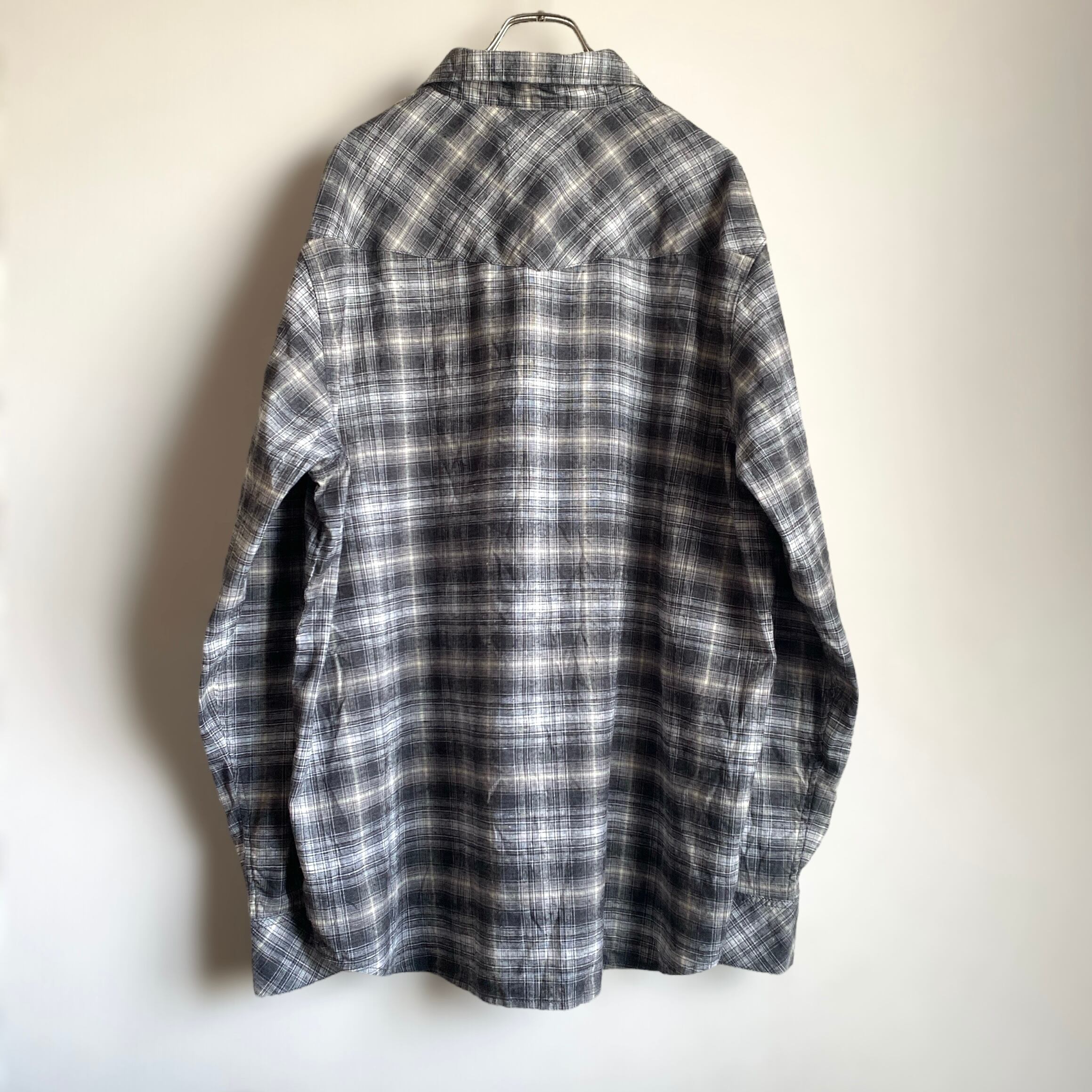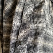 ホワイト×ブラックベースの好配色のオンブレチェックパターンに、ゆったりとしたシルエット、ヴィンテージ加工されたボタン、ヘンプポリエステル混紡のサラッとした生地感が非常に格好良い一着。