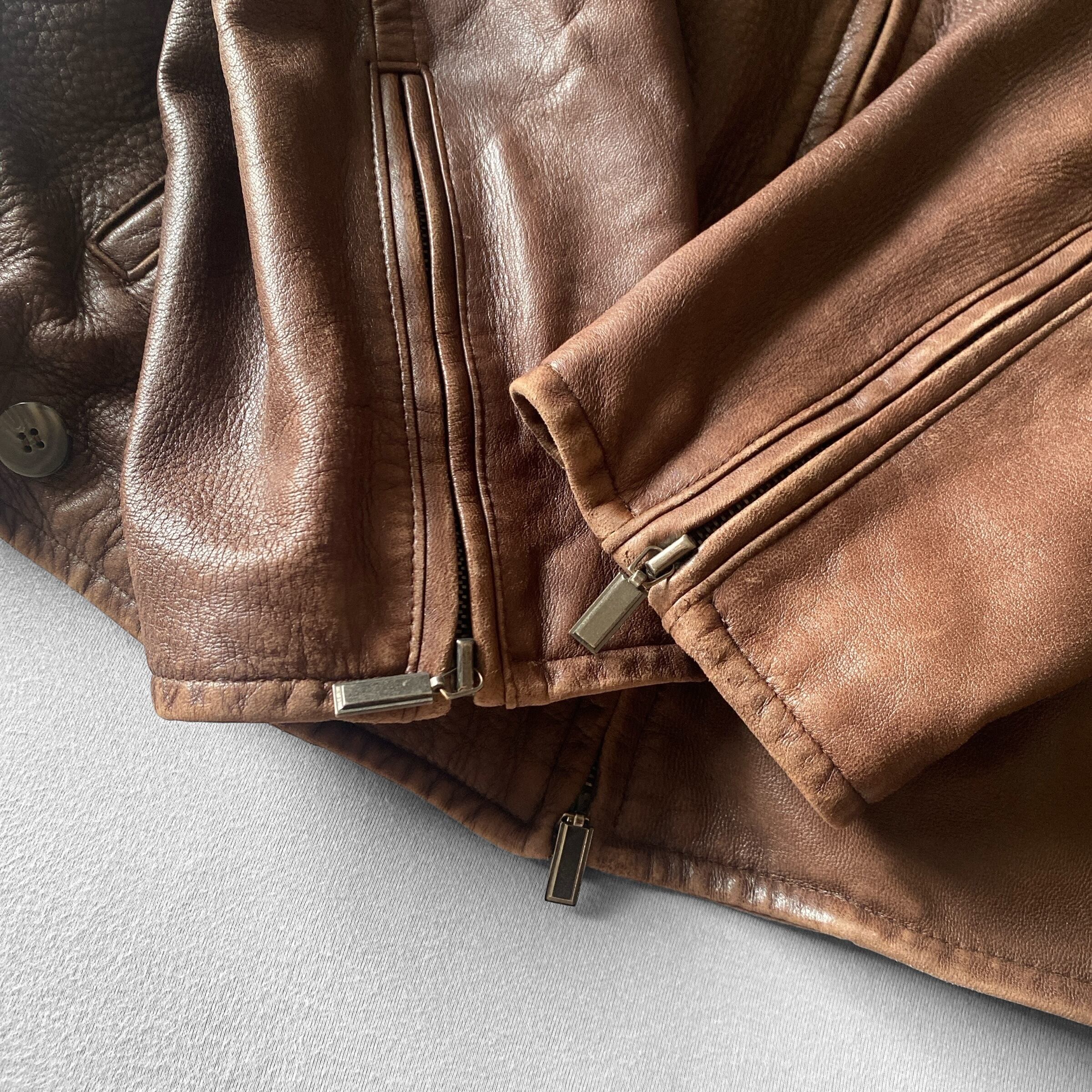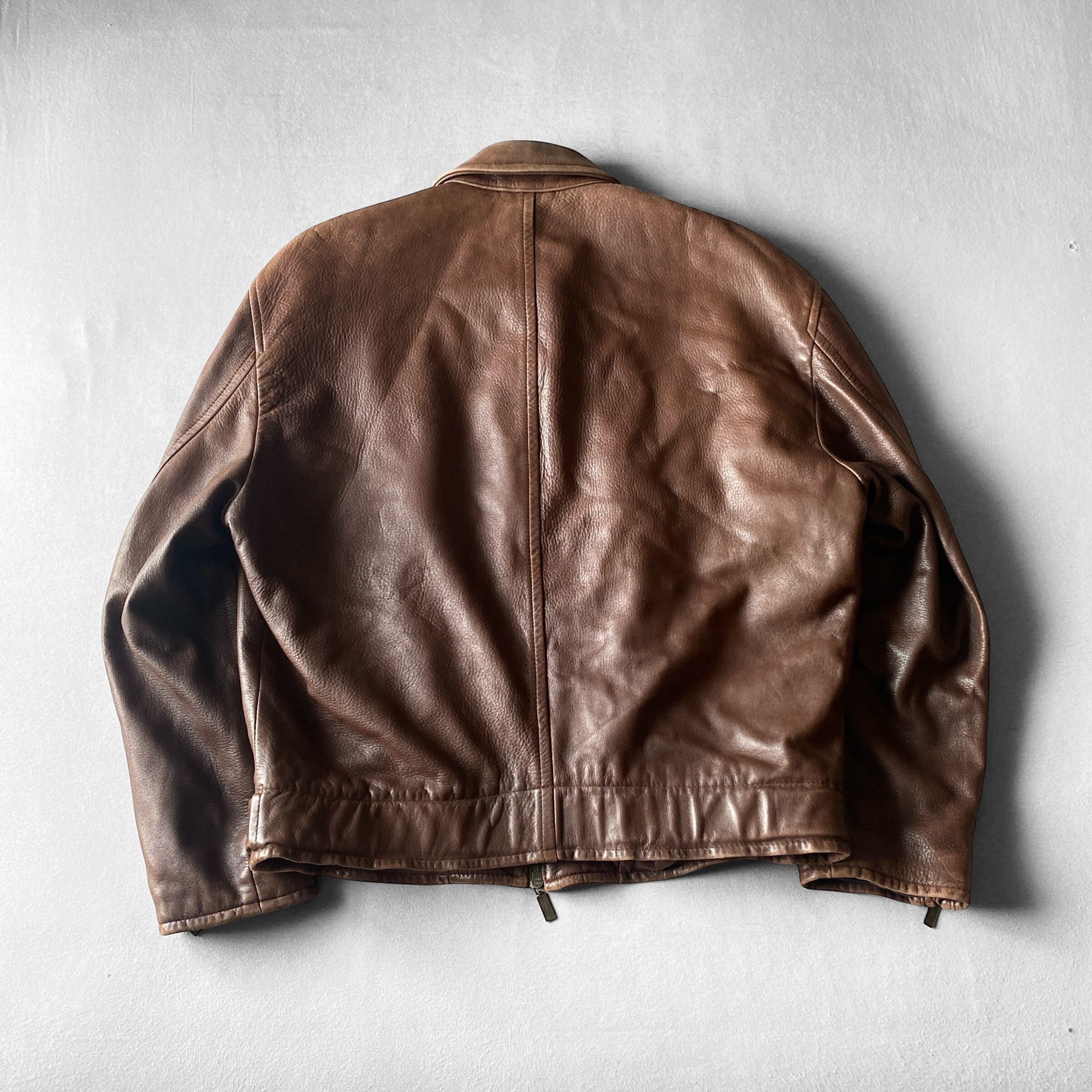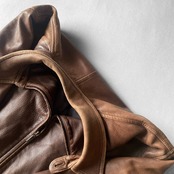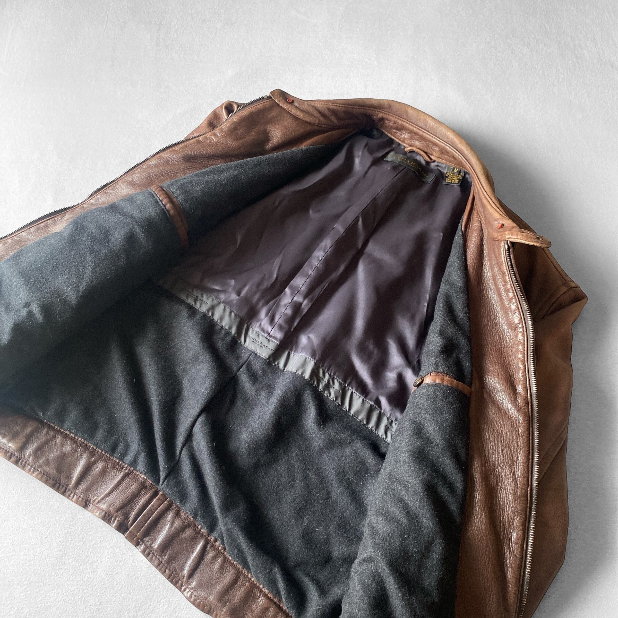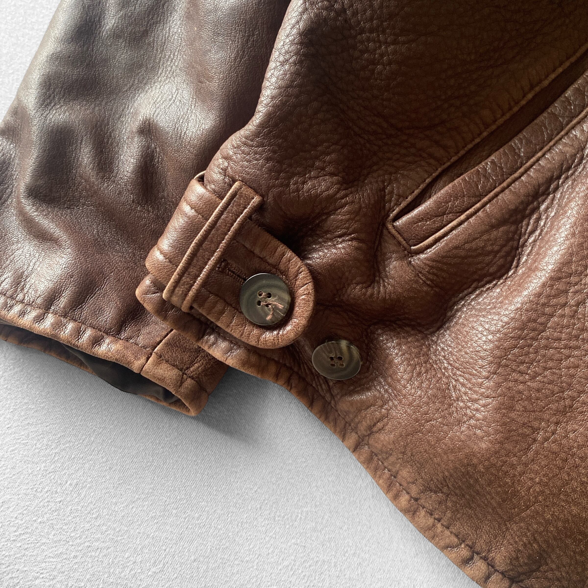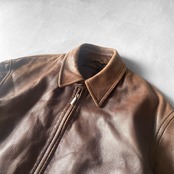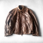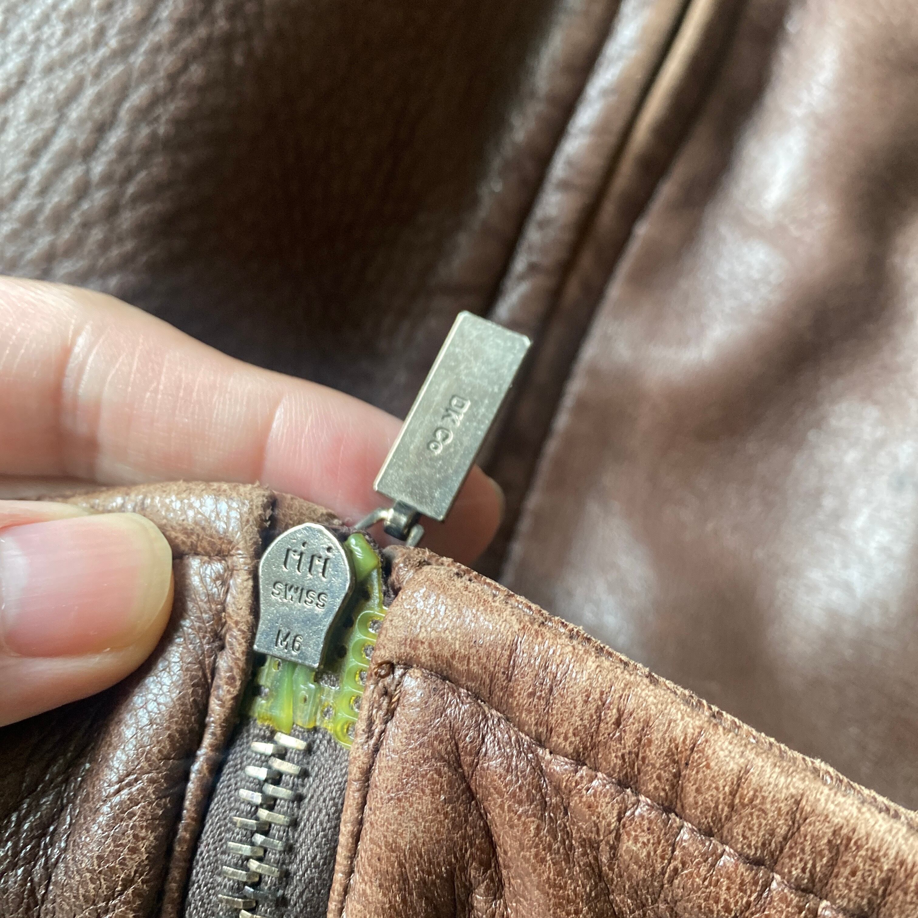 上品かつ無骨さも感じるブラウンカラーに、肉厚でモチっとした極上のラムレザー、しっかりと肩の落ちる短丈ボックスシルエット、人気の高いチンスト付きのドリズラーブルゾン型、riri製のアルミジップが非常に格好良い一着。