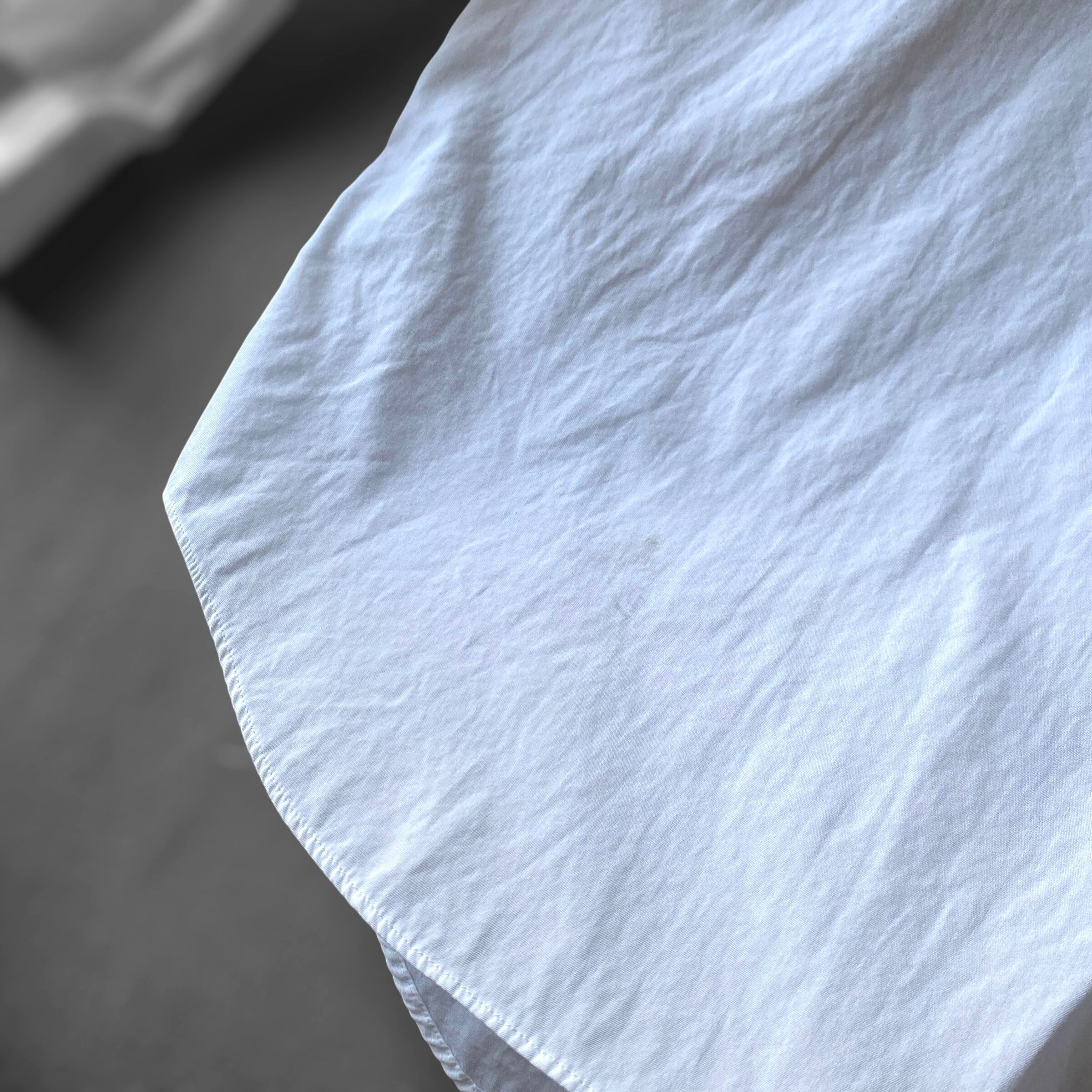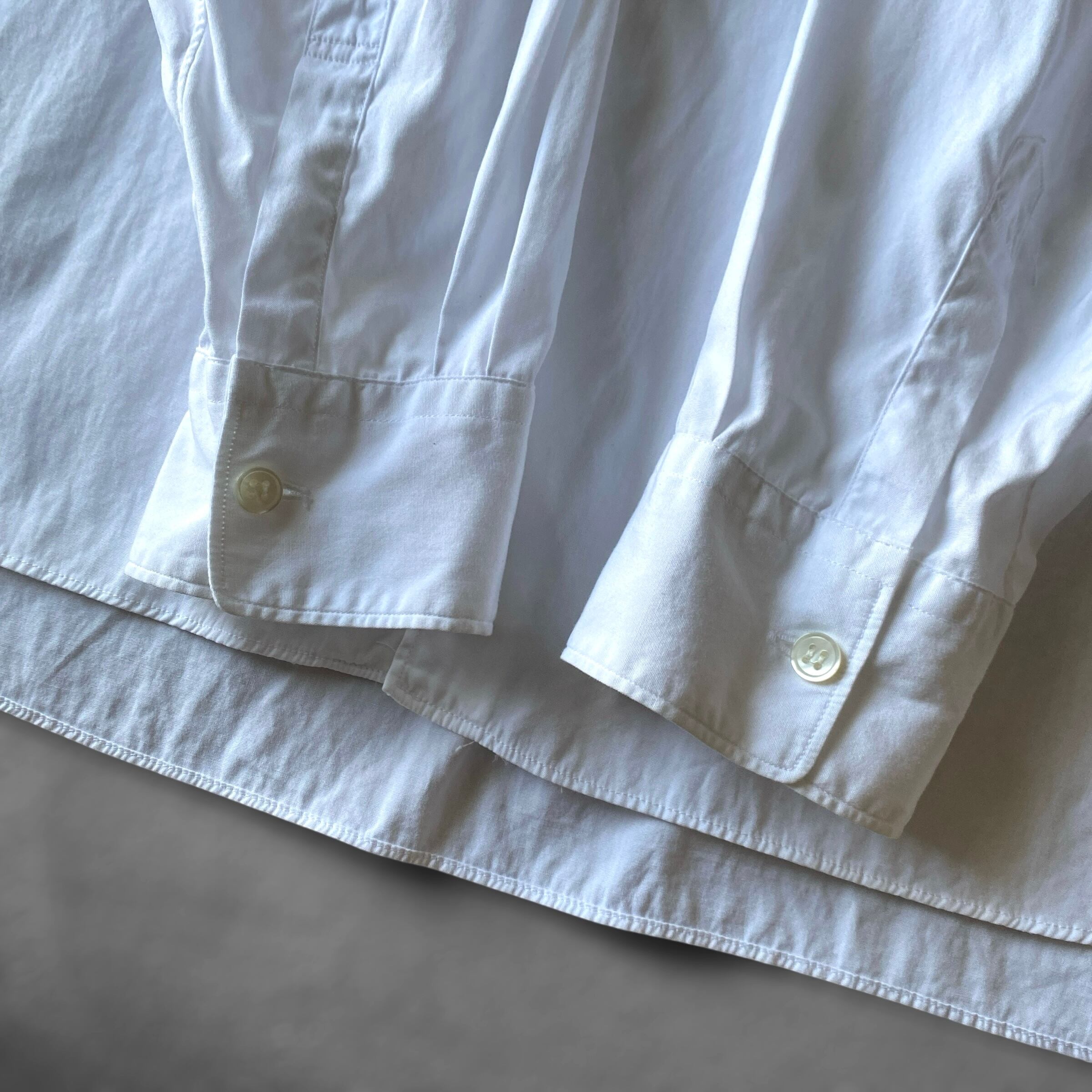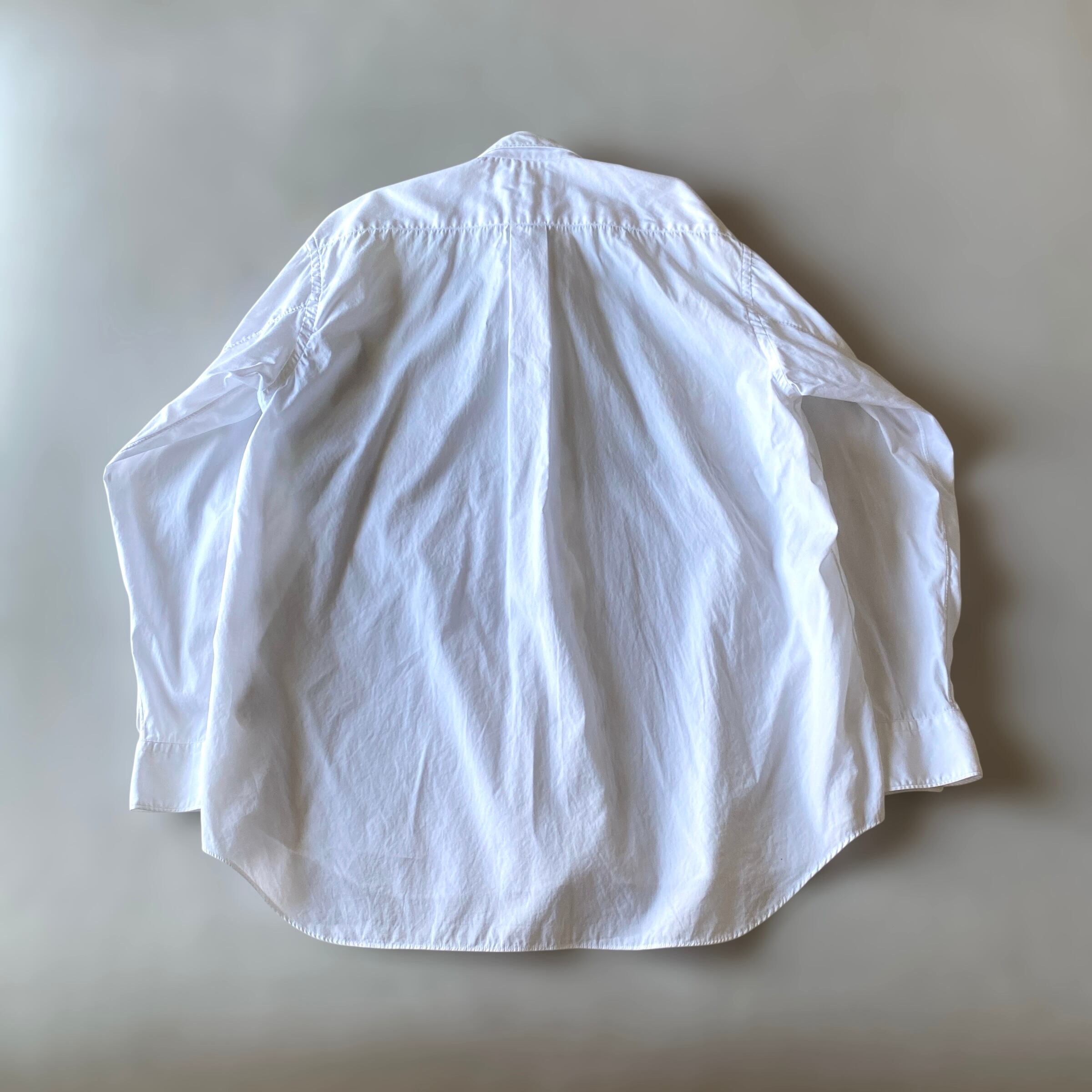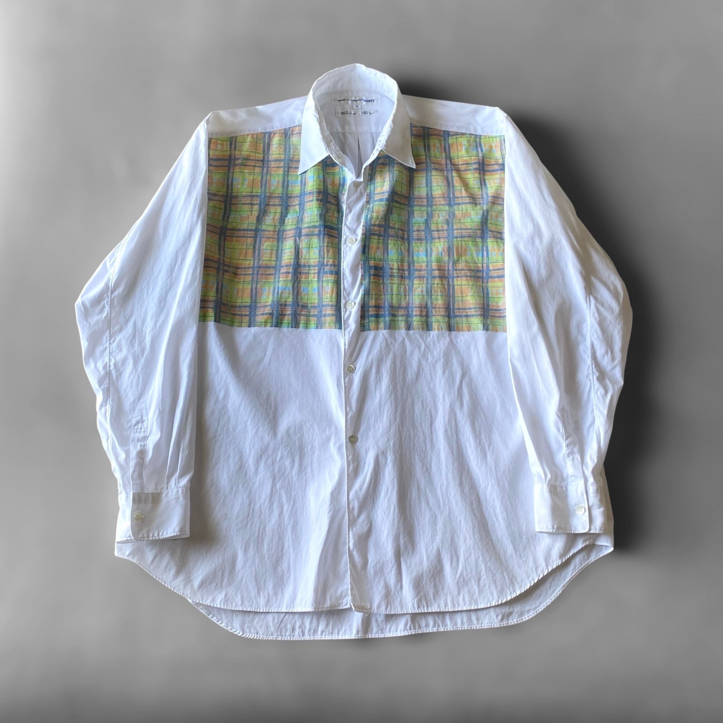 ホワイトカラーの上質なコットンブロードクロスに、フロントにチェックのプリントが施されたアヴァンギャルドなデザイン、ピッチな細かい丁寧な縫製、shirt foreverのワイドのシルエットに近いようなゆったりとしたシルエットが非常に格好良い一着。