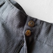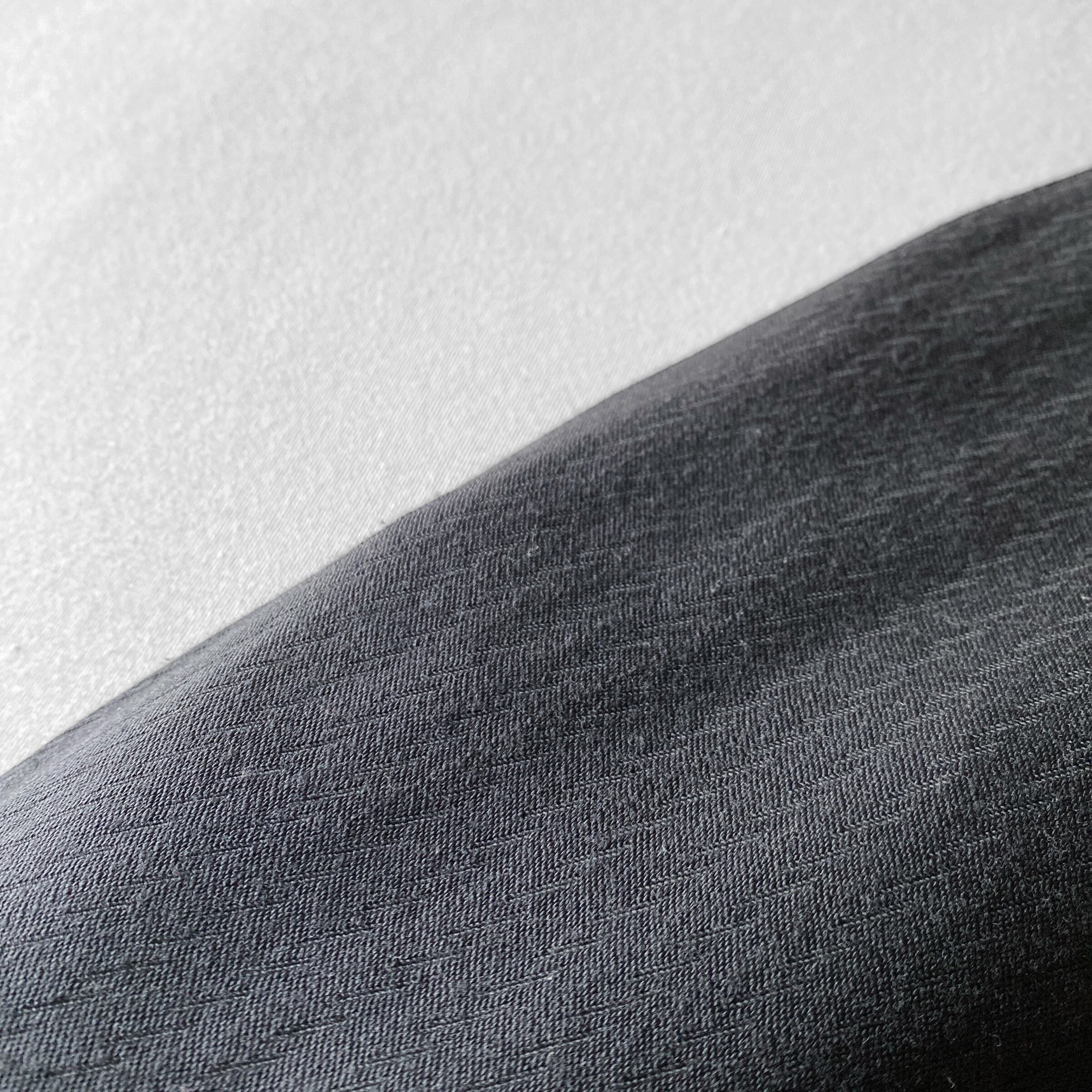 ウール×レーヨンのとろみのある上品な織柄の生地に、ブラック〜ダークグレーの落ち着いた色目、ドカッと太いワイドテーパードシルエットが非常に格好良い一着。