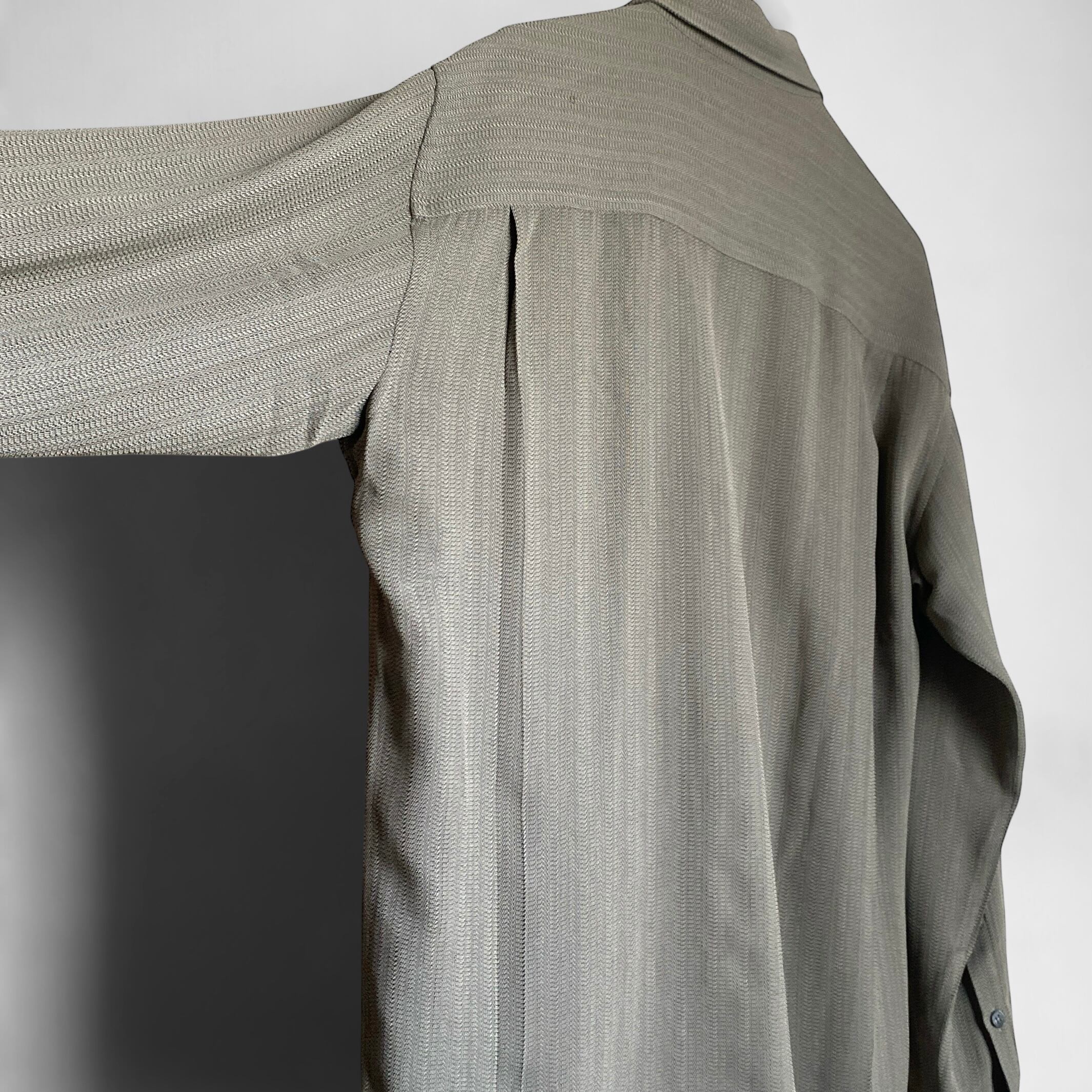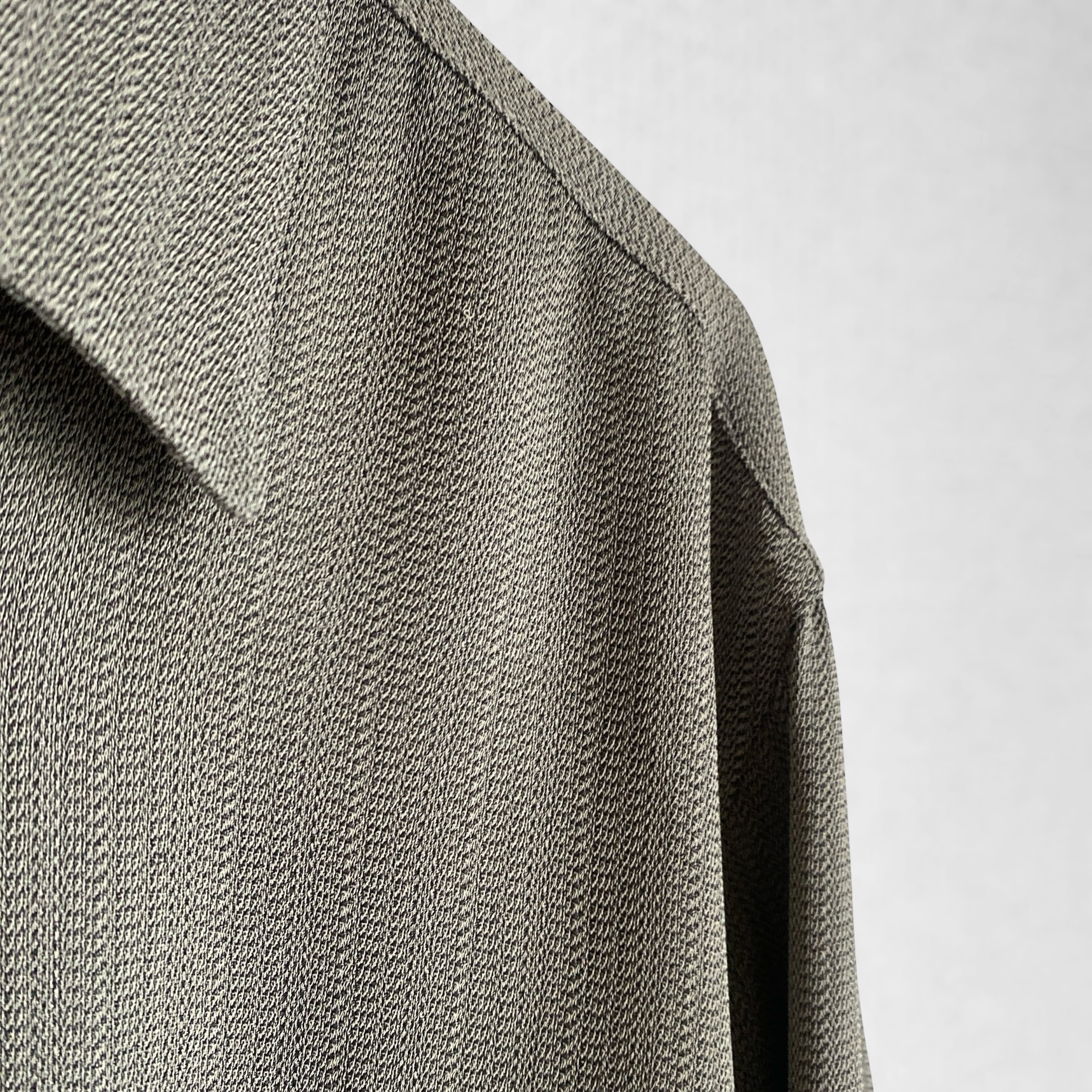 スモーキーなグレーにモスを少し足したような絶妙な色目に、シャリ感がありつつとろみの強いレーヨンアセテートの生地感、ヘリンボーンのような力強い織柄が大変素晴らしい一着。