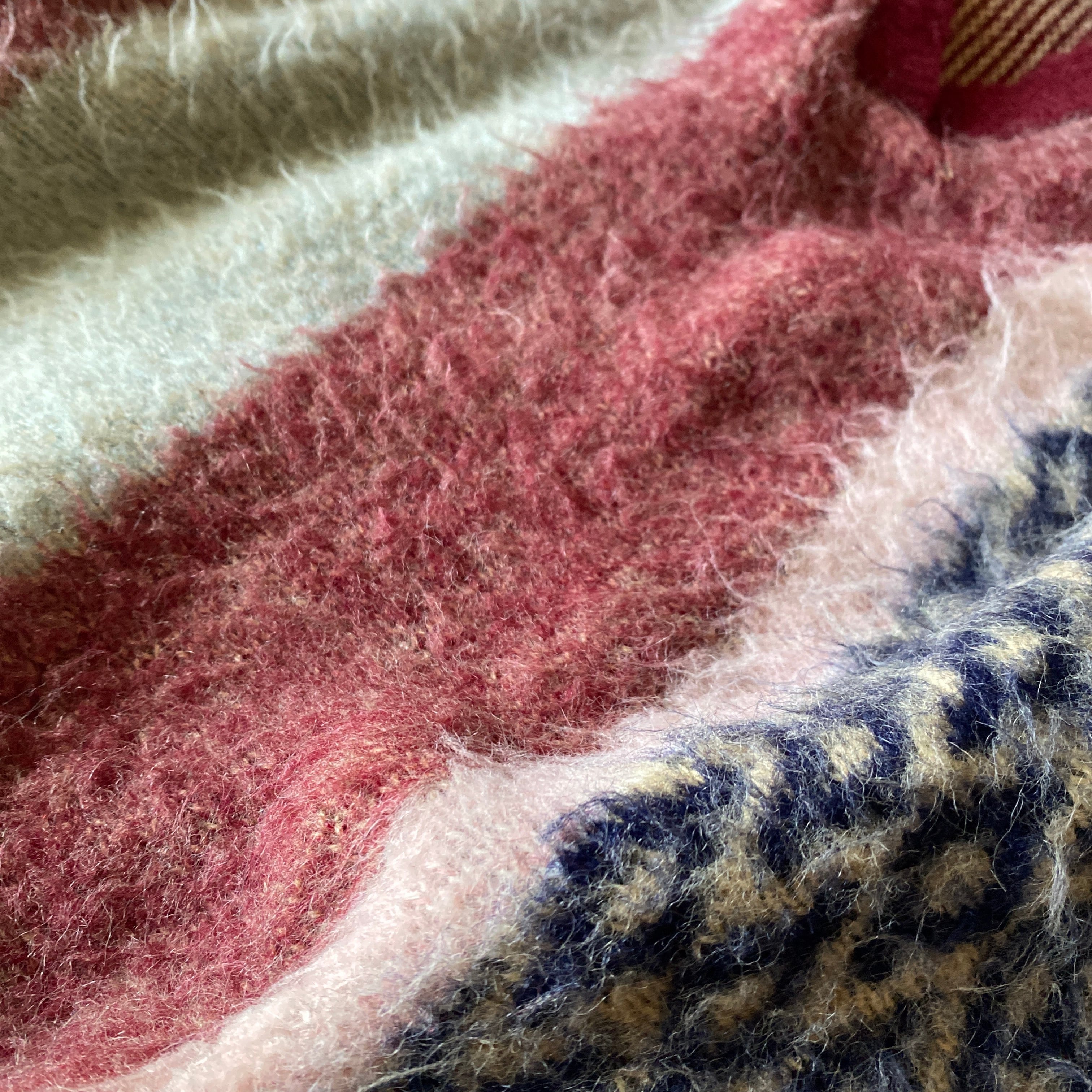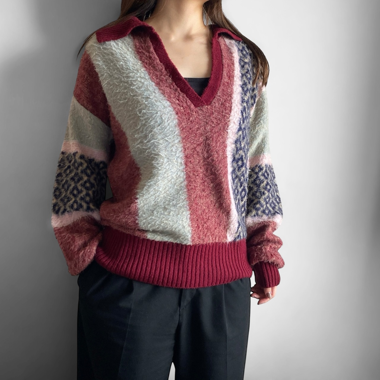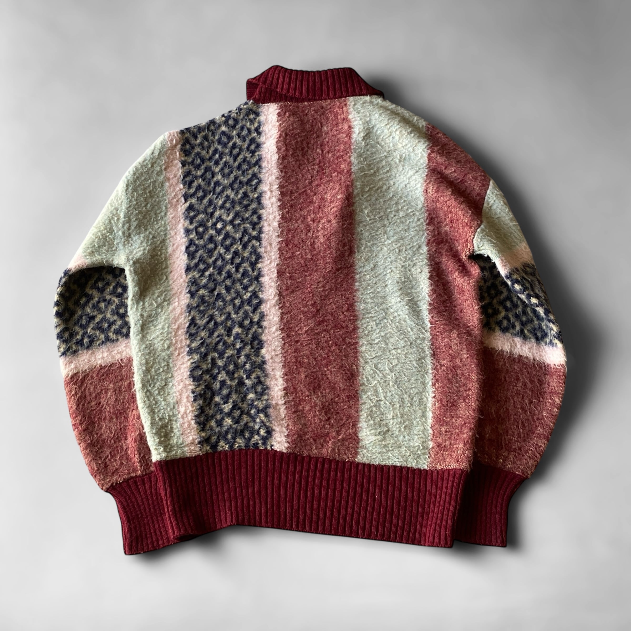 ヴィンテージモヘアのような毛足の長いシャギーニット(アクリル100)に、非常にセンスの良い好配色のクデザイン、丸みのある短丈ボックスなシルエットが素晴らしい一着。