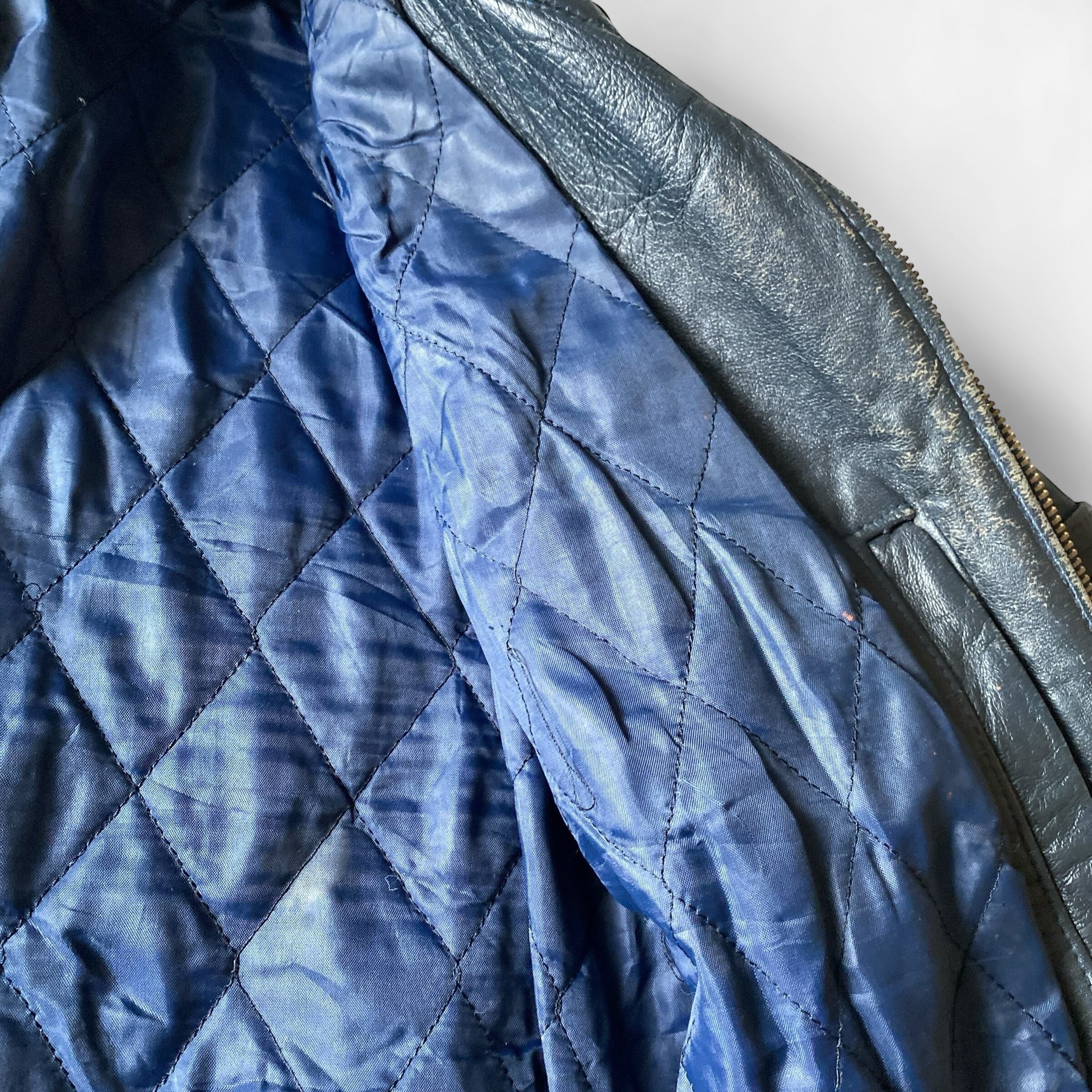 上品なダークネイビーブルーレザー(おそらく牛革)に、珍しいダイヤカットのキルティングライニング、短丈ボックスシルエットが非常に格好良い一着。