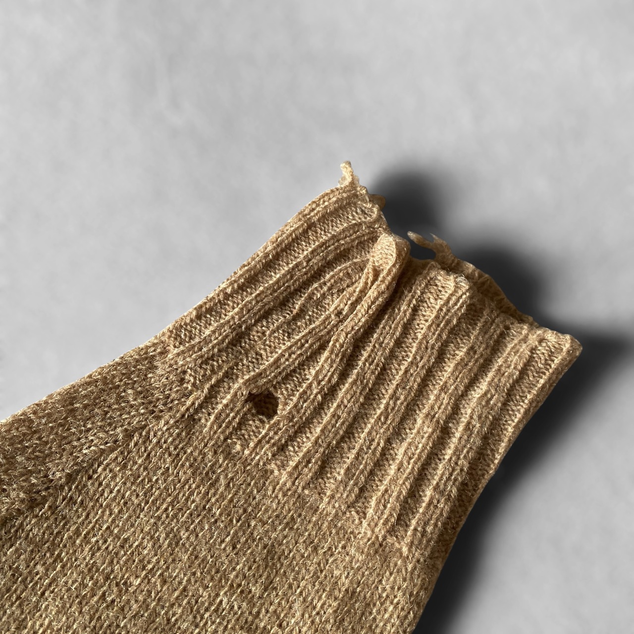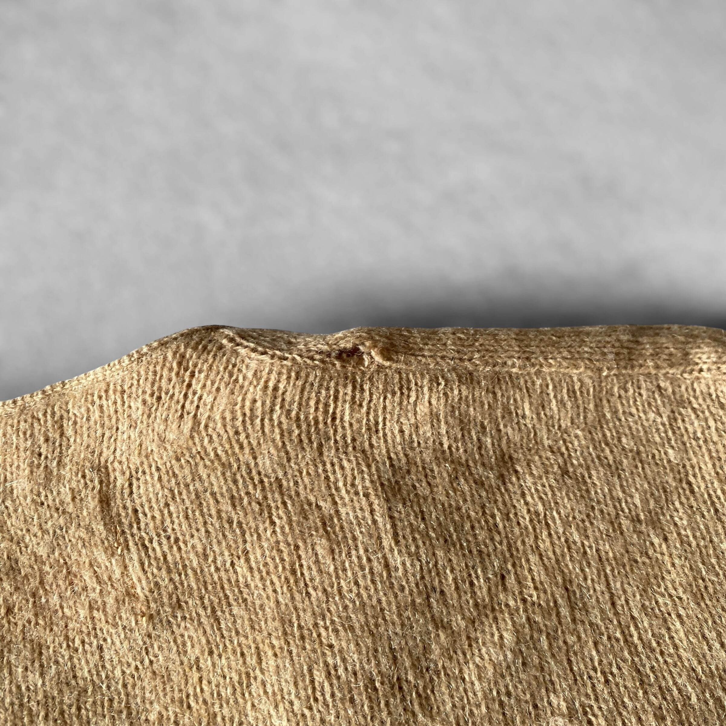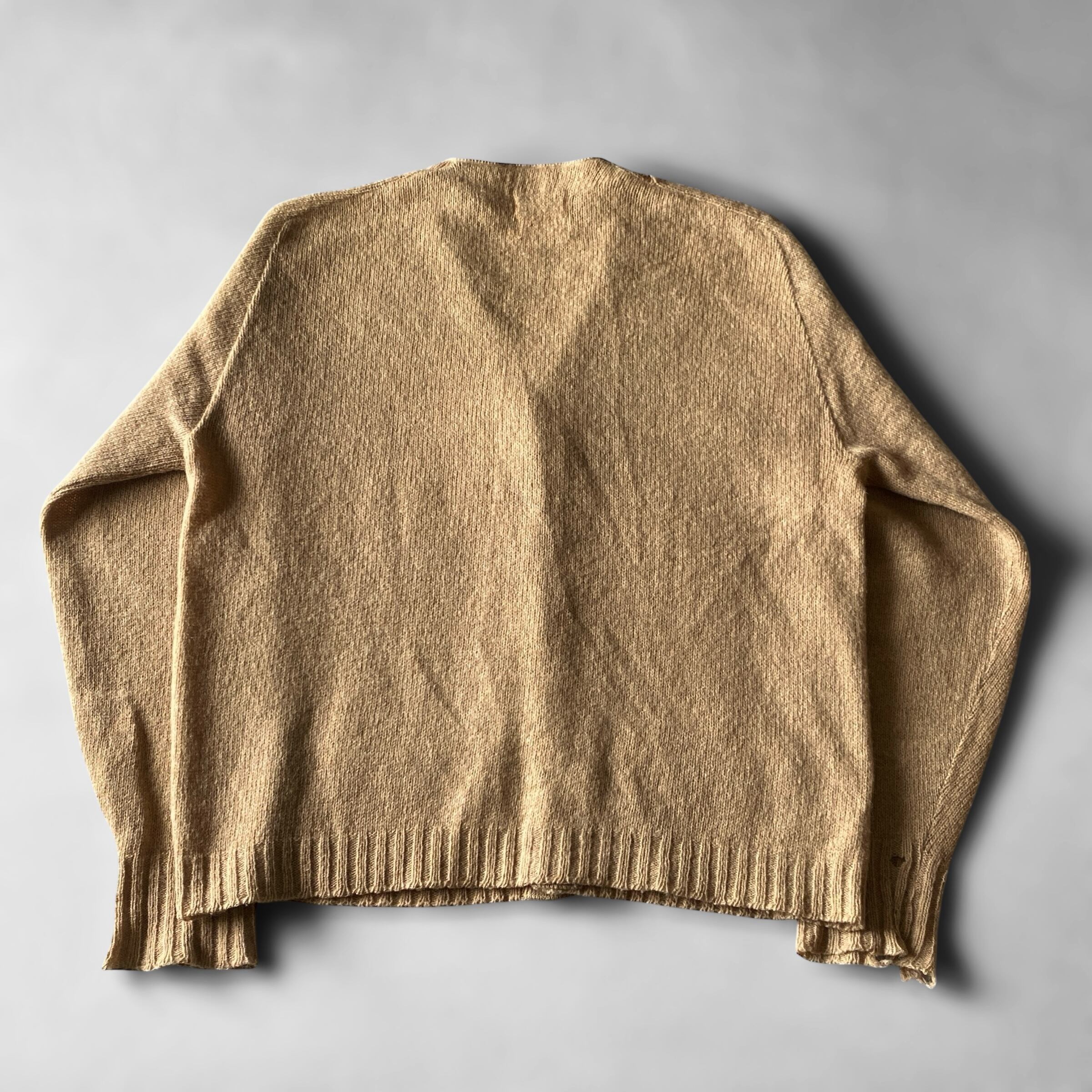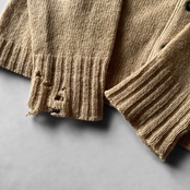 非常に風合いの良いシェットランドウール生地に、古いニットらしいサドルスリーブのディテール、ゆったりとした短丈ボックスシルエット、グランジな雰囲気のダメージ具合が非常に格好良い一着。