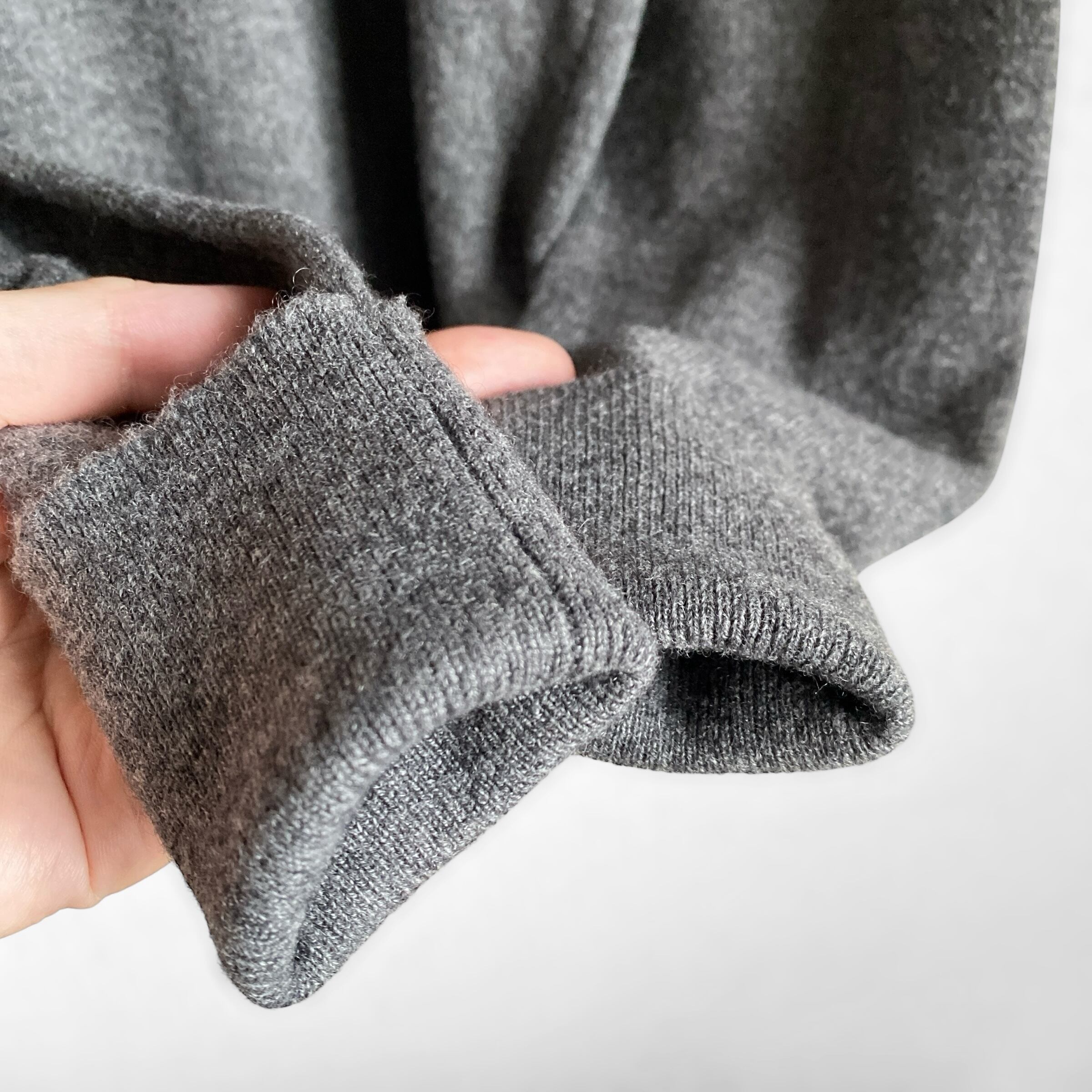 シンプルで合わせやすいダークグレー系カラー、内モンゴル製の特級カシミヤを使用した、滑らかで柔らかい極上の質感が大変素晴らしい一着。