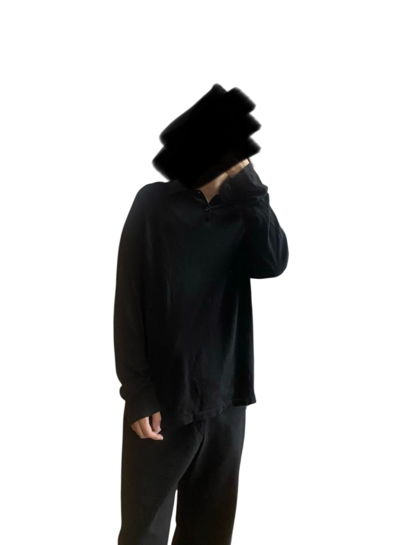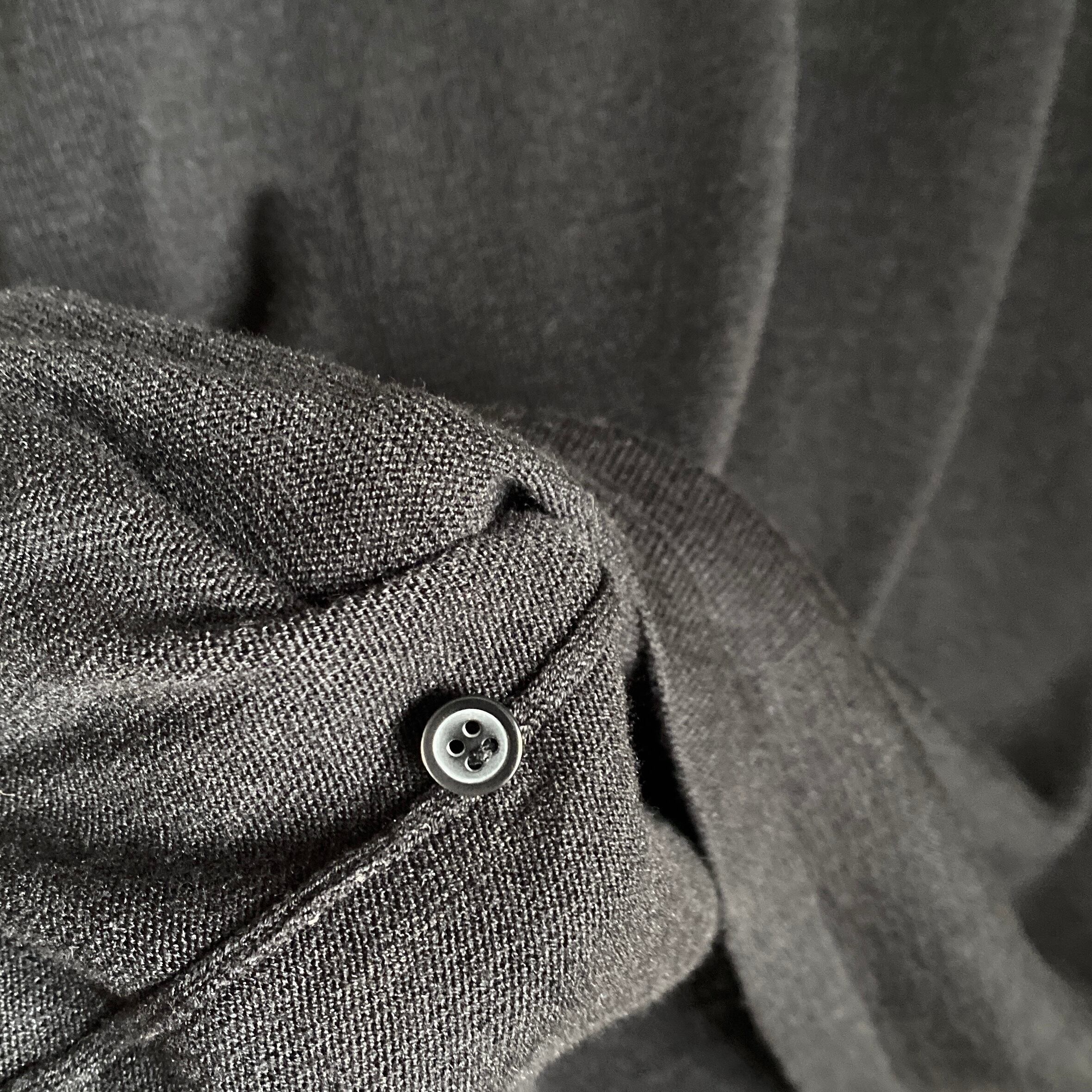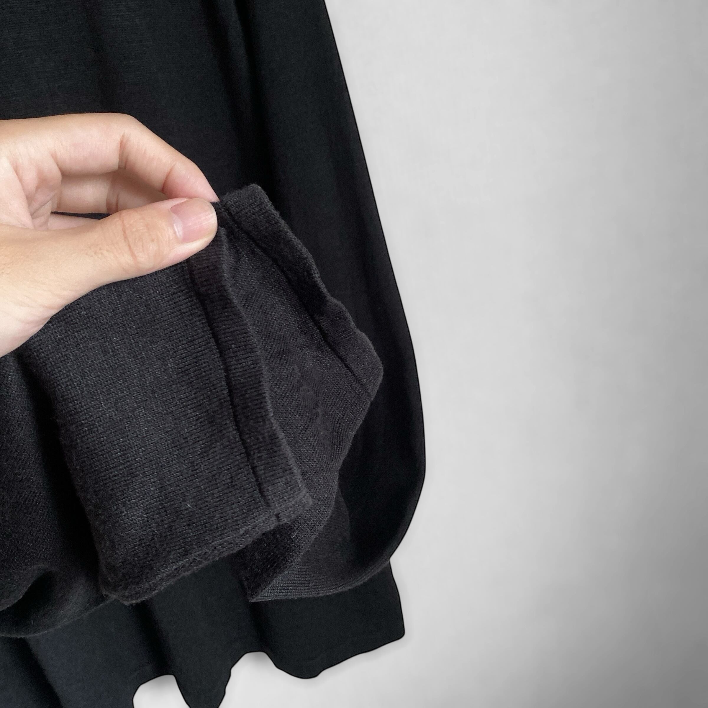 薄手のシルクコットンの、ややシャリっとした落ち感のある上品なニット地に、ブラックカラー、リブのつかないストンと落ちるシルエットが非常に格好良い一着。