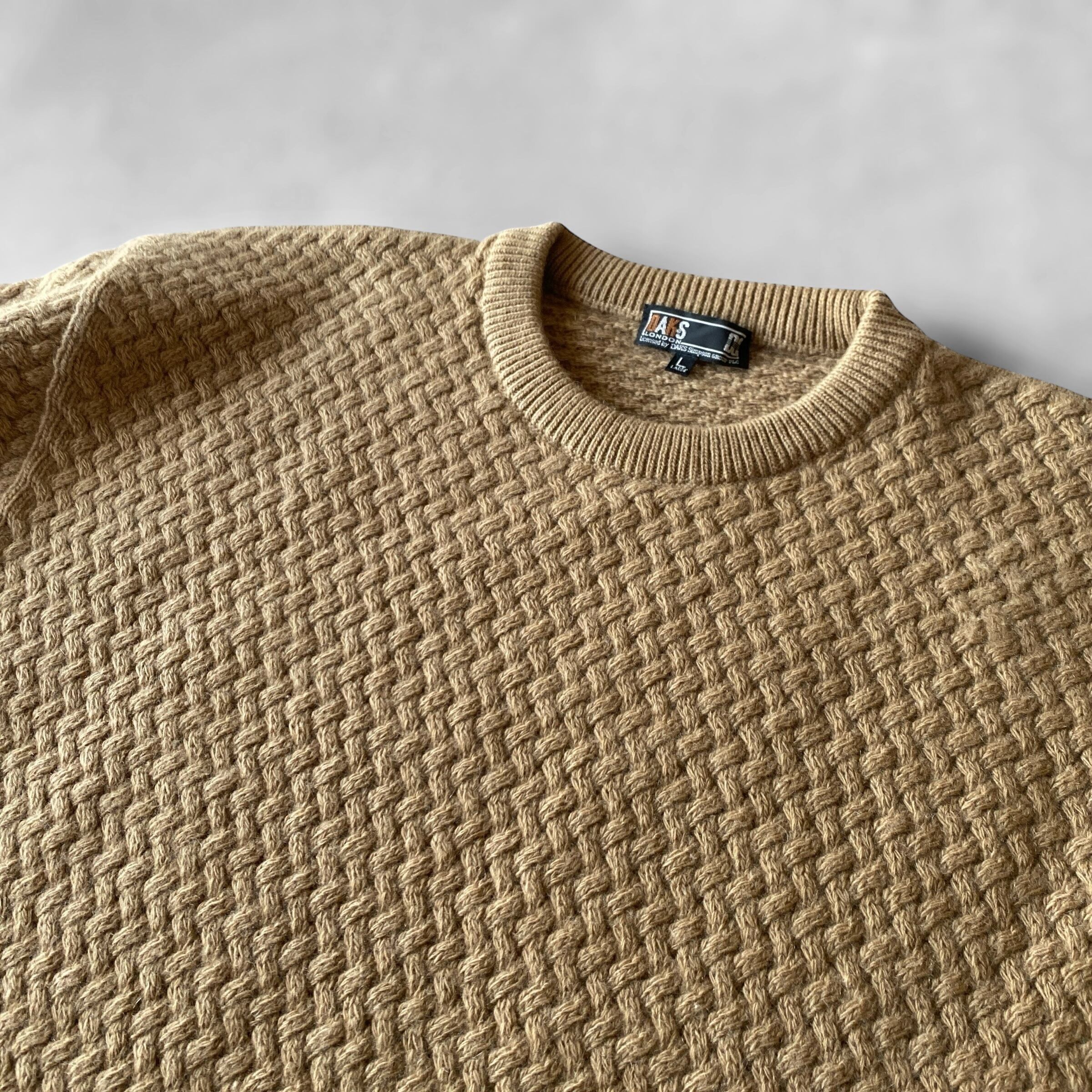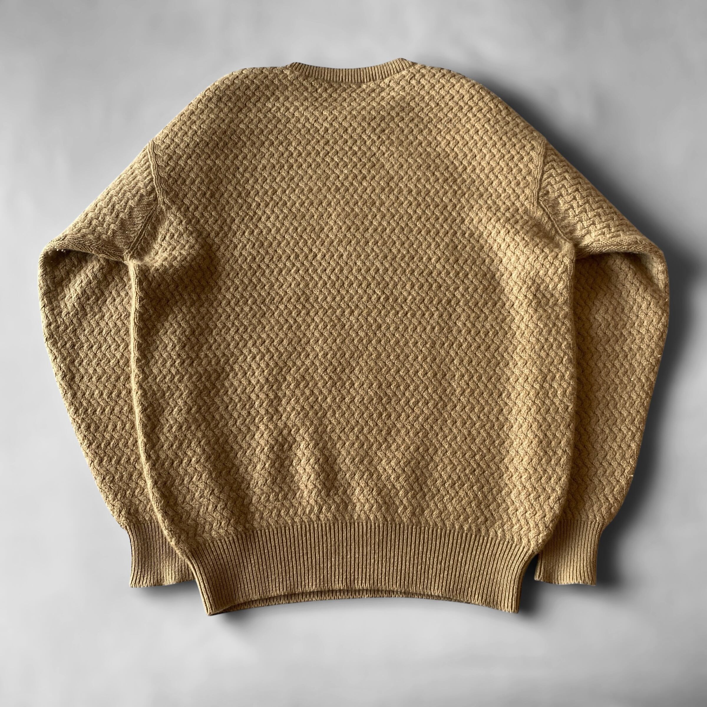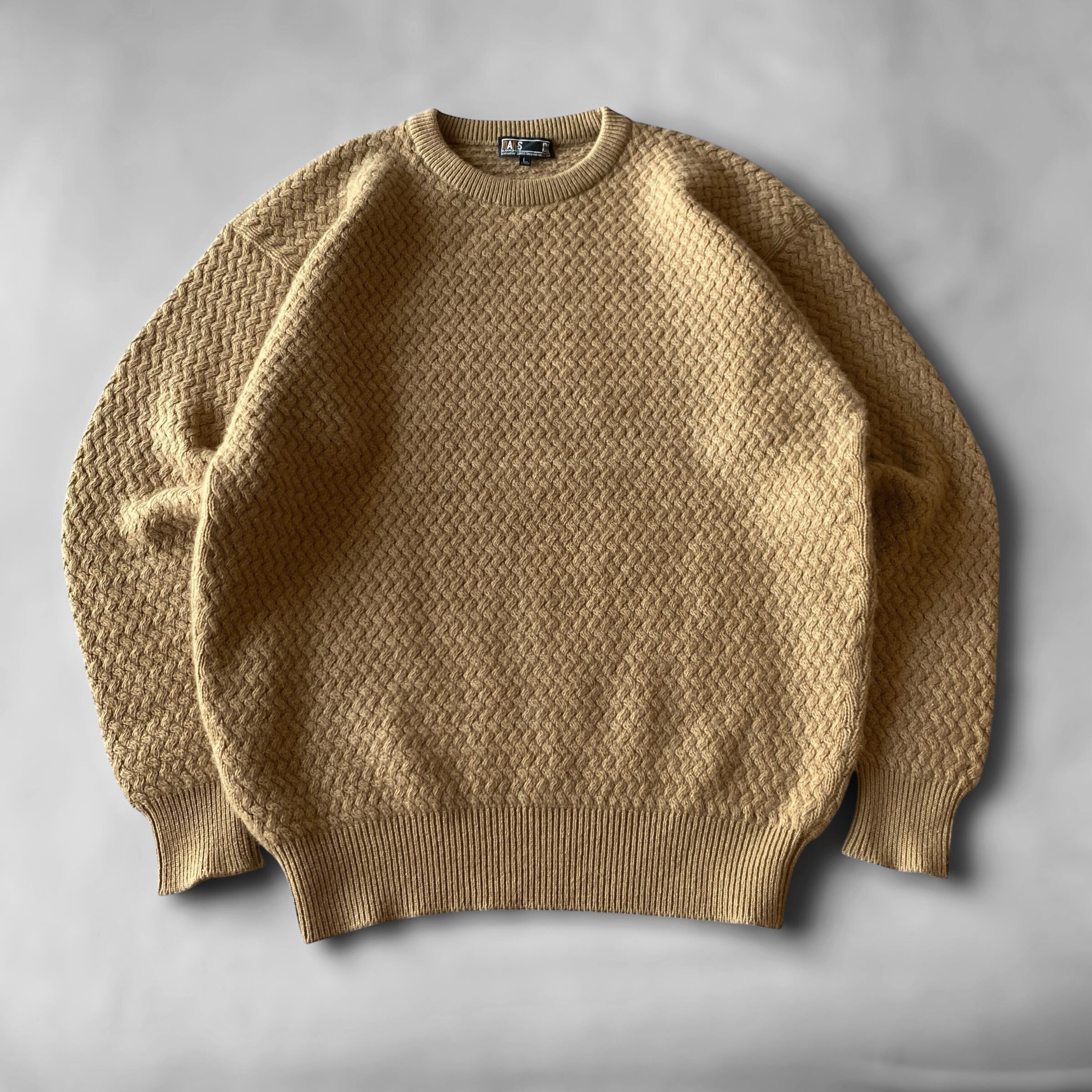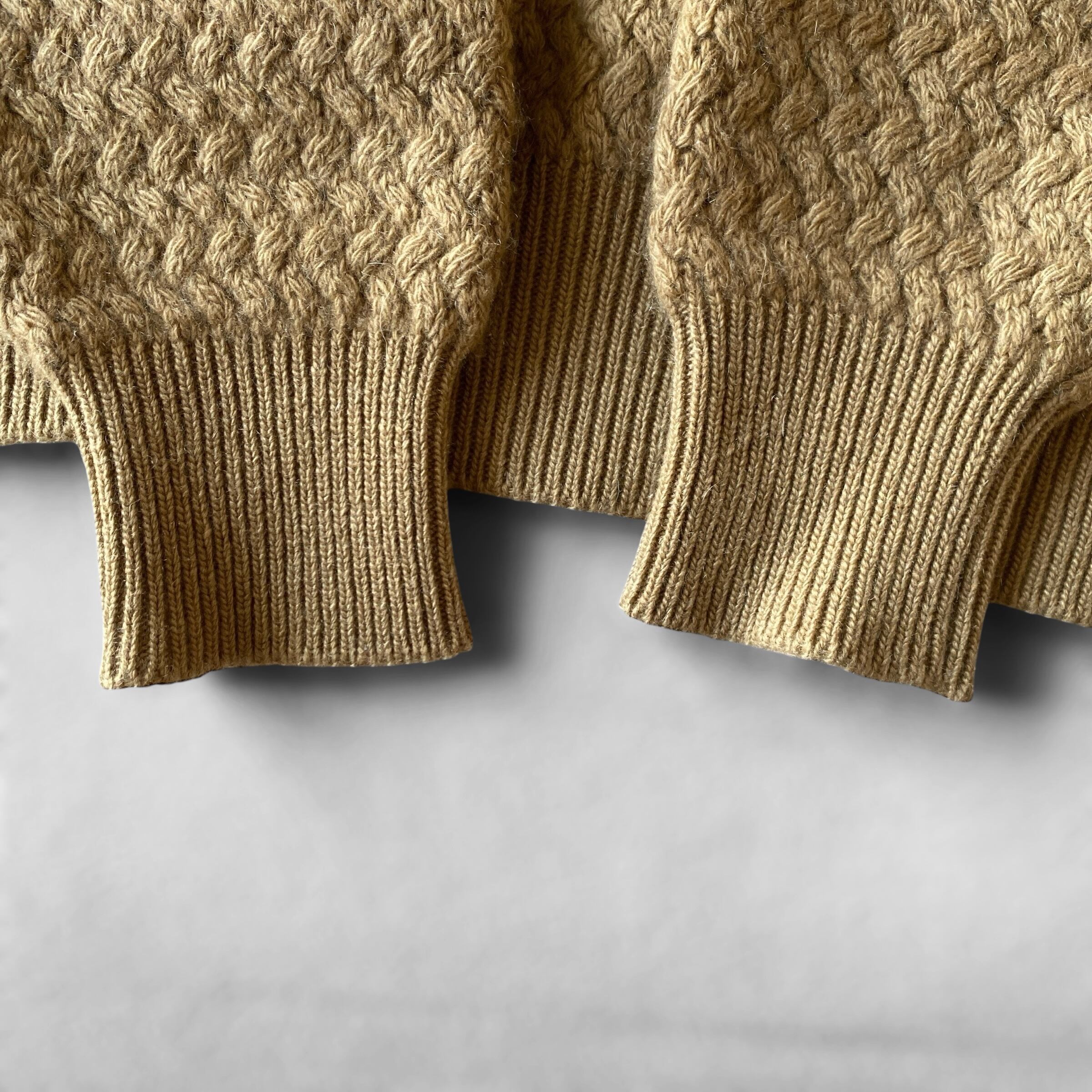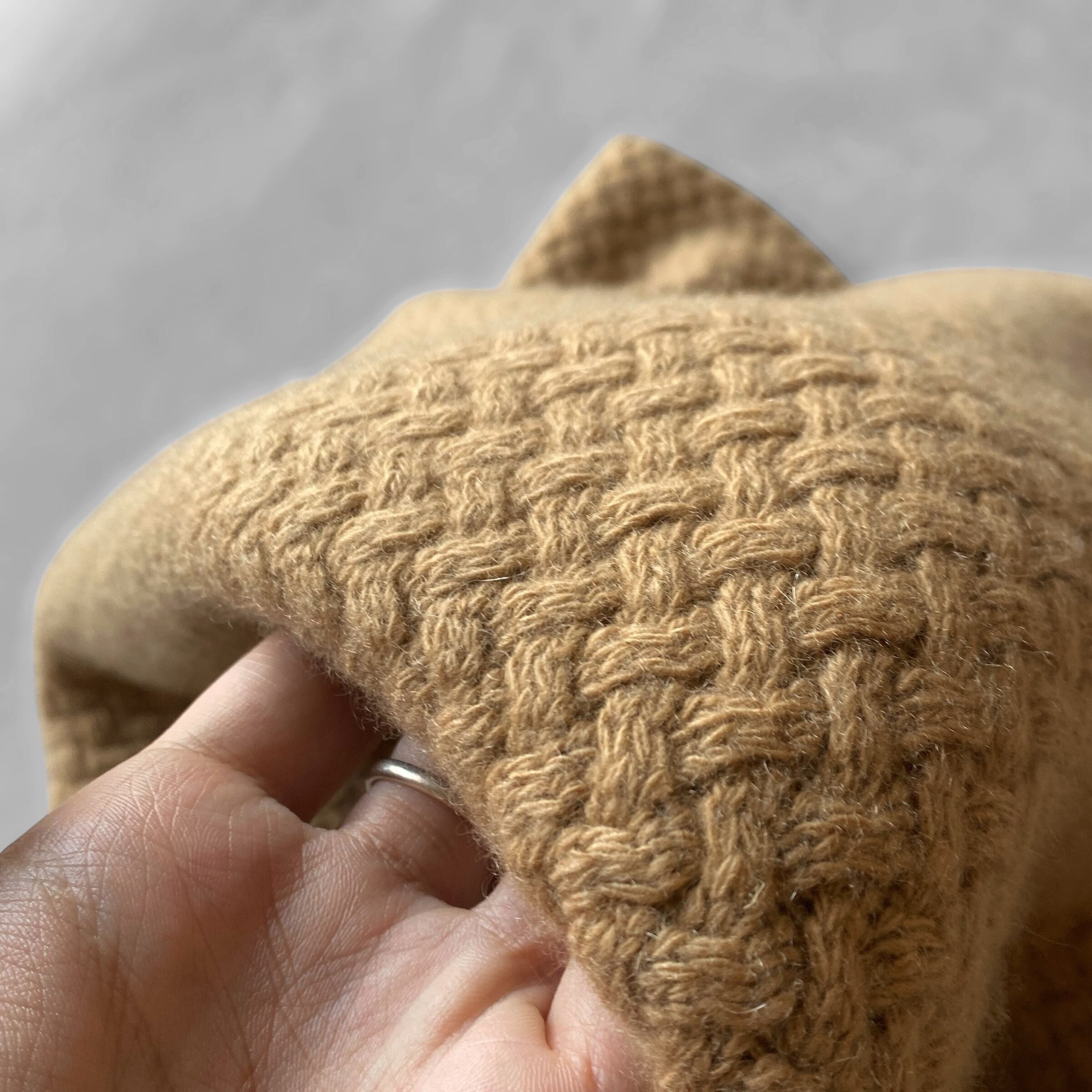 肉厚で柔らかい極上のカシミヤニットに、上品なキャメルブラウンカラー、単色ながら奥行きのある織柄、丸みのあるゆったりとしたボックスシルエットが素晴らしい一着。