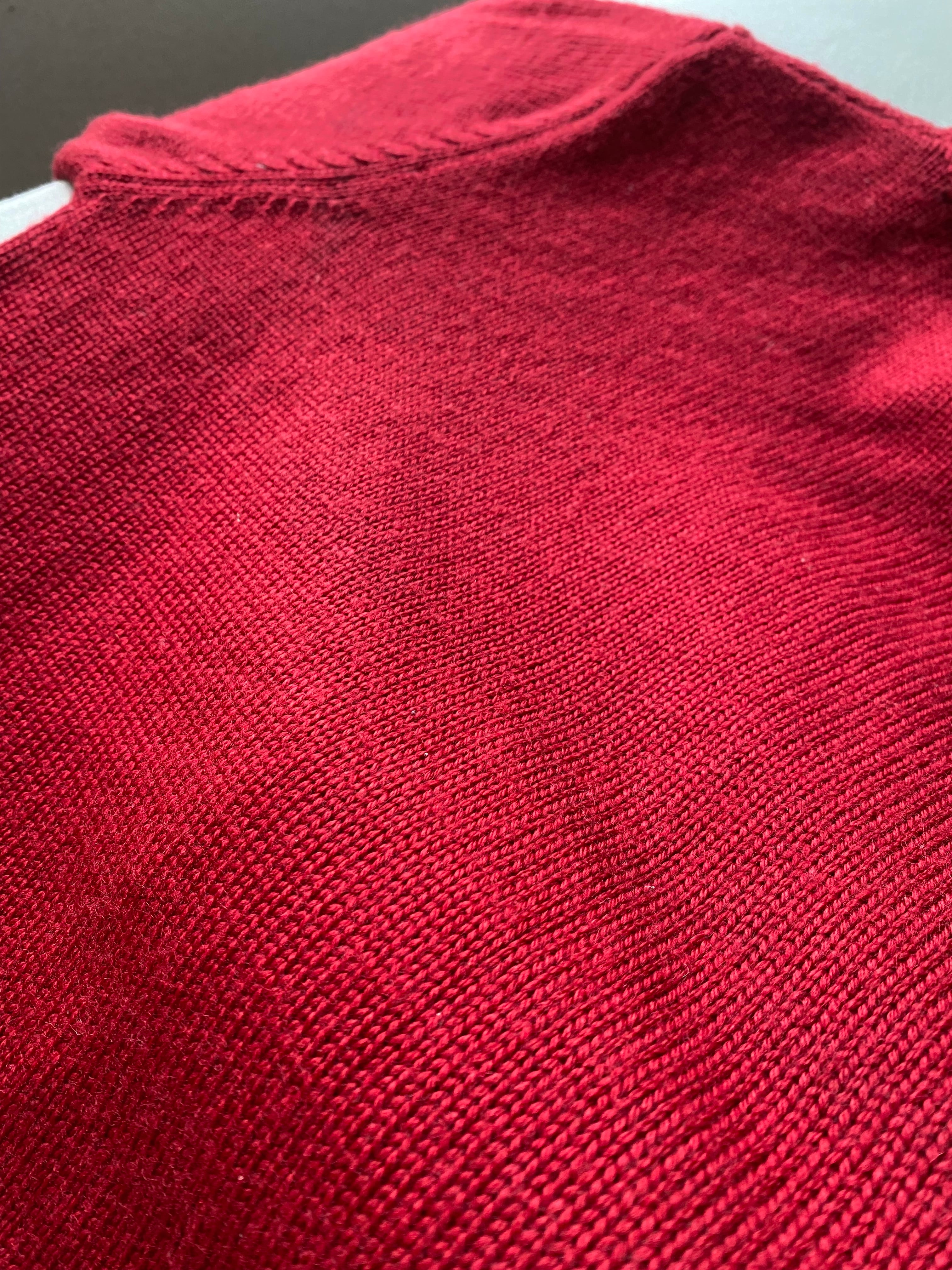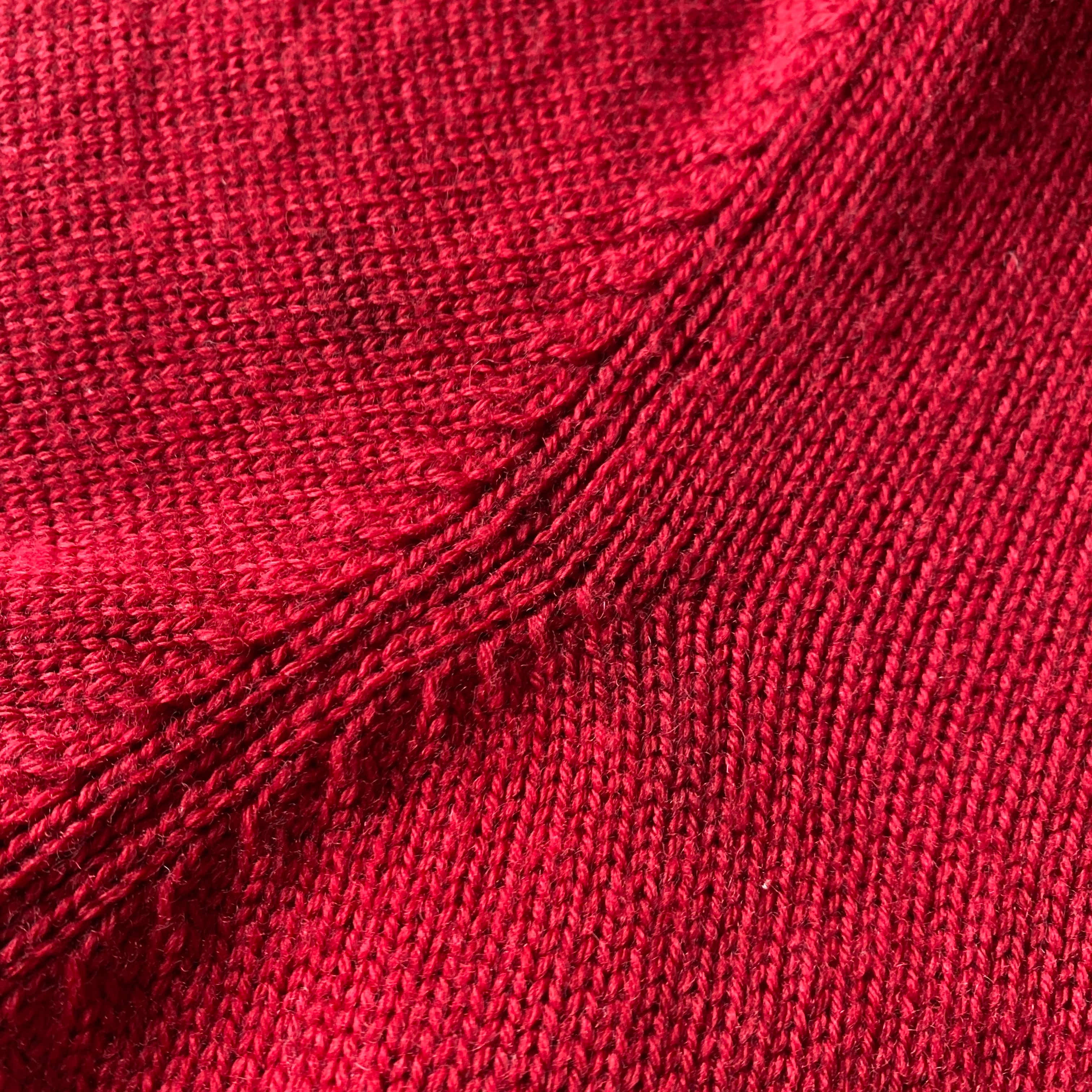 深い赤の上品な色目に、目の詰まったウールニットの上質な生地感、arctery'xやrick owensを彷彿とさせる斜めジップのデザインが非常に素晴らしいです。