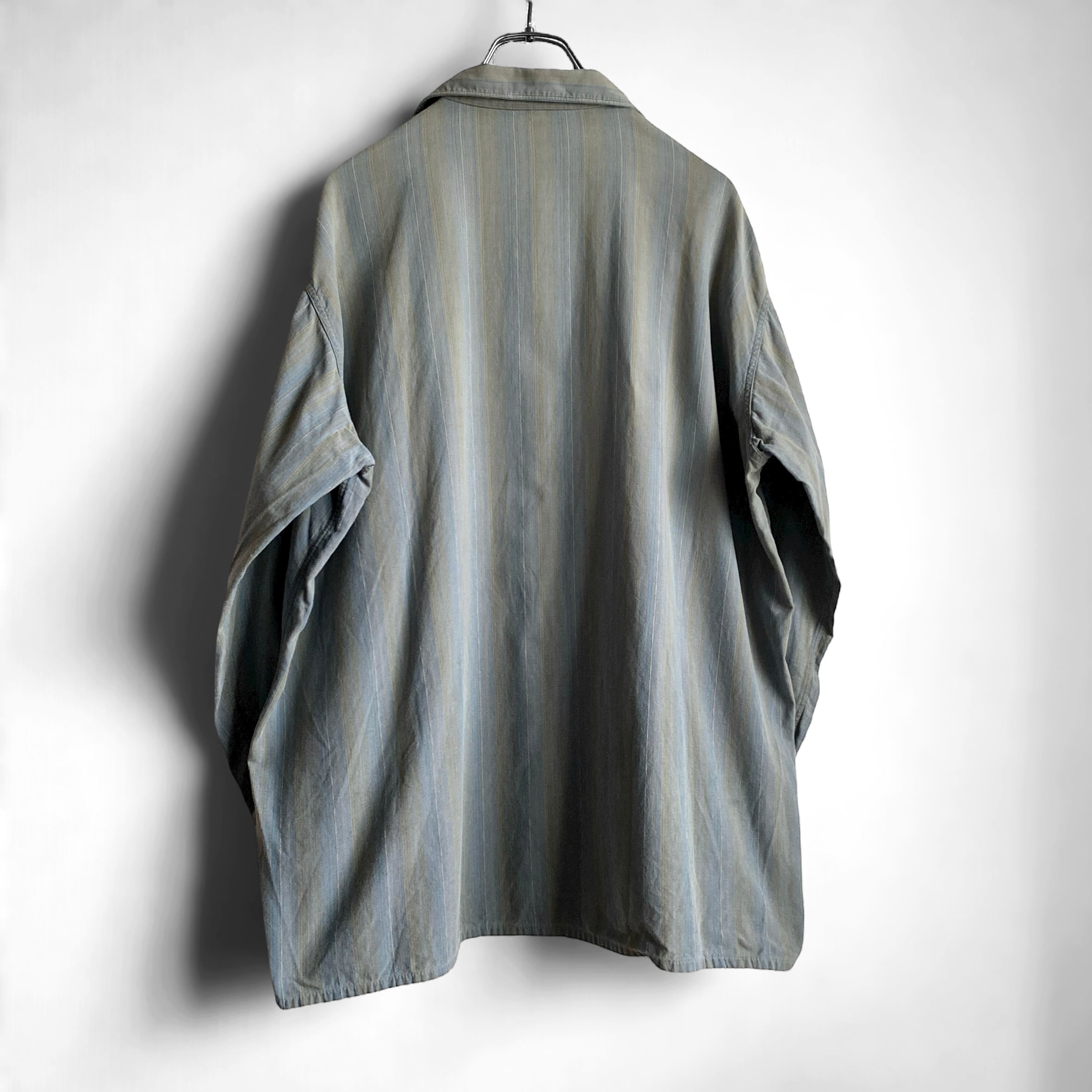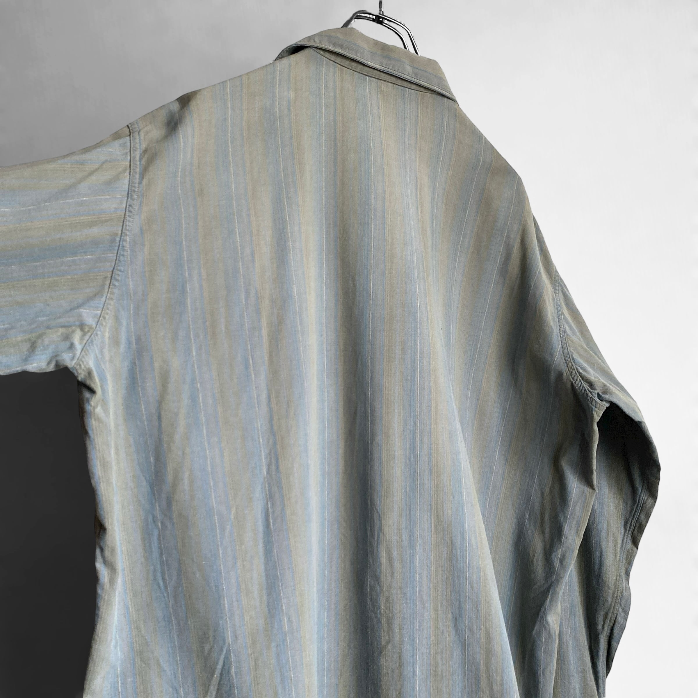 古いコットン特有の水分が抜けたような良い意味で枯れた生地に、ニュアンスカラーをベースとしたシャドーストライプ、ゆったりとしたボックスシルエットが非常に格好良い一着。