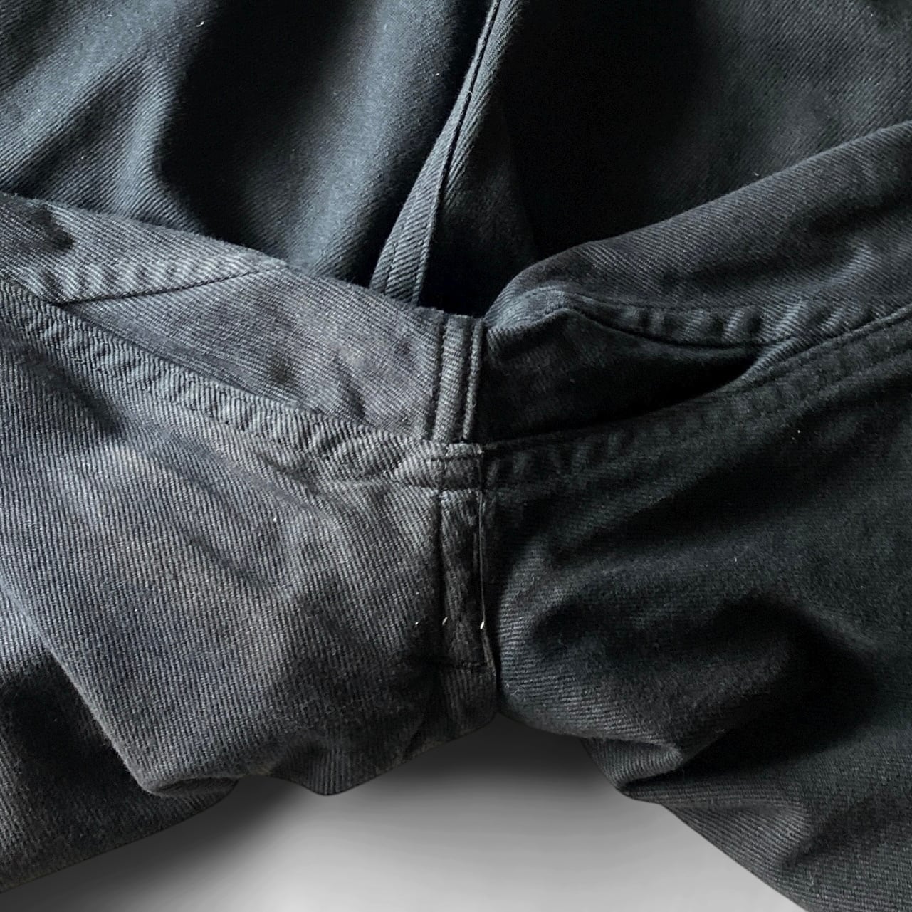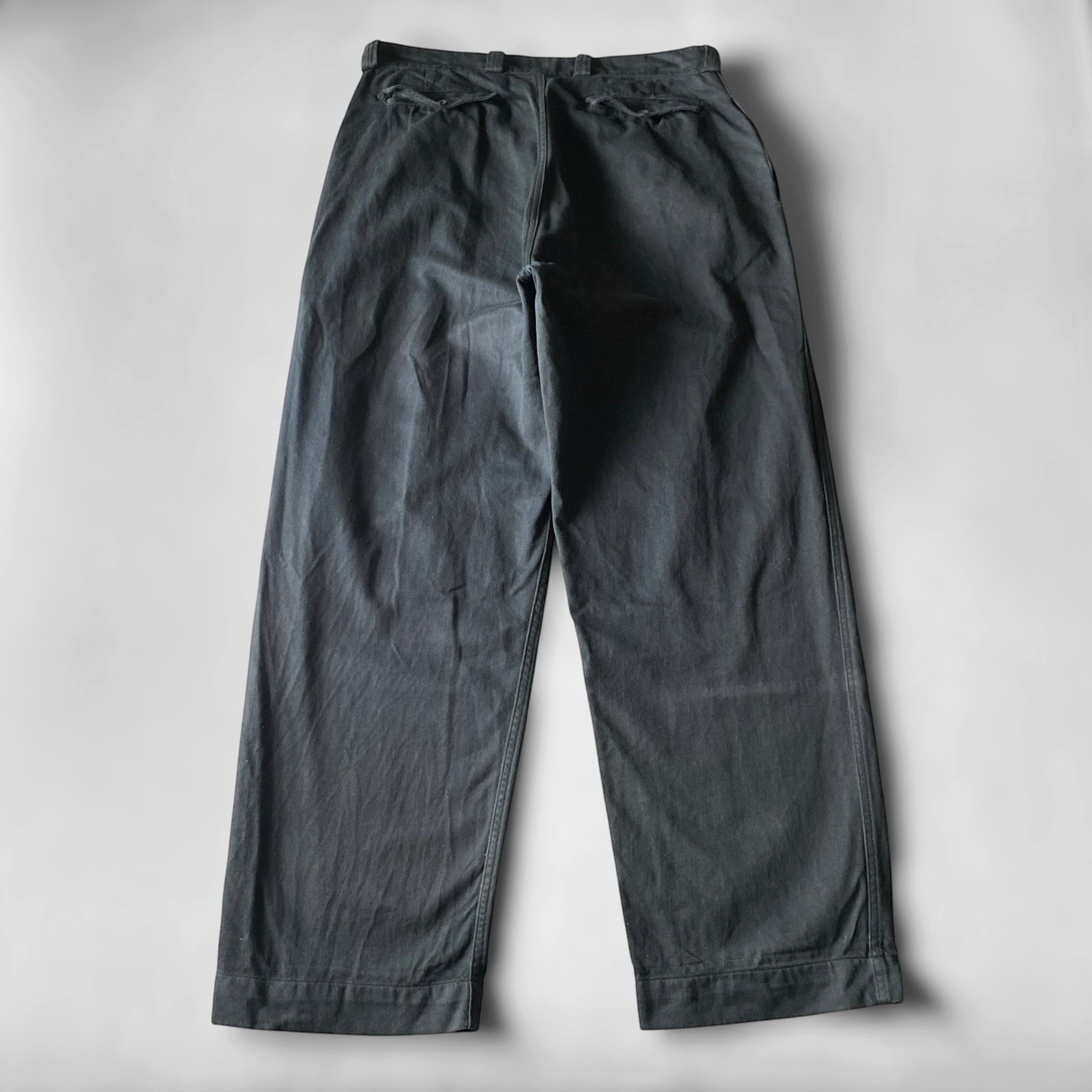 真っ黒というよりかは鉄焙煎っぽい墨黒グレーのようなイメージで合わせやすい綺麗な色目、2タックでゆとりある腰回り、深めの股上のワイドシルエットが非常に格好良い一着。