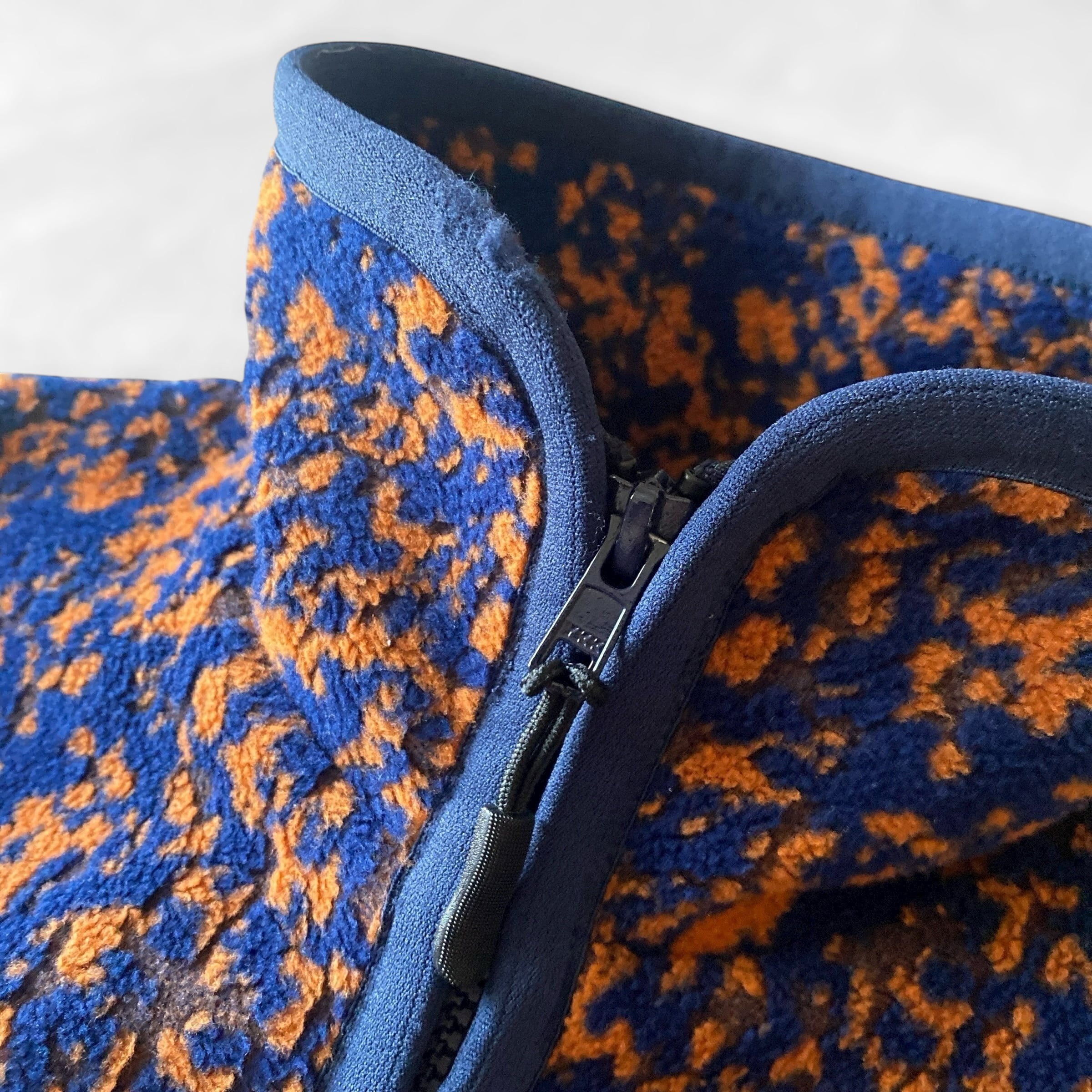 ネイビー×オレンジの美しい配色の総柄、ふかっとした上質なフリース生地、ダブルジップ、ベーシックで癖のないシルエットが大変素晴らしい一着。