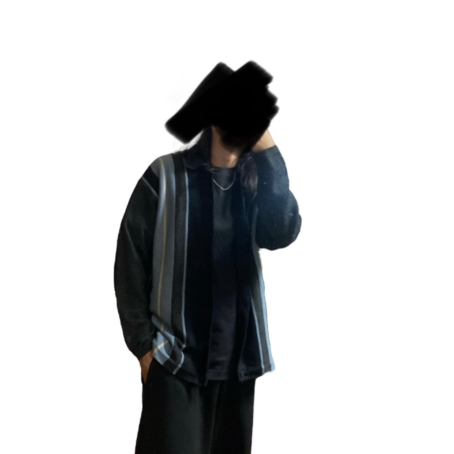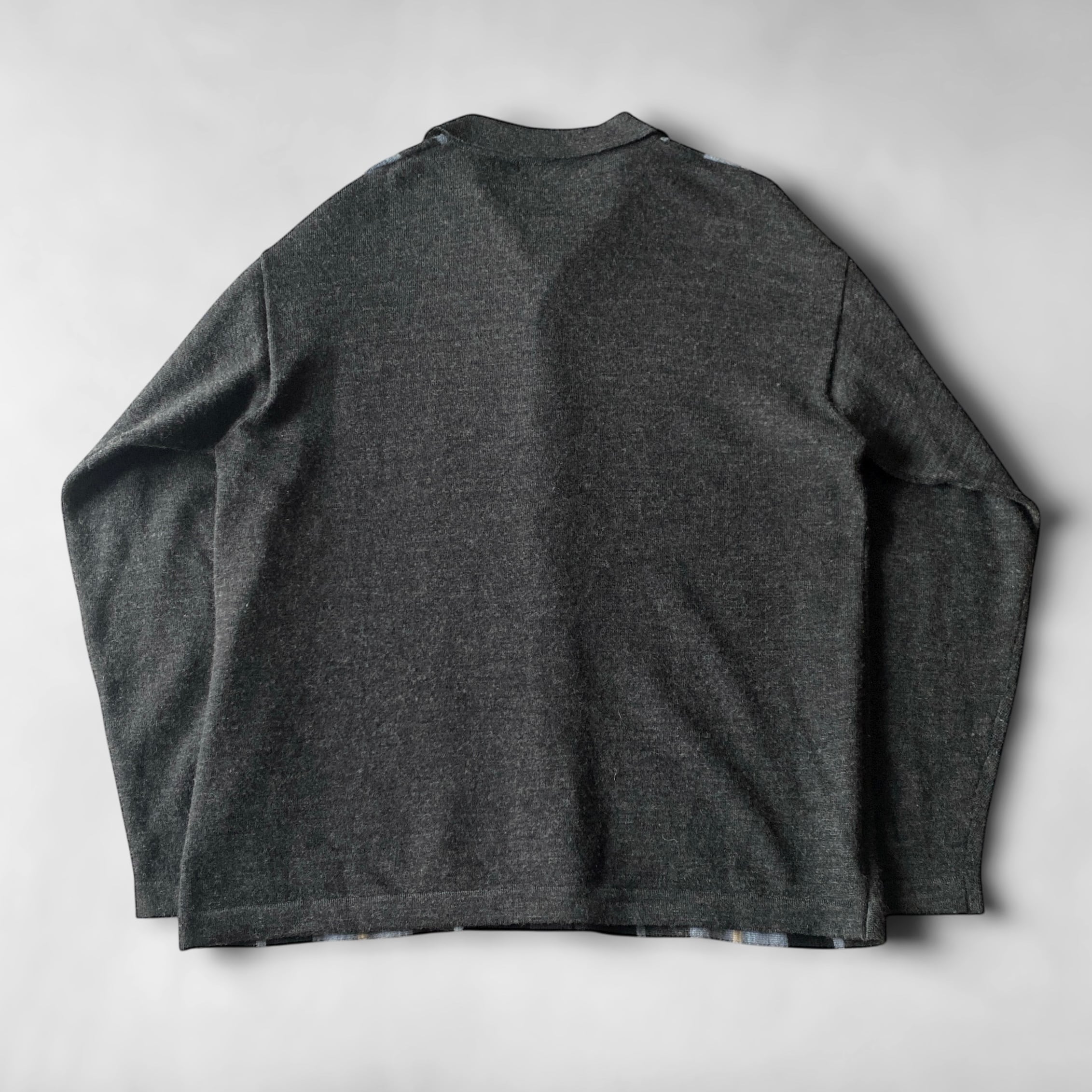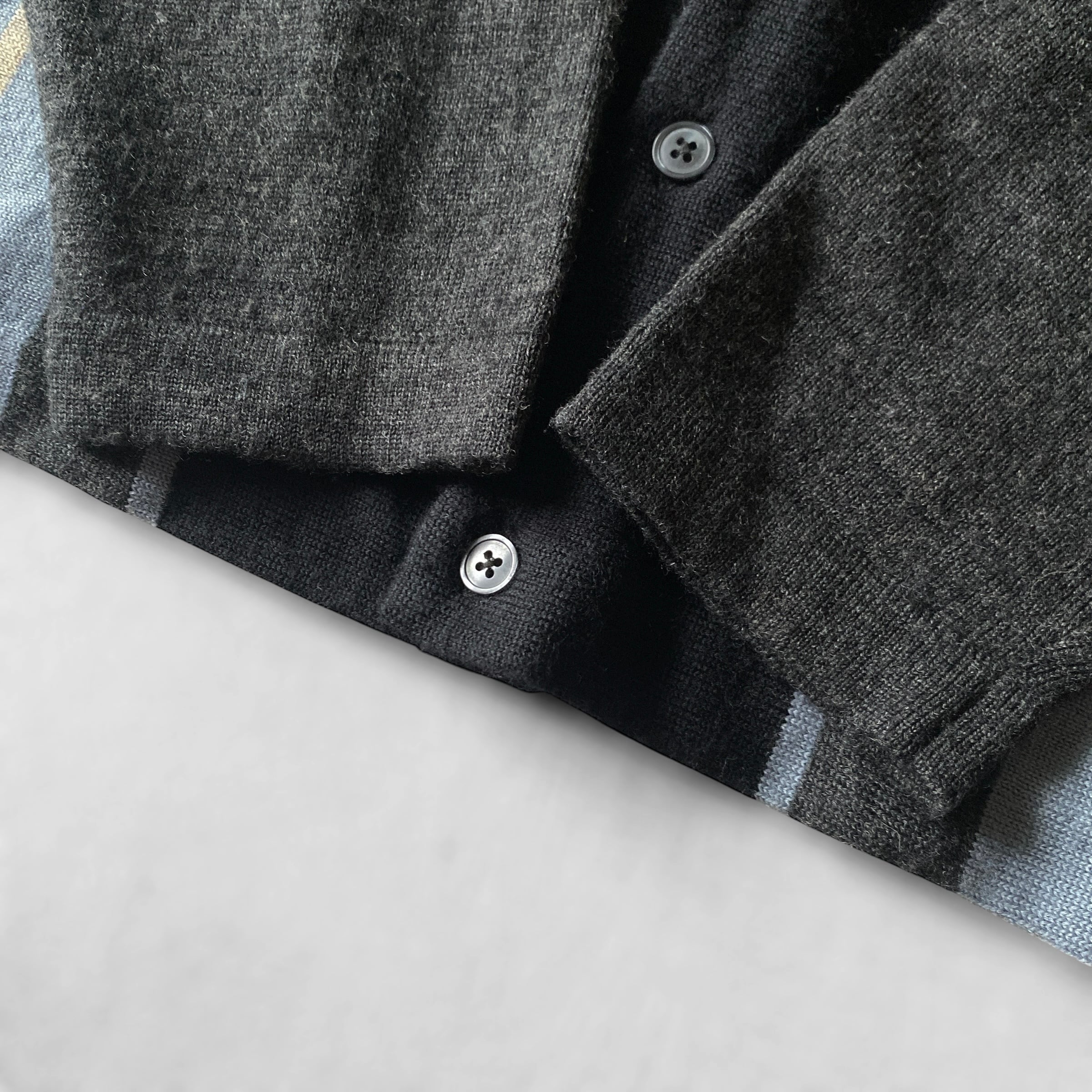 程よく肉厚で上質なメリノウールのミドルゲージニットに、ブラック×グレー×ライトブルー×クリームの上品な配色、ゆったりとしたボックス目なシルエットが非常に格好良い一着。