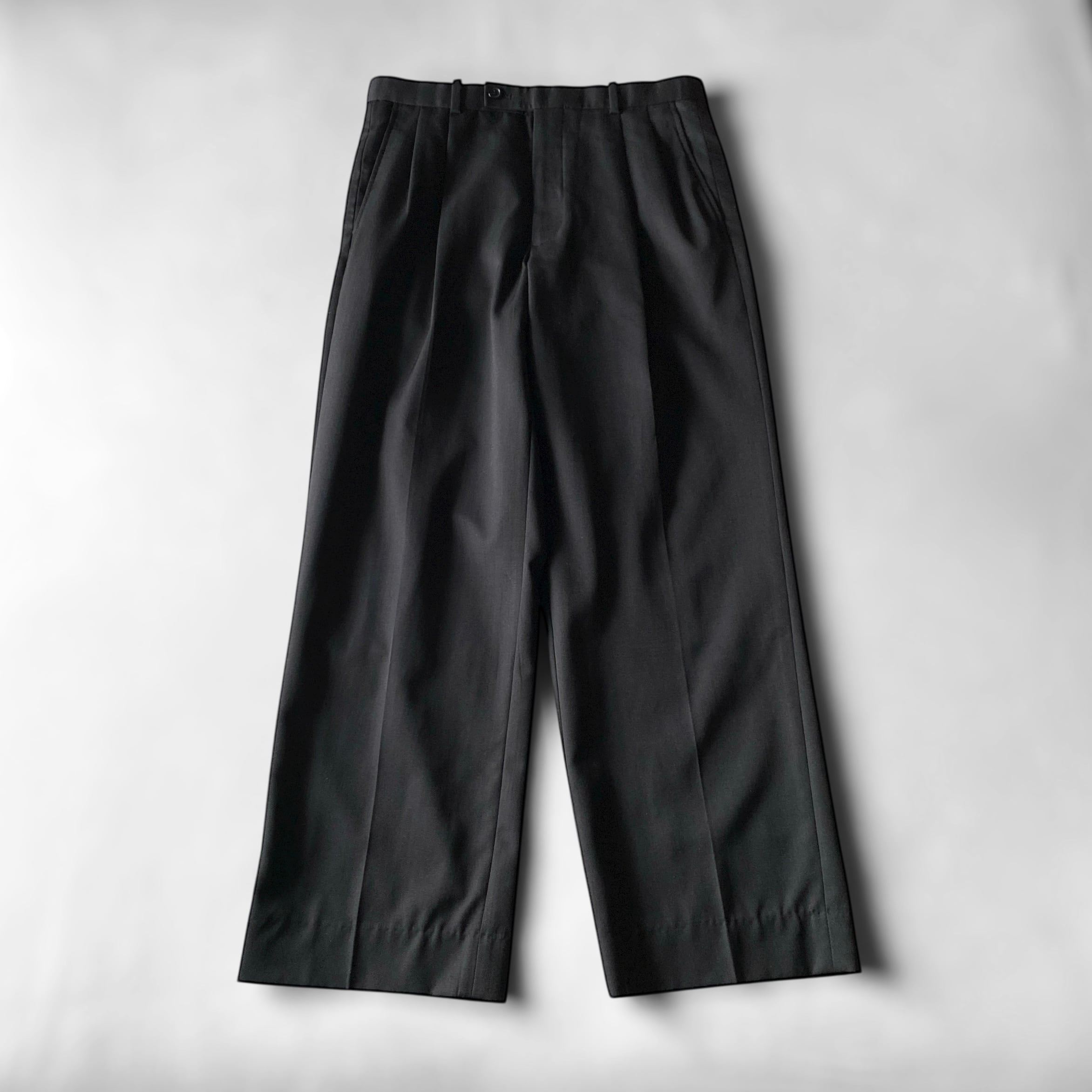 合わせやすいブラックカラーに、比較的薄手でサラッとしたハリ感のある上質なウールギャバジン生地、テーパードの弱いゆったりとしたストレートシルエットが格好良い一本。