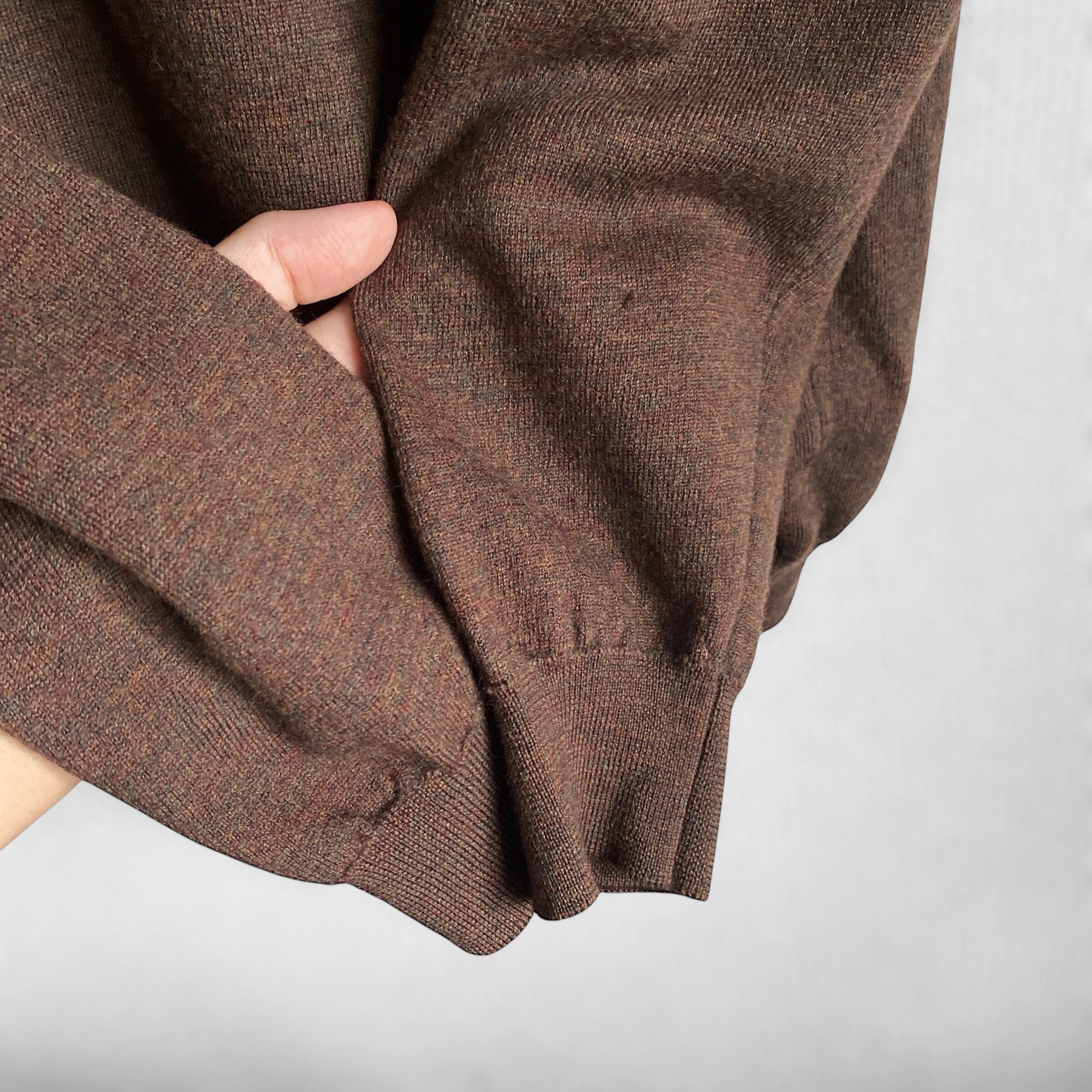 上品なメランジダークブラウンカラーに、もちっとした上質なミドルゲージニット、丸みのあるボックスシルエットが非常に格好良い一着。