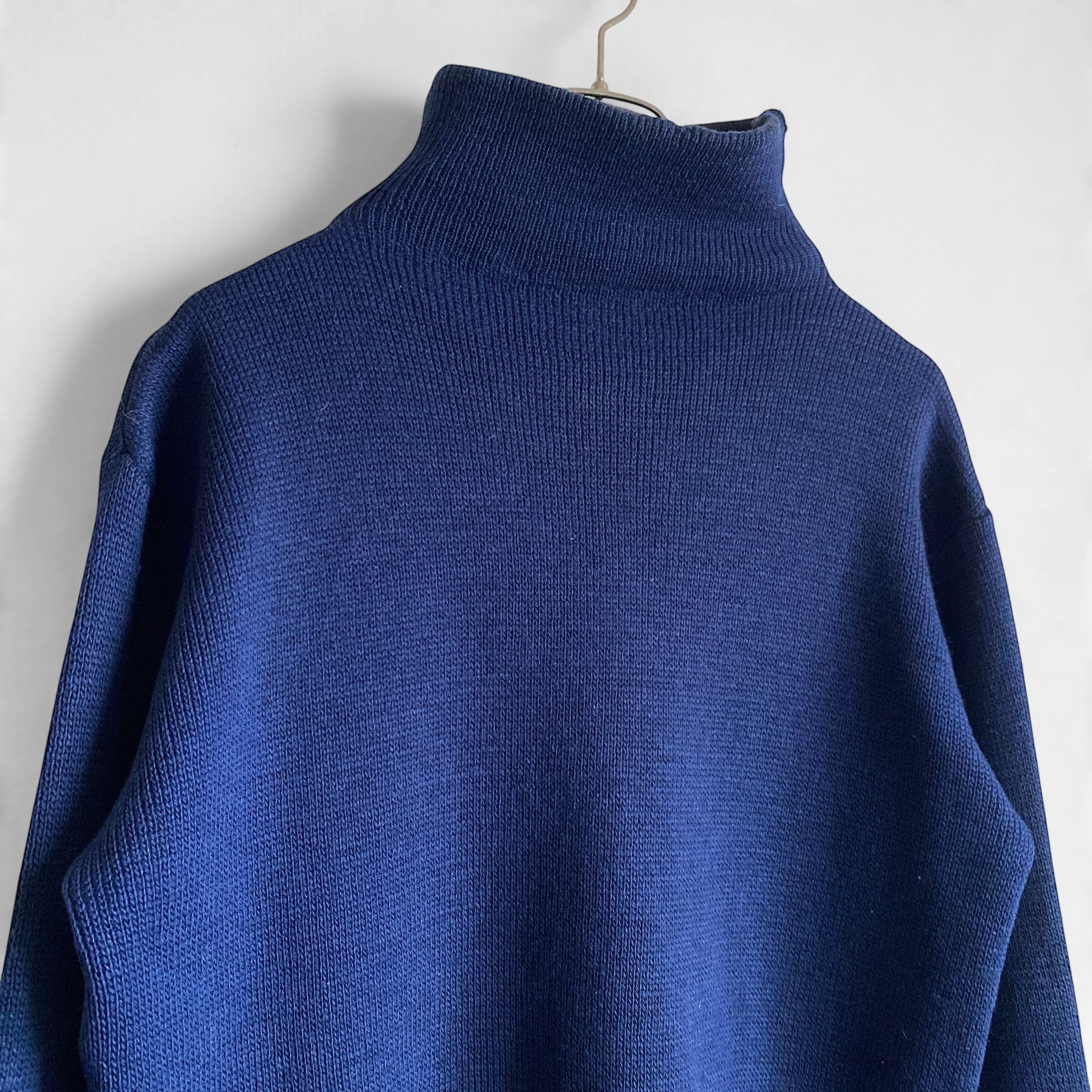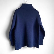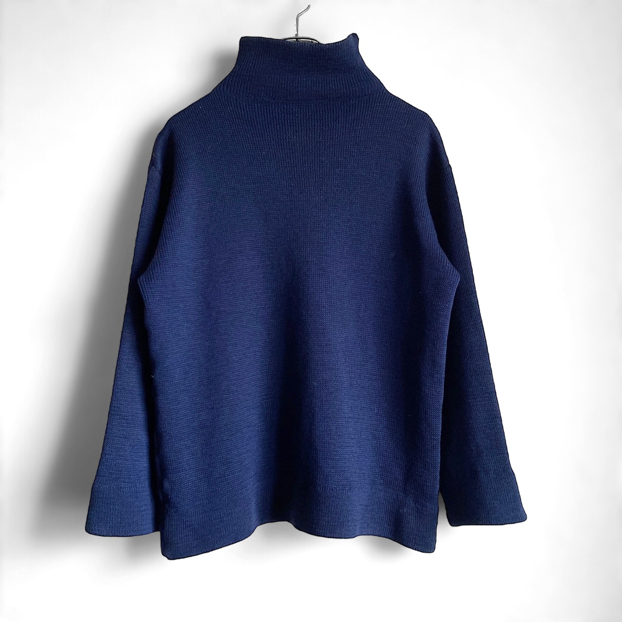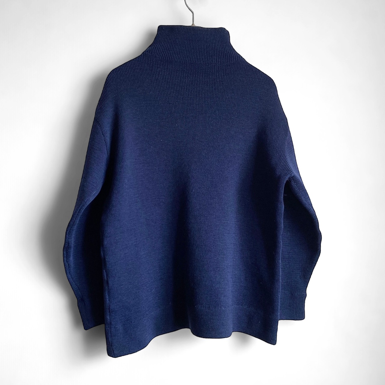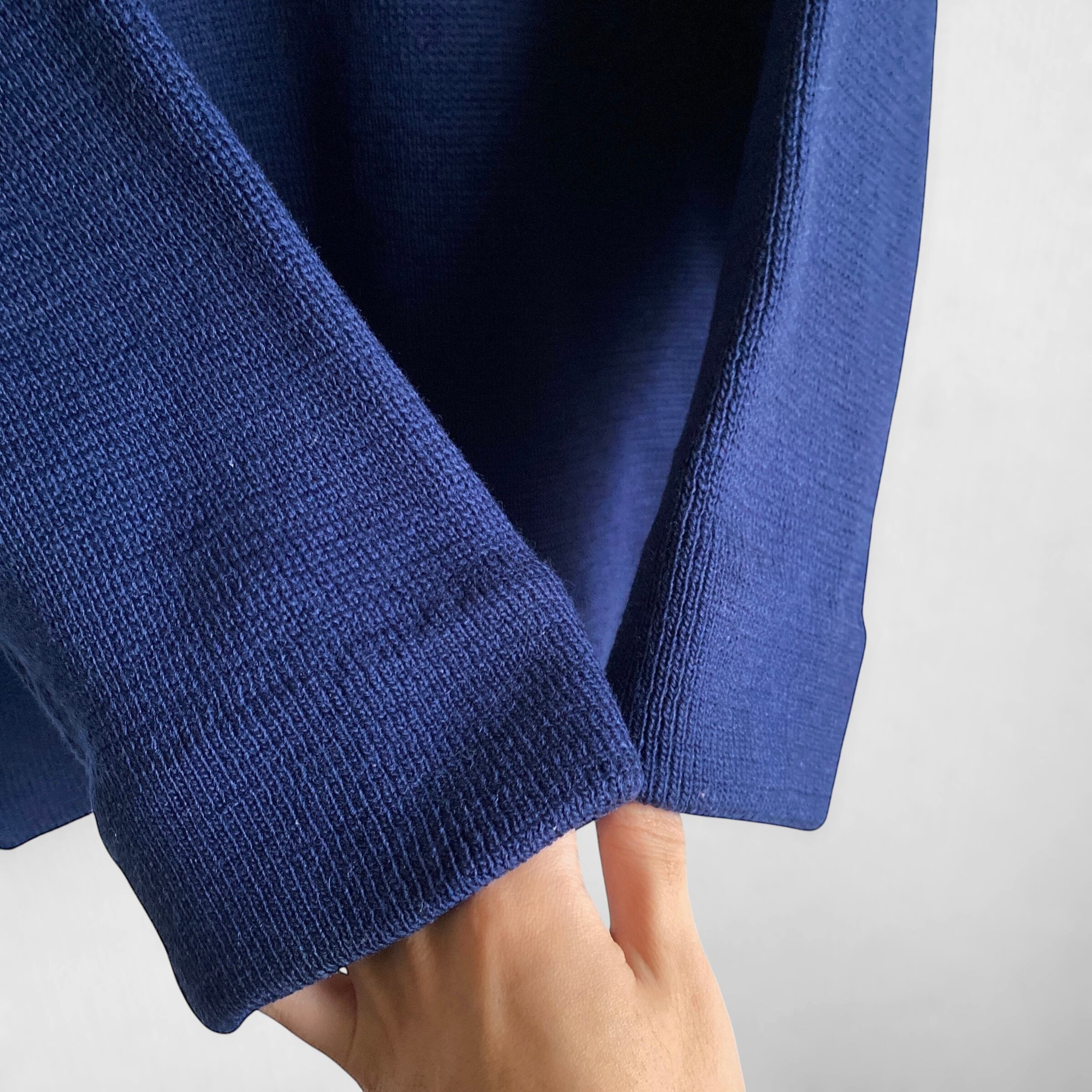 深みのある上品なネイビーカラーに、目の詰まった肉厚なミドルゲージのウールニット、フィッシャーマンスモックのような7部丈で袖口広めのシルエットが非常にかわいい一着。