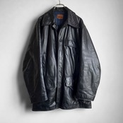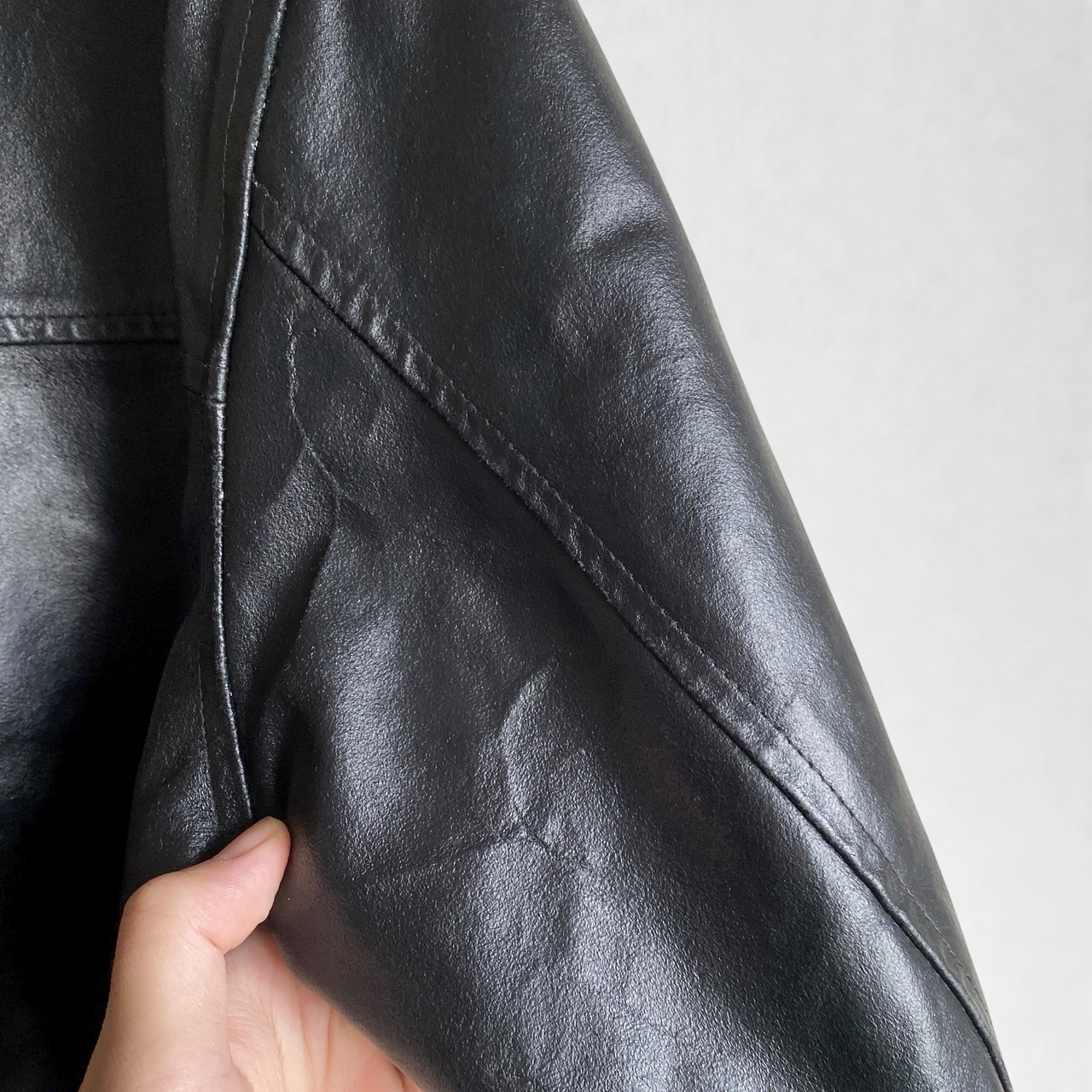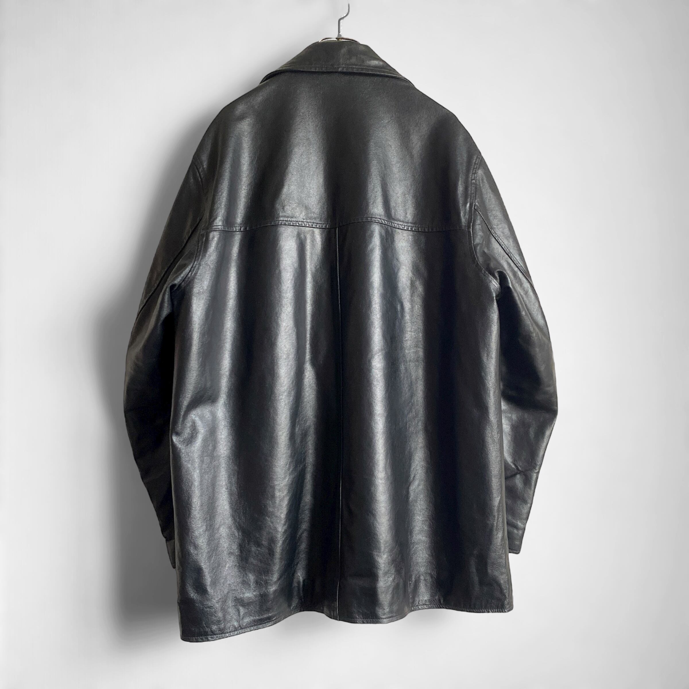 比較的薄手で無骨な雰囲気のブラックレザーに(おそらく牛革)、やや大きめの襟でゆったりとしたミニマルなデザインが非常に格好良い一着。
