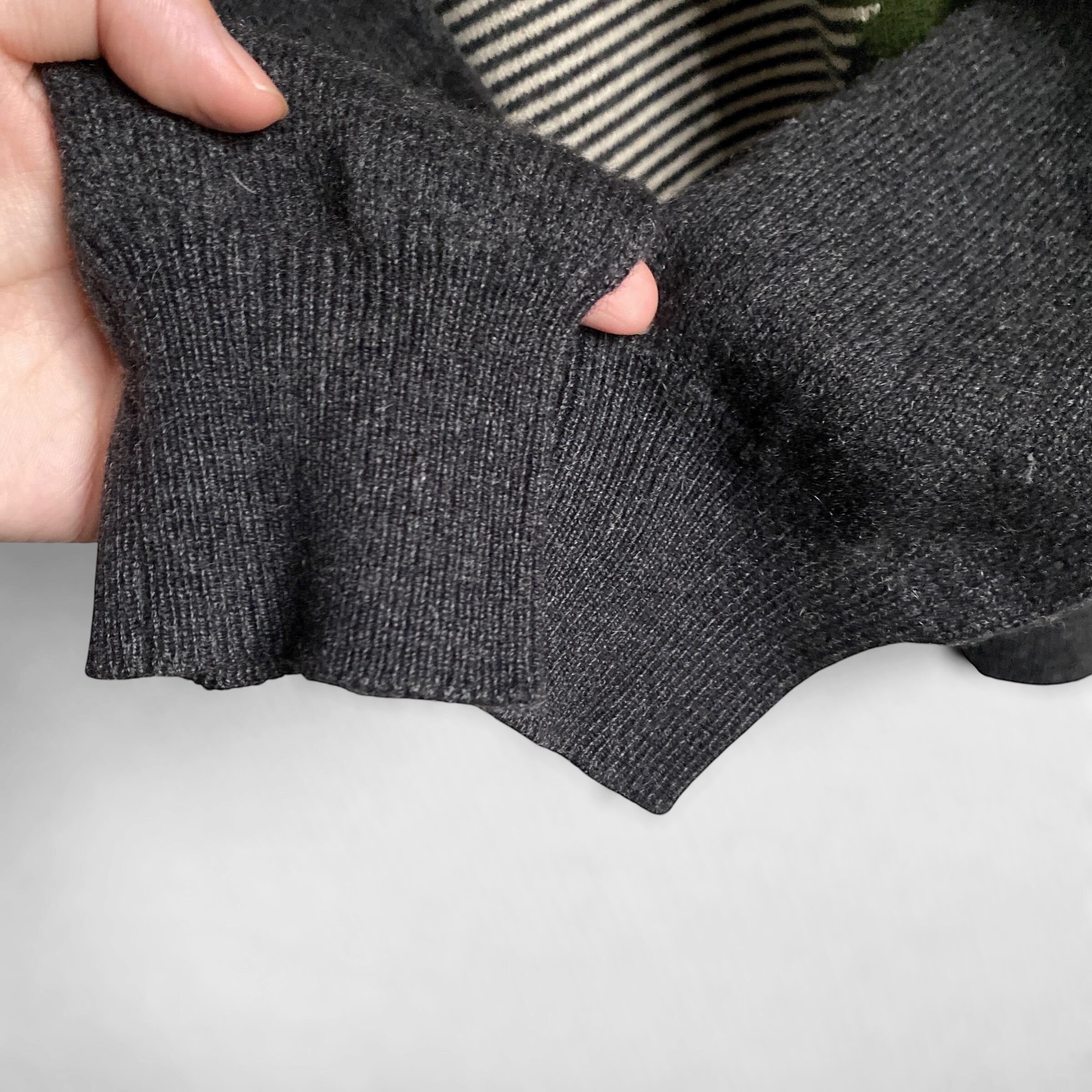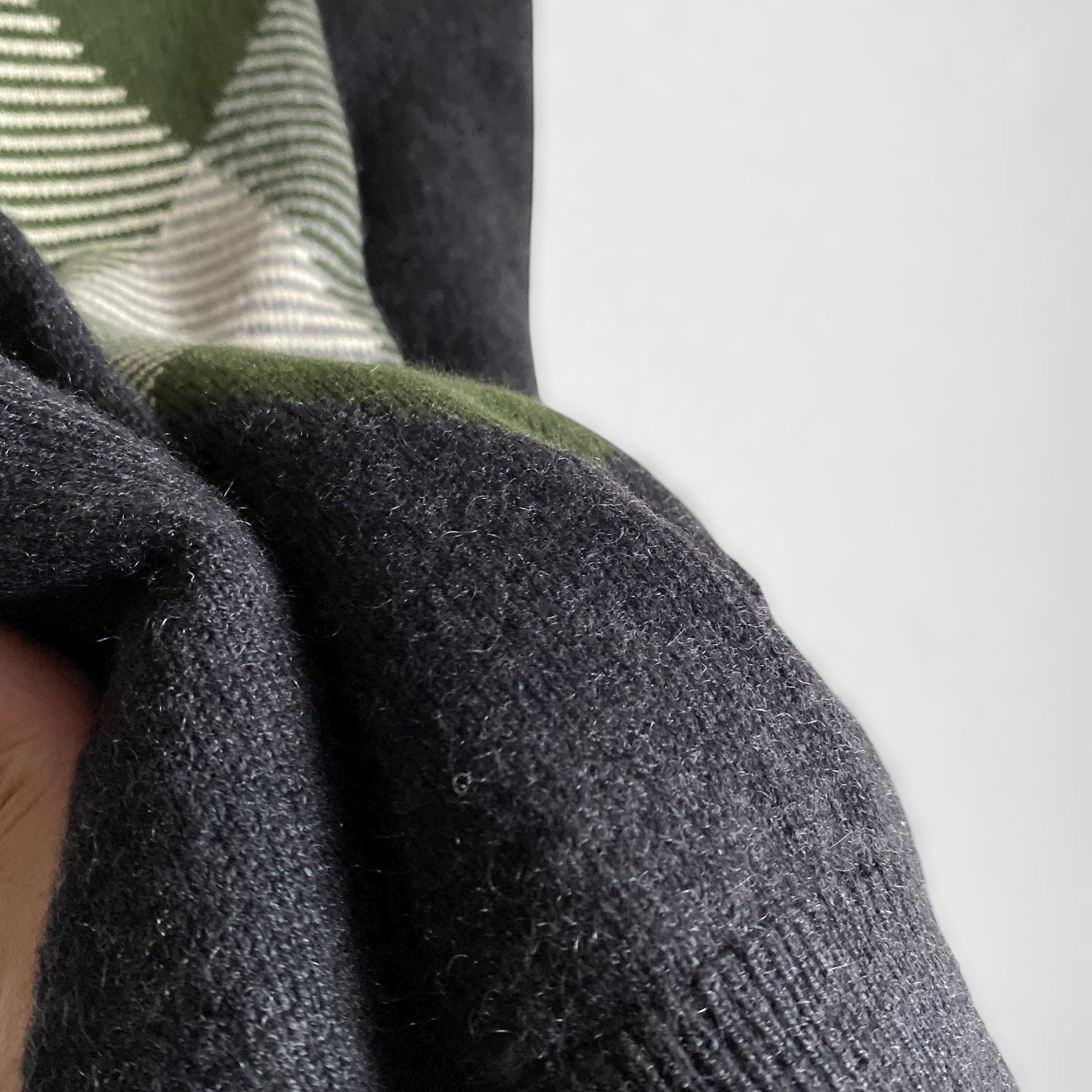 古いイギリス製カシミヤ特有の目の詰まったふわっと柔らかい極上の風合いに、チャコールグレー×薄めのエクリュをベースにした幾何学的なパターンが素晴らしい一着。