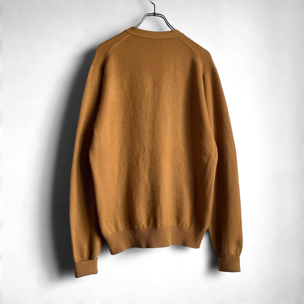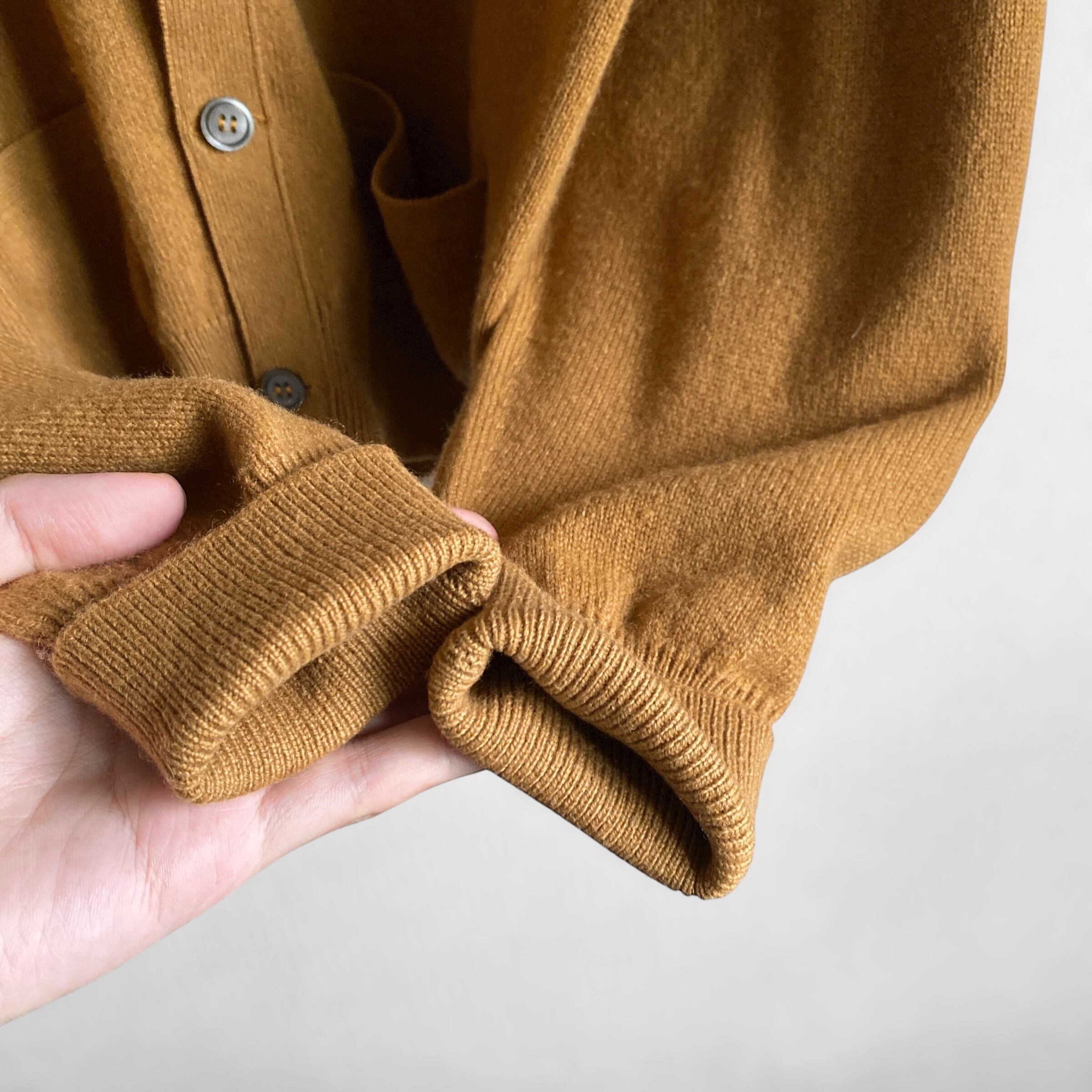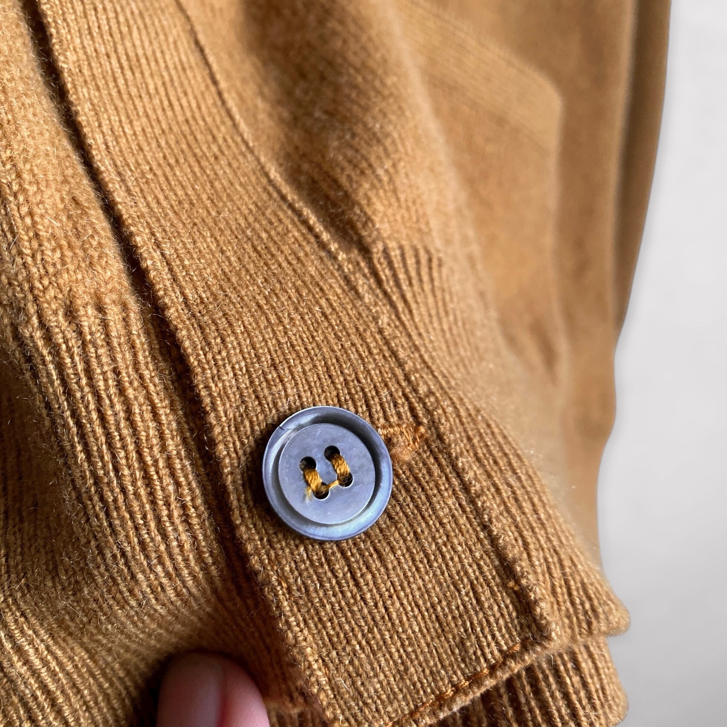 肉厚で柔らかくぎゅっと目の詰まった上質なカシミヤニットに、上品なキャメルブラウン系カラー、高級感のある黒蝶貝ボタン、アーム、身幅共に程よくゆとりのあるベーシックなサイズ感が非常に素晴らしい一着。