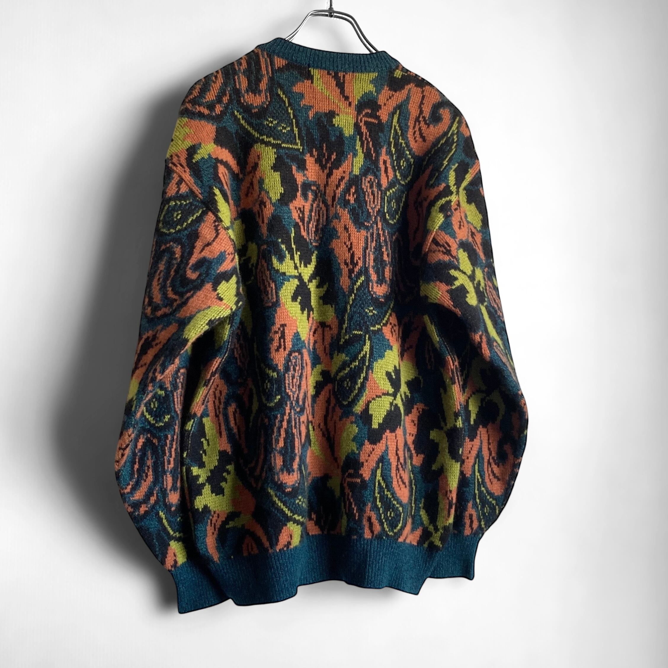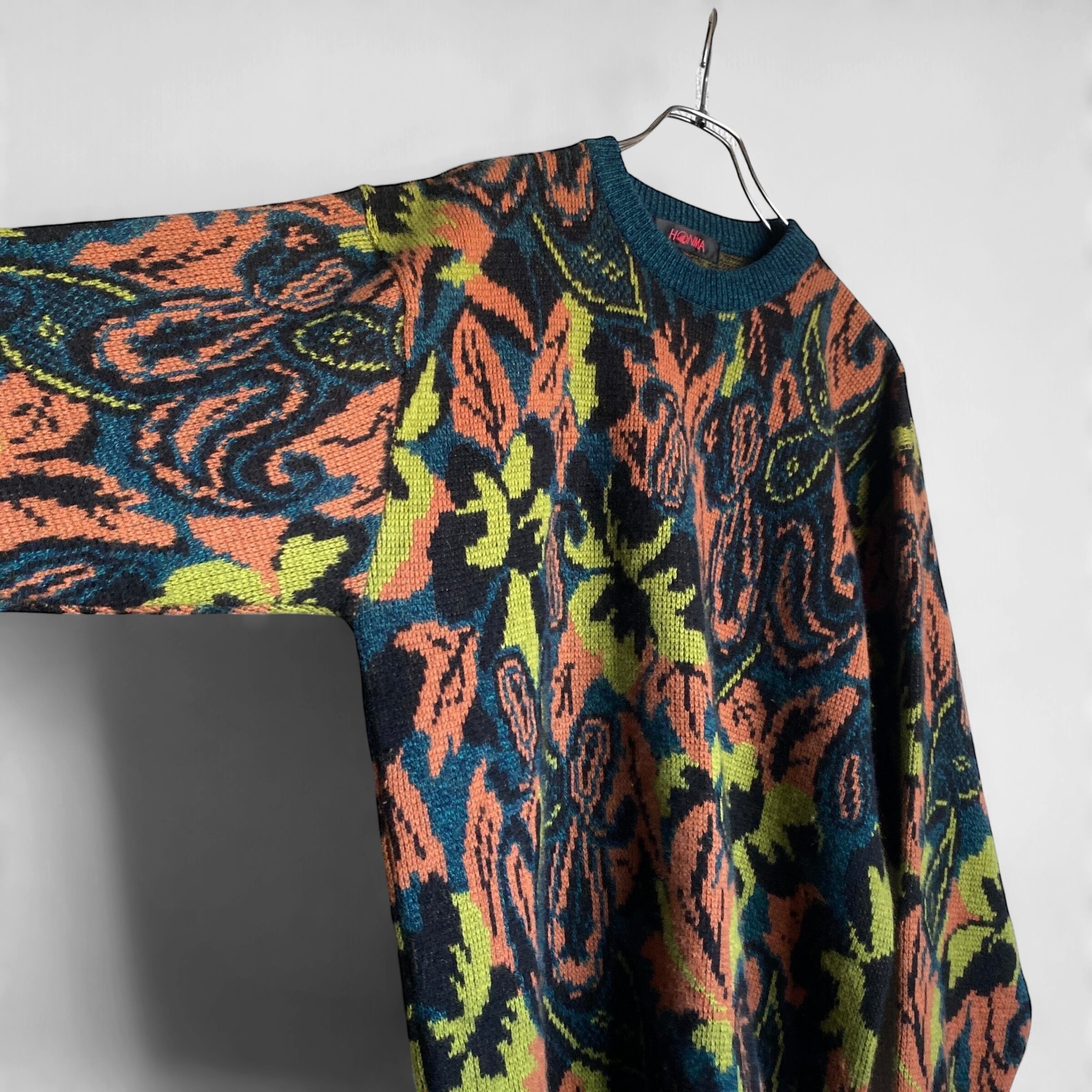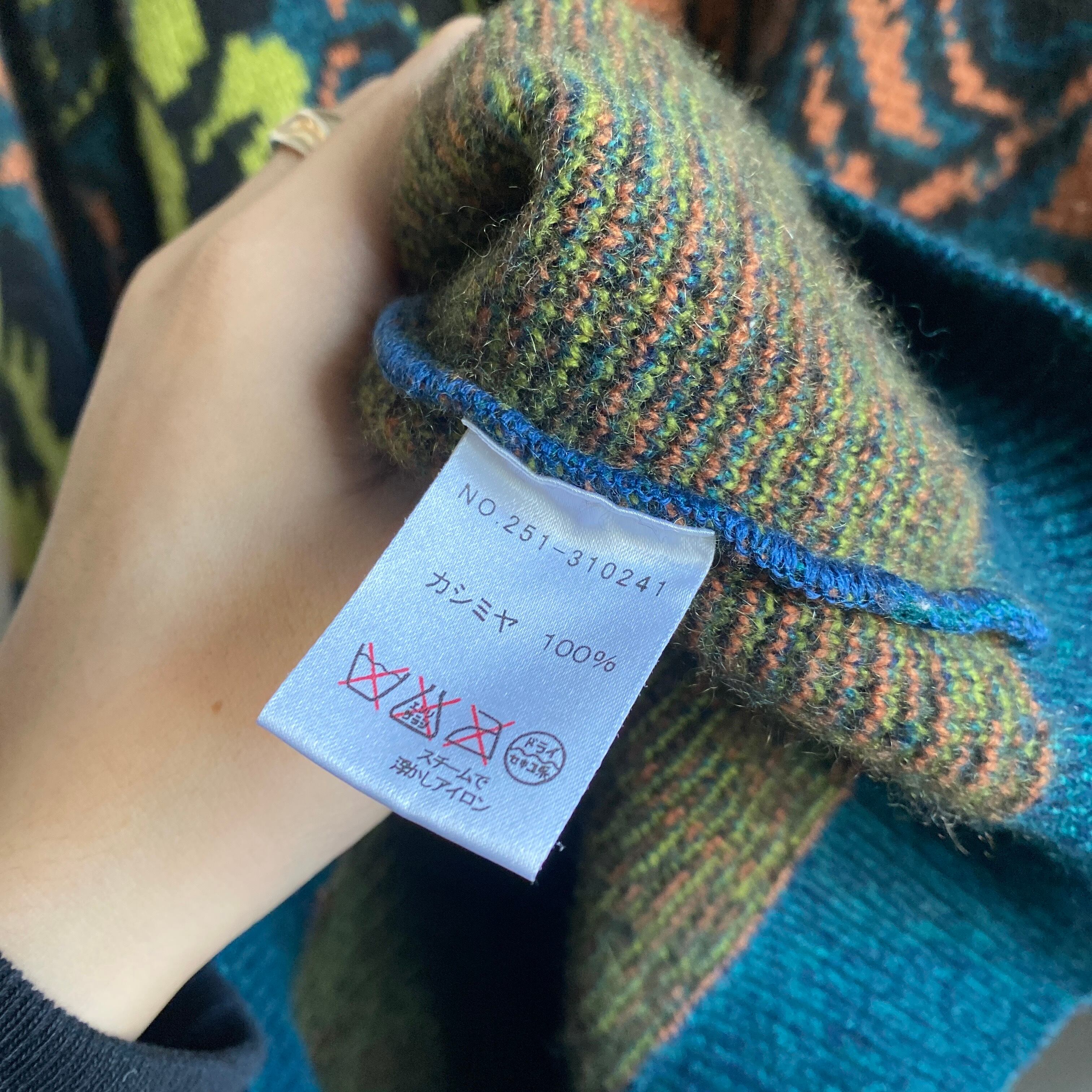 肉厚でモッチモチの極上カシミヤニットに、ペイズリー×フラワー?のサイケデリックなジャカード織の総柄、ゆったりとした丸みのあるボックスシルエットが非常に格好良い一着。
