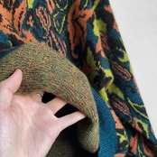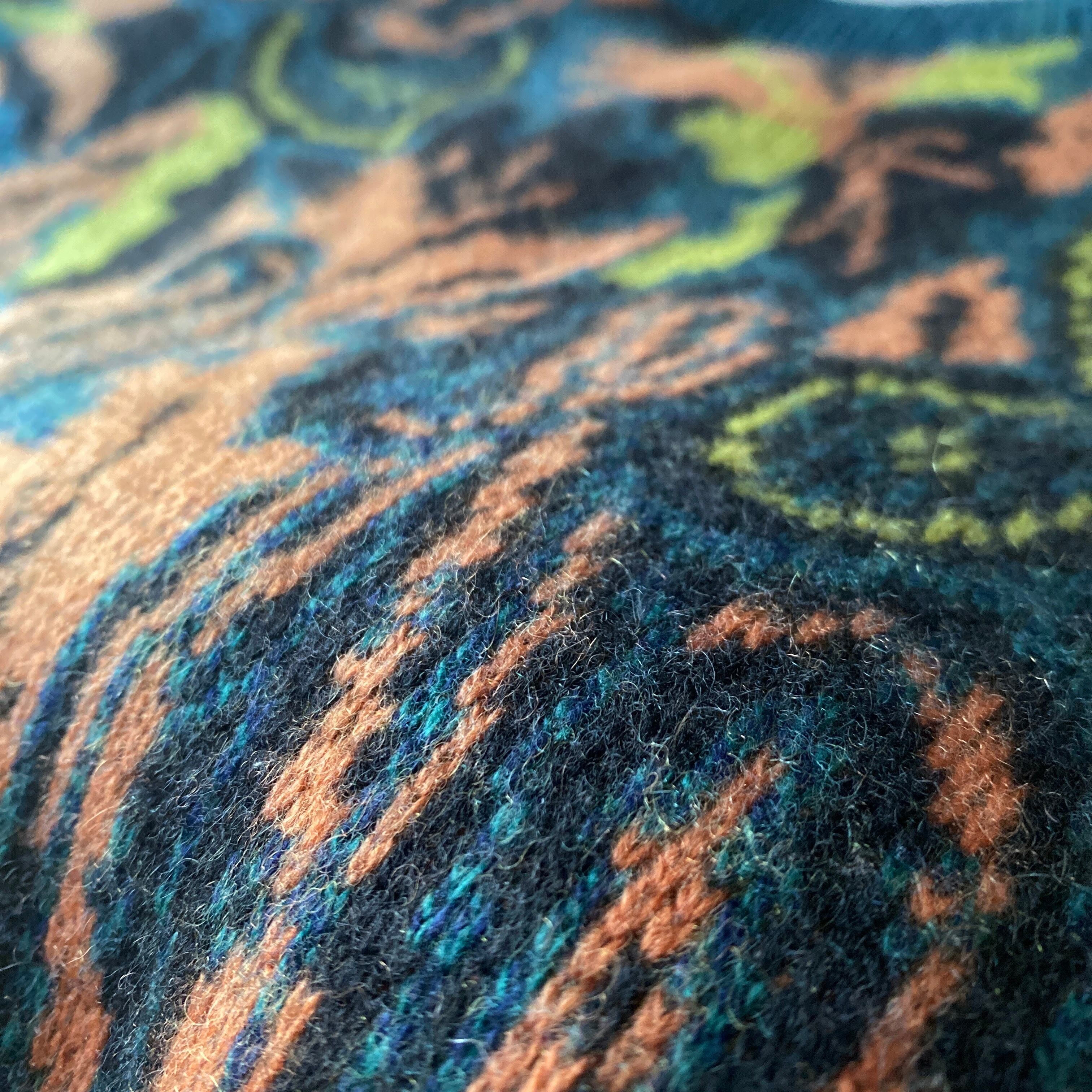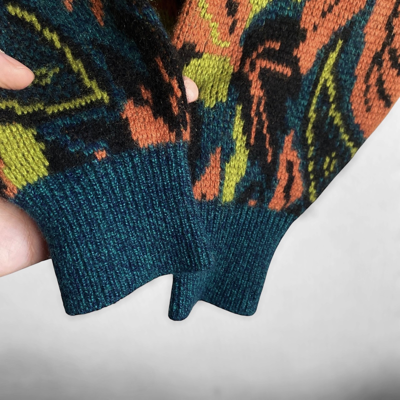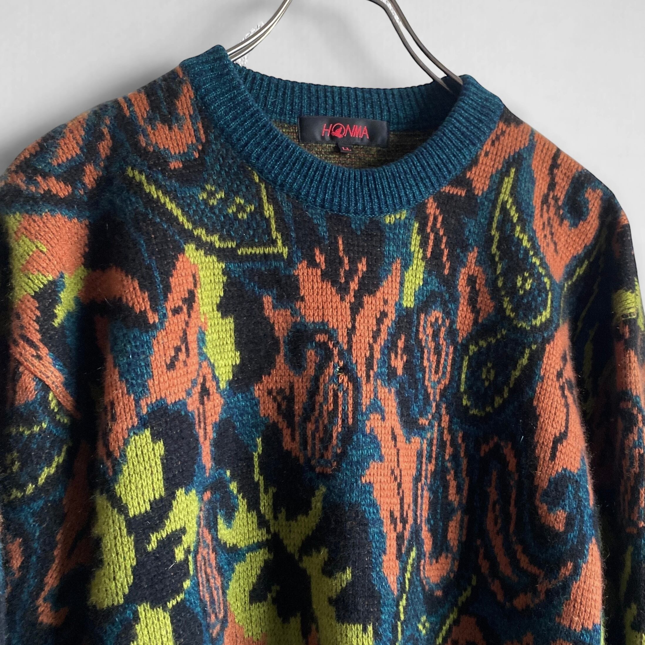 肉厚でモッチモチの極上カシミヤニットに、ペイズリー×フラワー?のサイケデリックなジャカード織の総柄、ゆったりとした丸みのあるボックスシルエットが非常に格好良い一着。