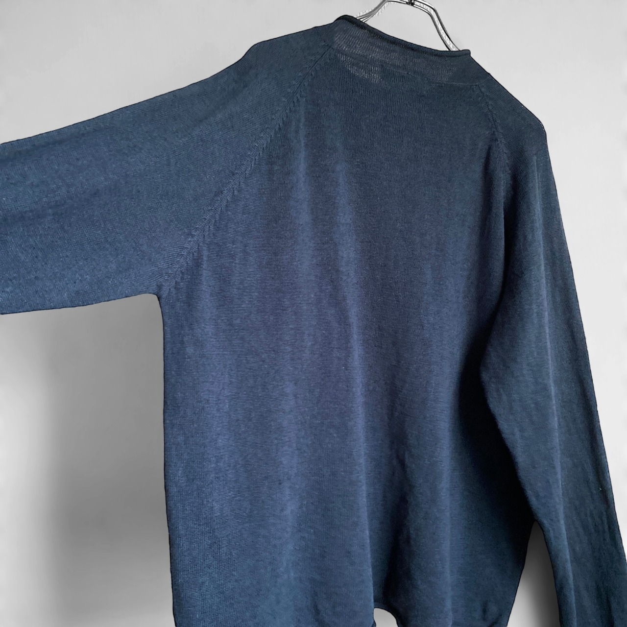 程よく肉厚で肌触りの良いコットンリネンのニット生地に、くすんだブルー系の綺麗な色目、ゆったりとしたボックスシルエットが非常に格好良い一着。