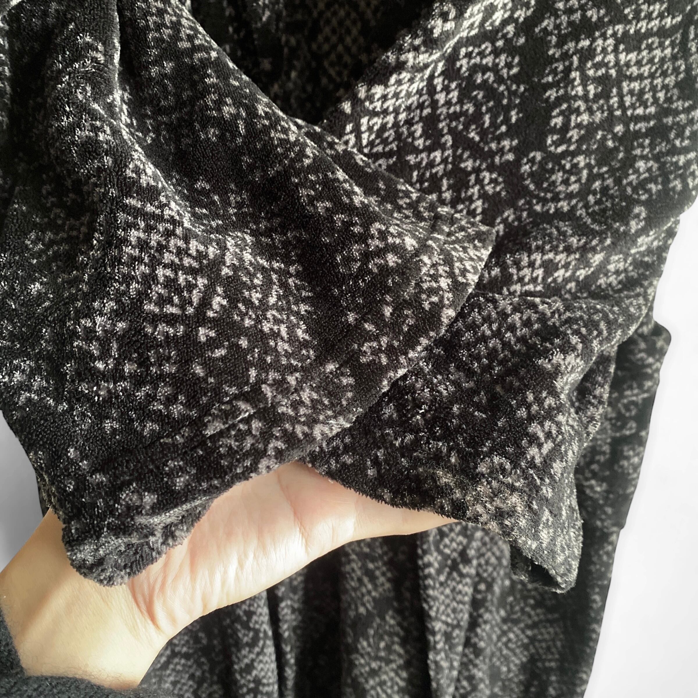 フカっと柔らかい表裏起毛のフリース生地に、ブラック×グレーのパイソン柄、ゆったりとしたオーバーサイズシルエットが非常に格好良い一着。