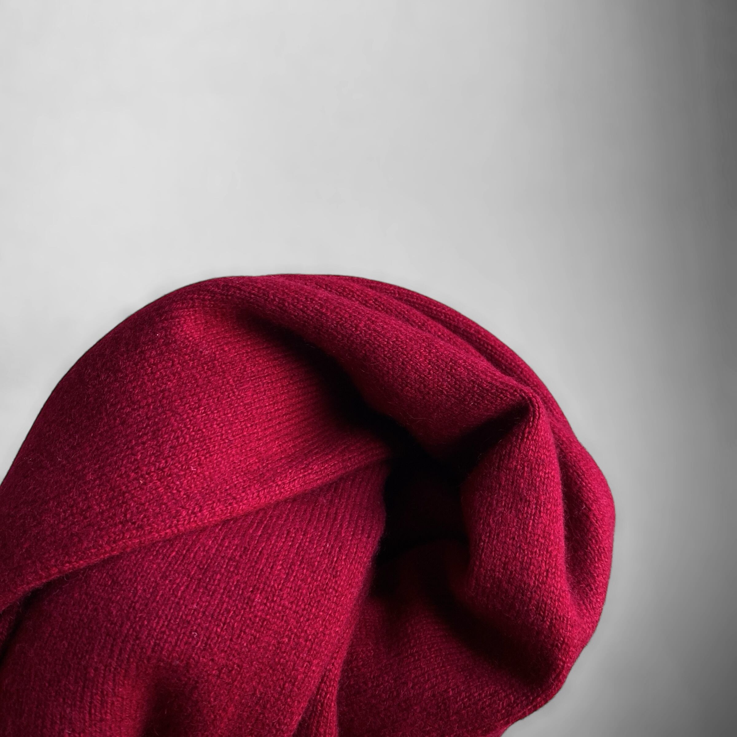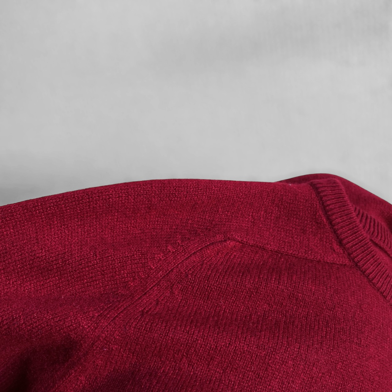 肉厚でもちっとした極上のカシミヤ生地に、ボルドーまで行かない深みのあるやや黒々とした赤(画像6が近いと思います)の色目が非常に素晴らしい一着。