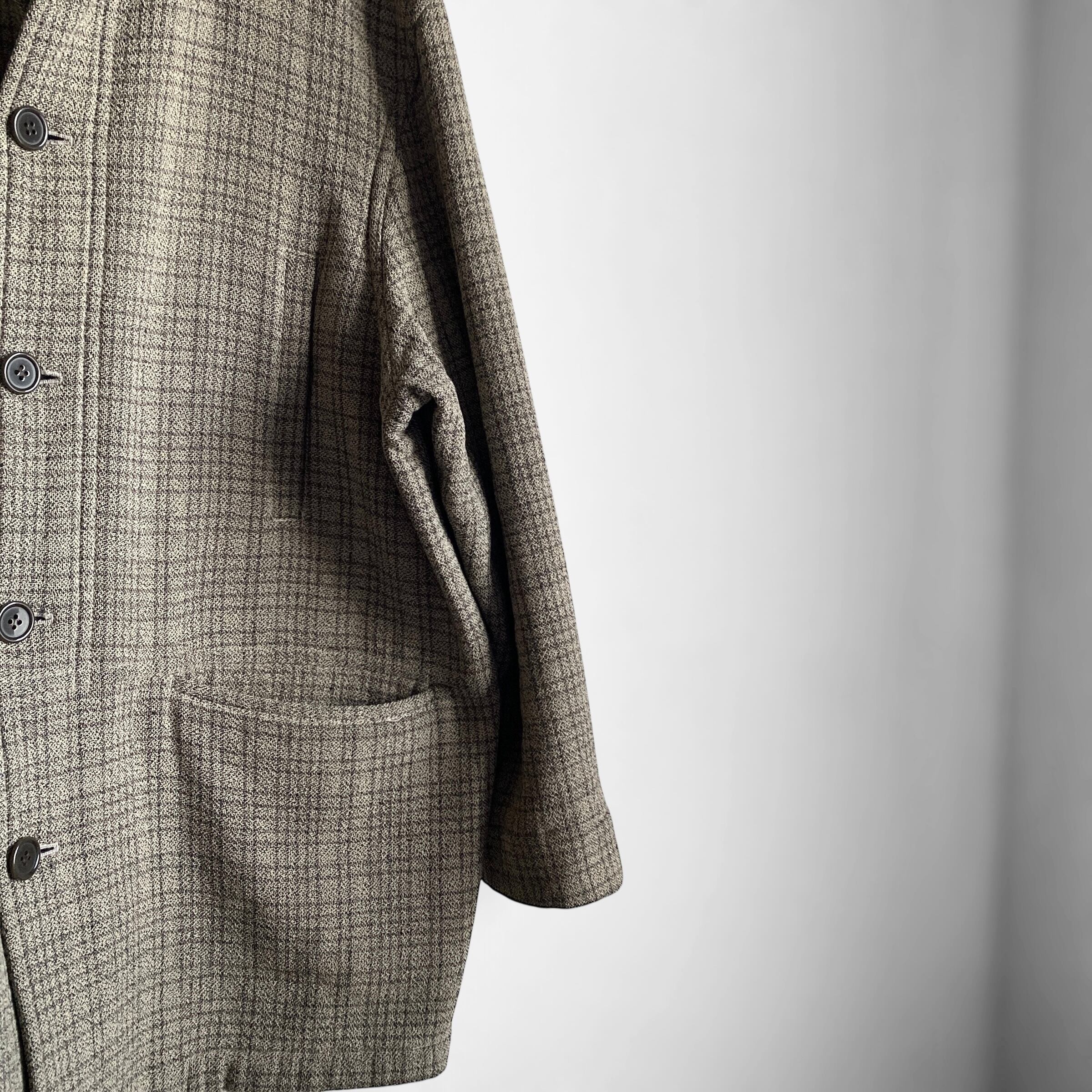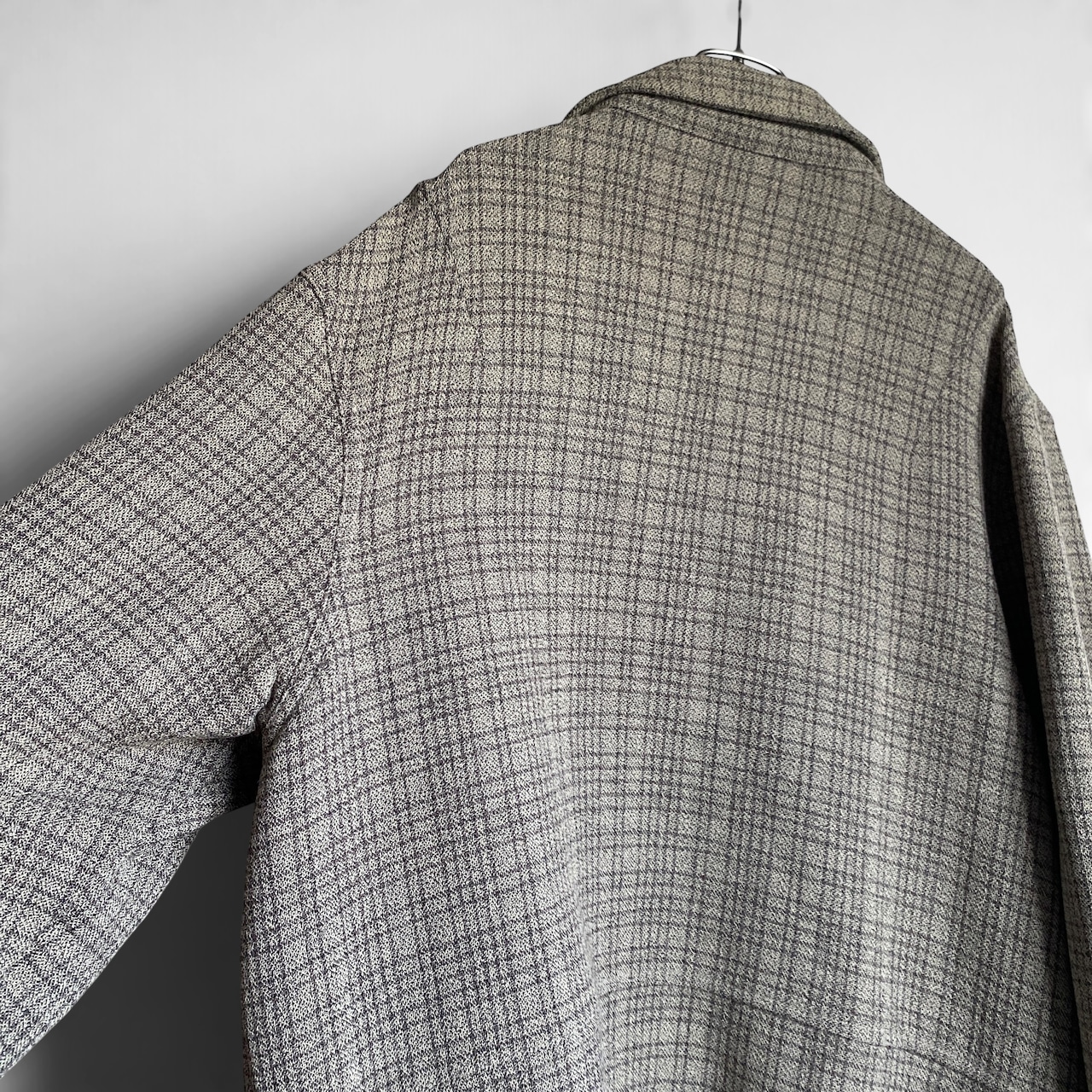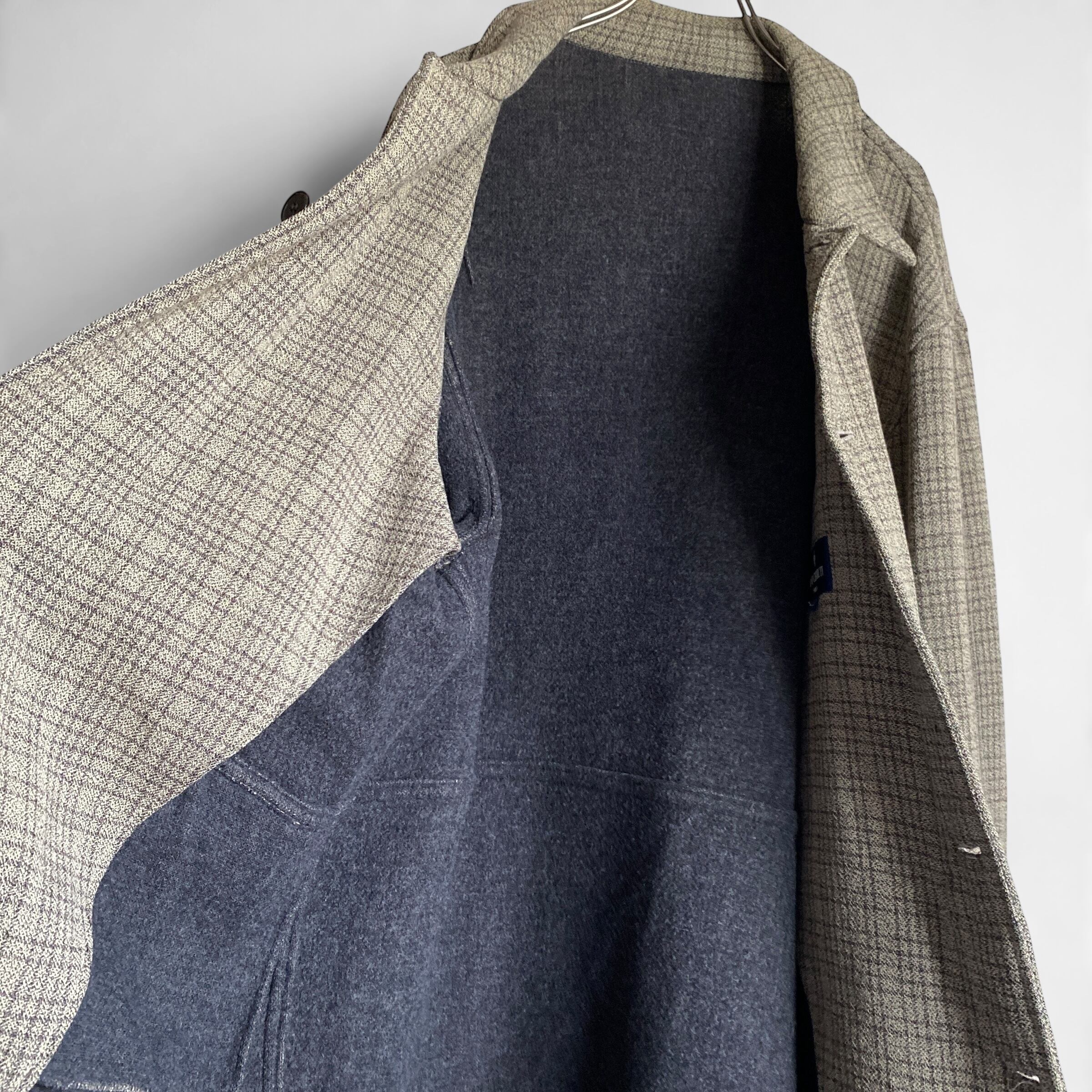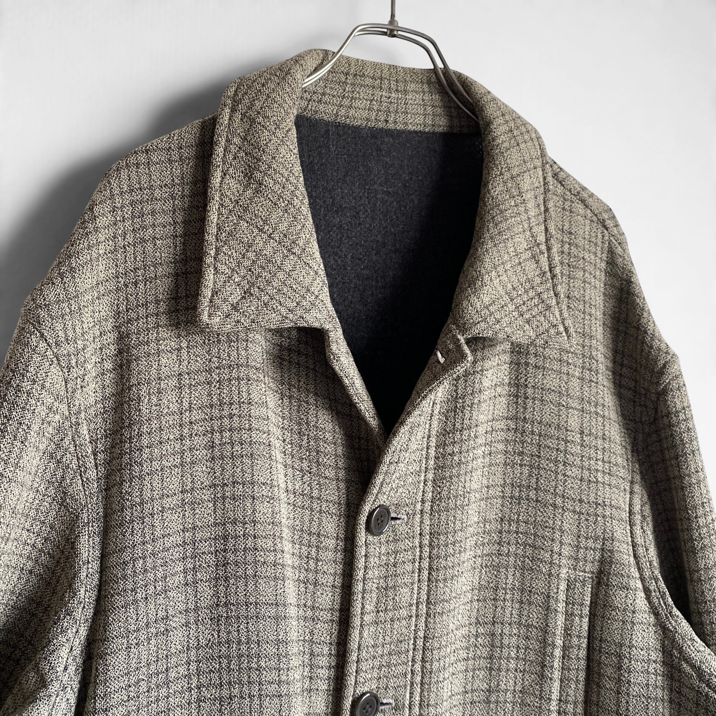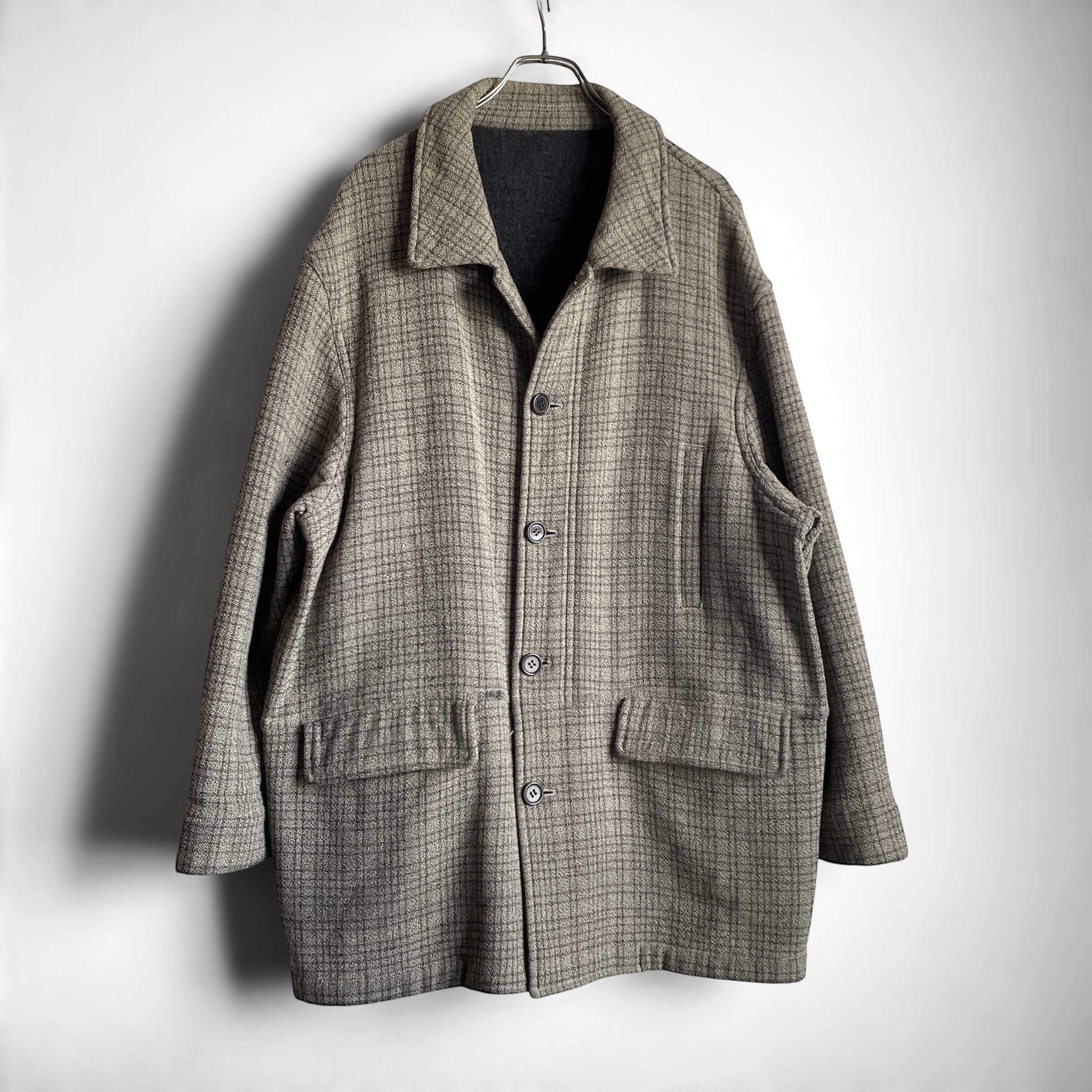 肉厚でモチっとしたニットのような平織りのウール地に、グレー系ベースで枯れた雰囲気の綺麗な格子柄、ゆったりと丸みのあるオーバーサイズシルエットが非常に格好良い一着。