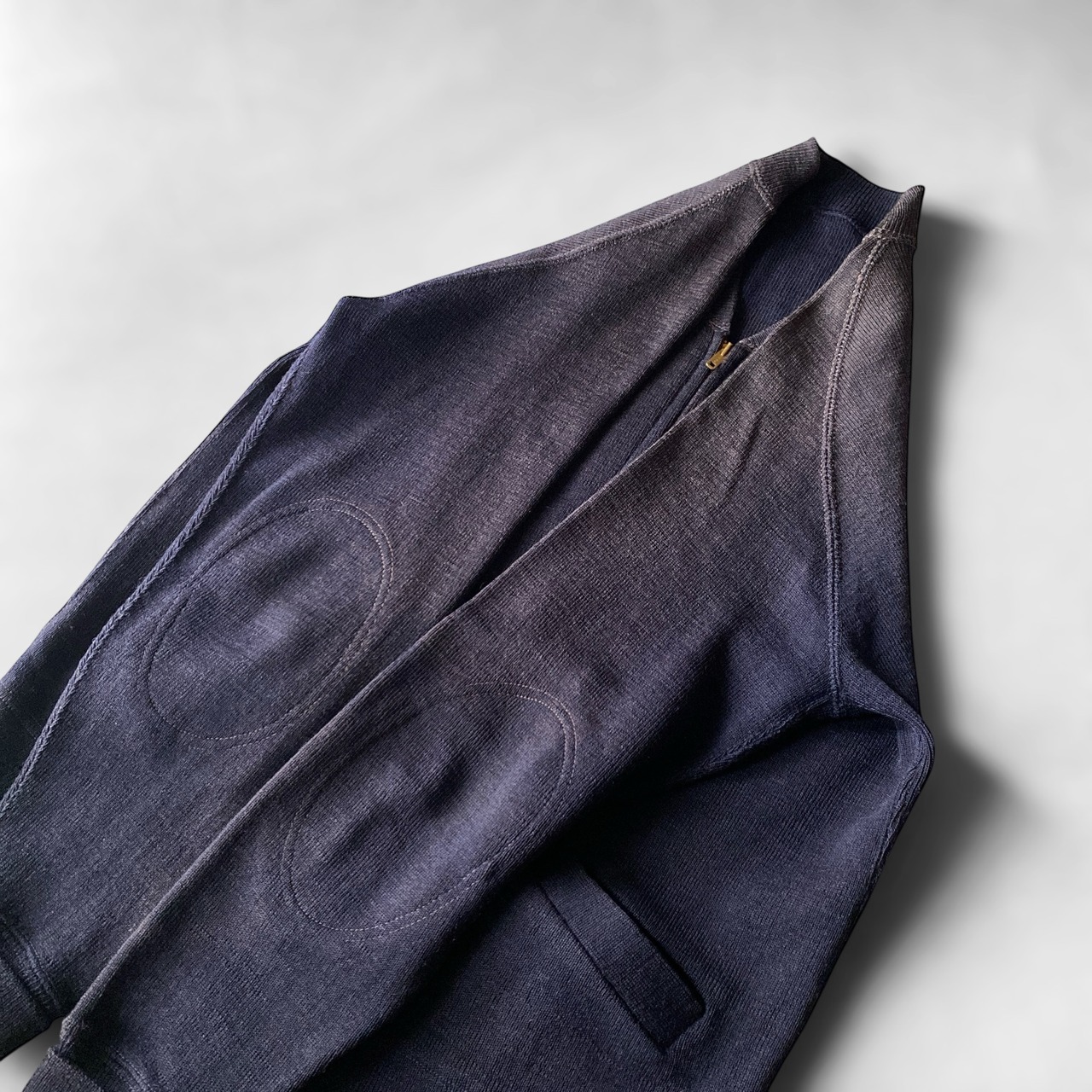 レアなダークネイビーの単色カラーに、サンフェードやアタリによる芸術的な濃淡、シャリ感のある目の詰まったウール素材、真鍮の棒TALONジップ、フリーダムスリーブ、裏当てのエルボーパッチと見所が盛りだくさんの素晴らしい一着。
