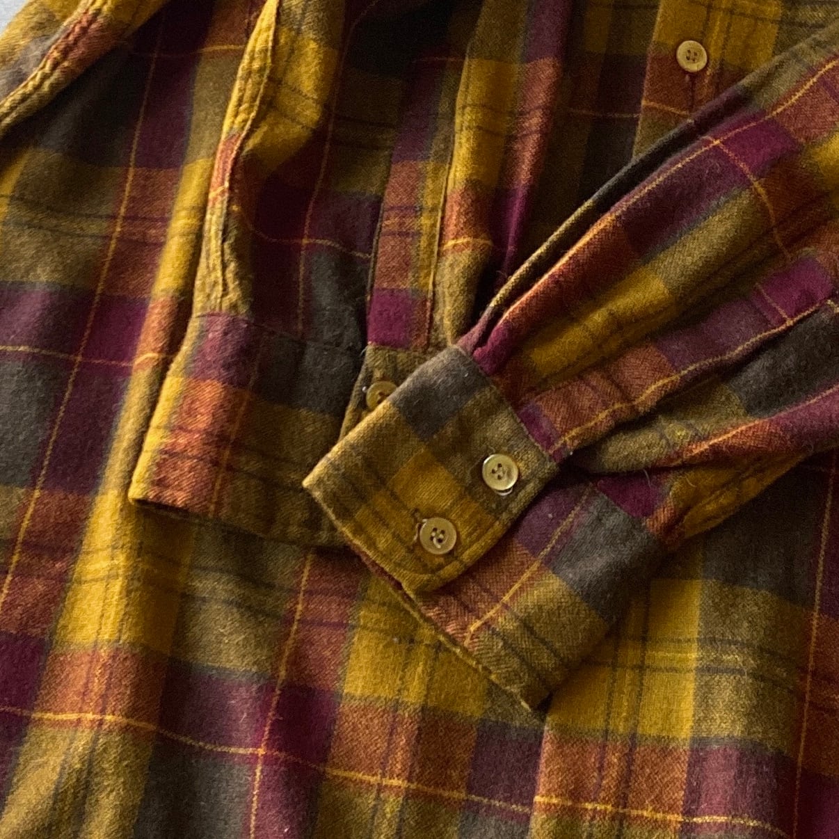 程よく肉厚でサラッとした上質なウールベースの生地に、マスタード×ベリー×モカブラウンの上品な好配色チェック、ゆったりとした丸みのあるボックスシルエットが素晴らしい一着。