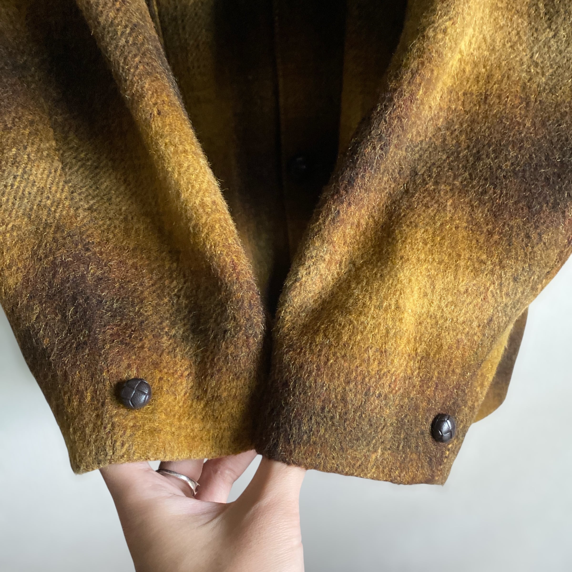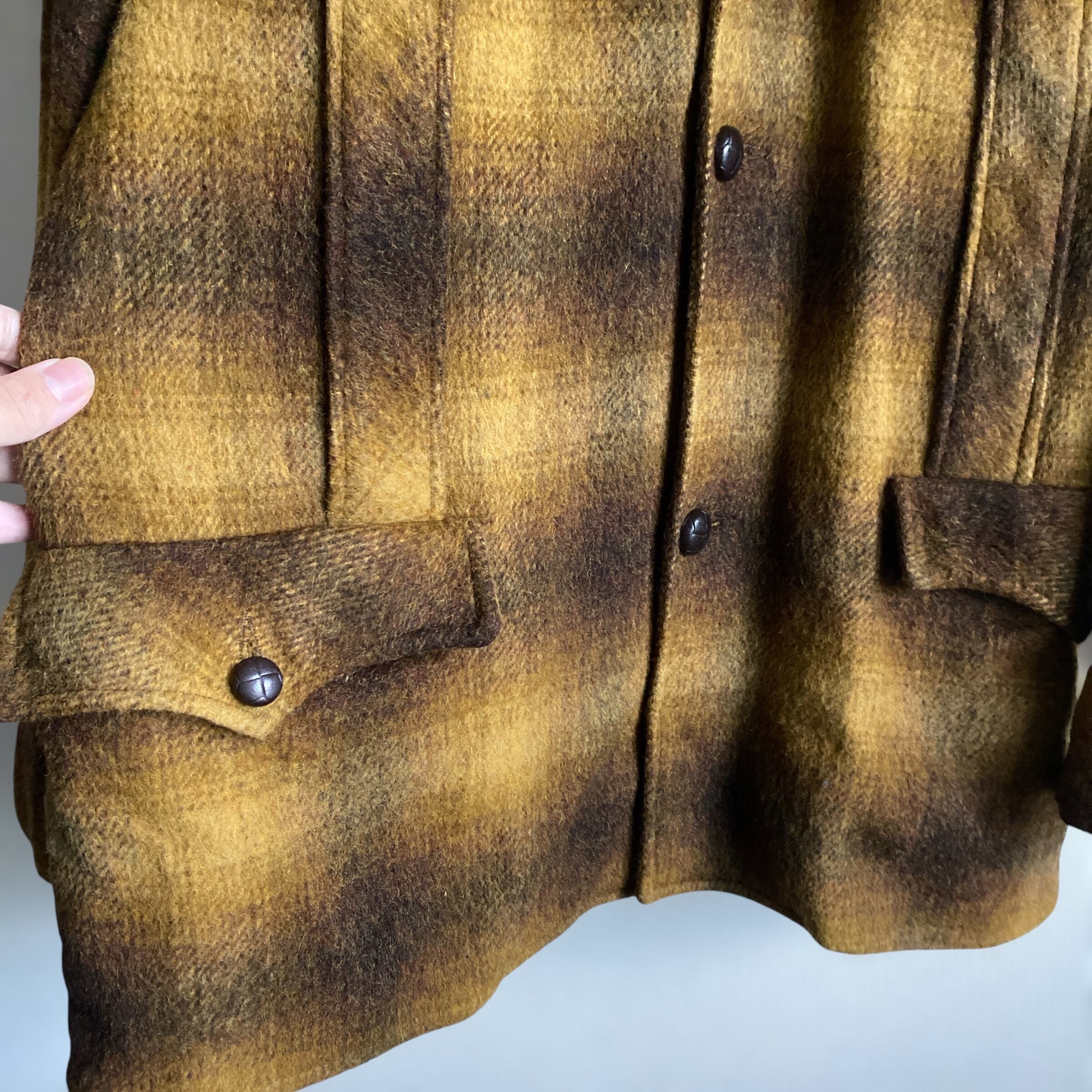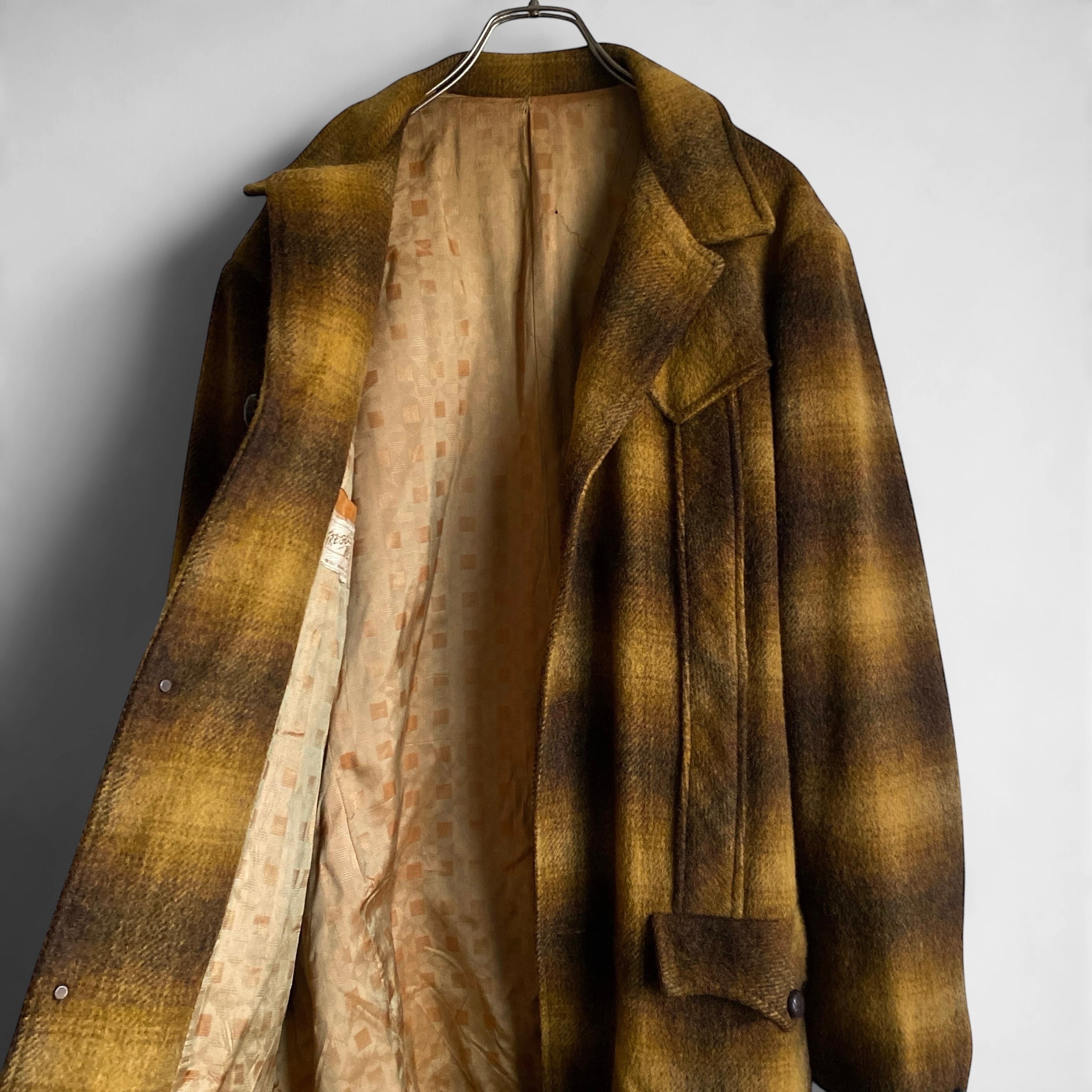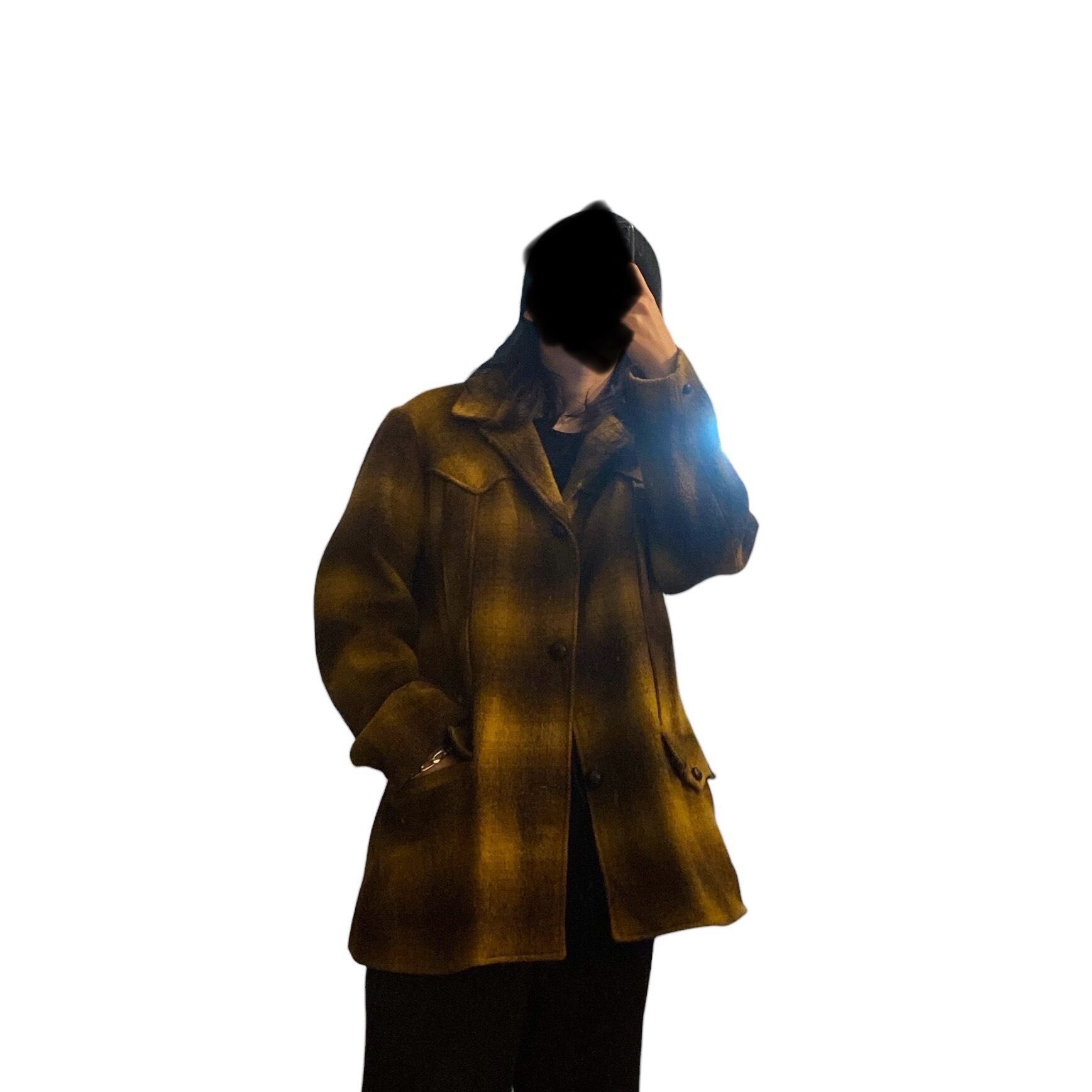 非常に綺麗な配色のオンブレチェック柄に、肉厚でやや毛足の長いウール素材、ハーフ丈のコートのようなジャケットのようなスタイルが非常に格好良い一着。