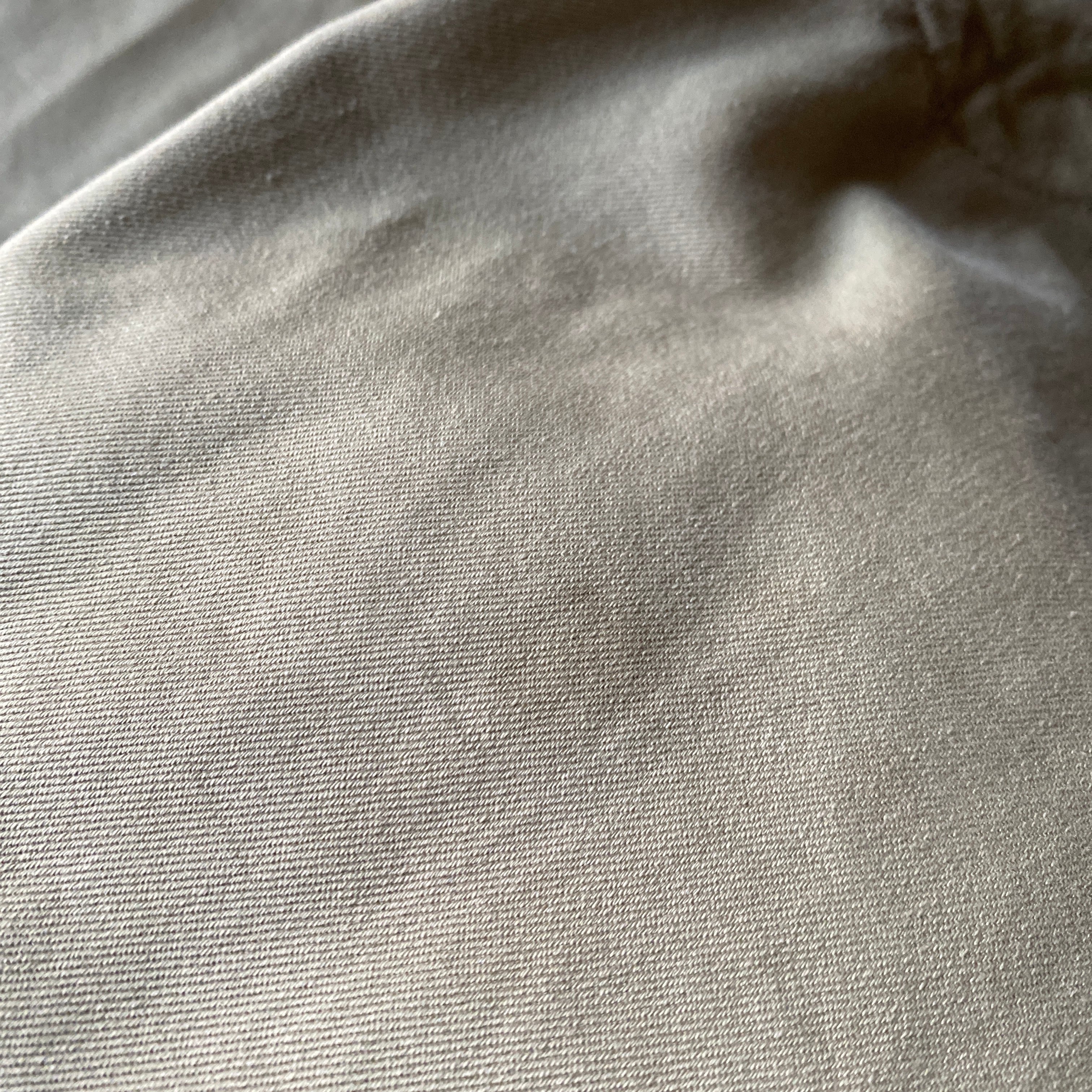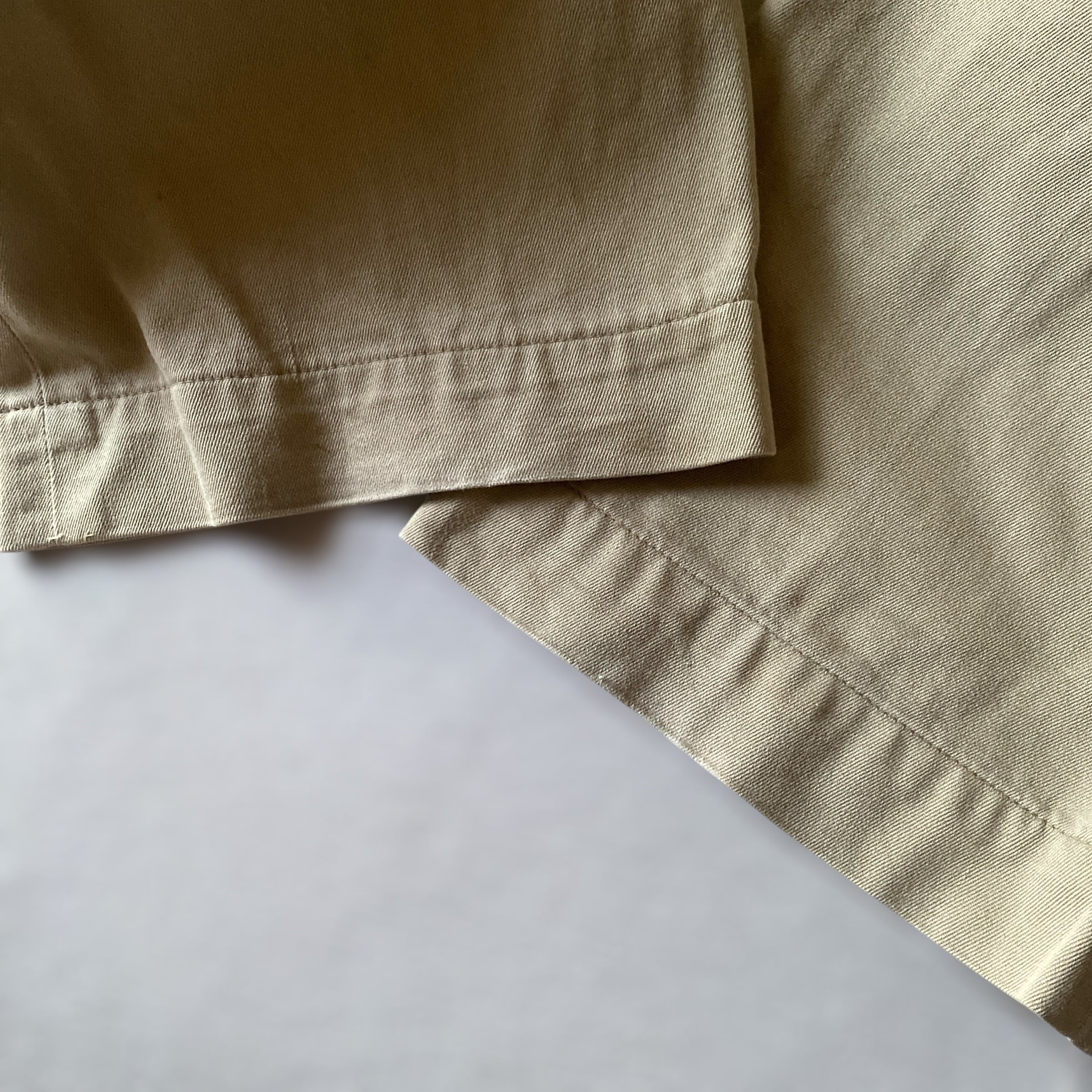程よく肉厚で目の詰まったコットンツイルの質感、ストンと落ちる太めのストレートシルエットが非常に格好良い一着。